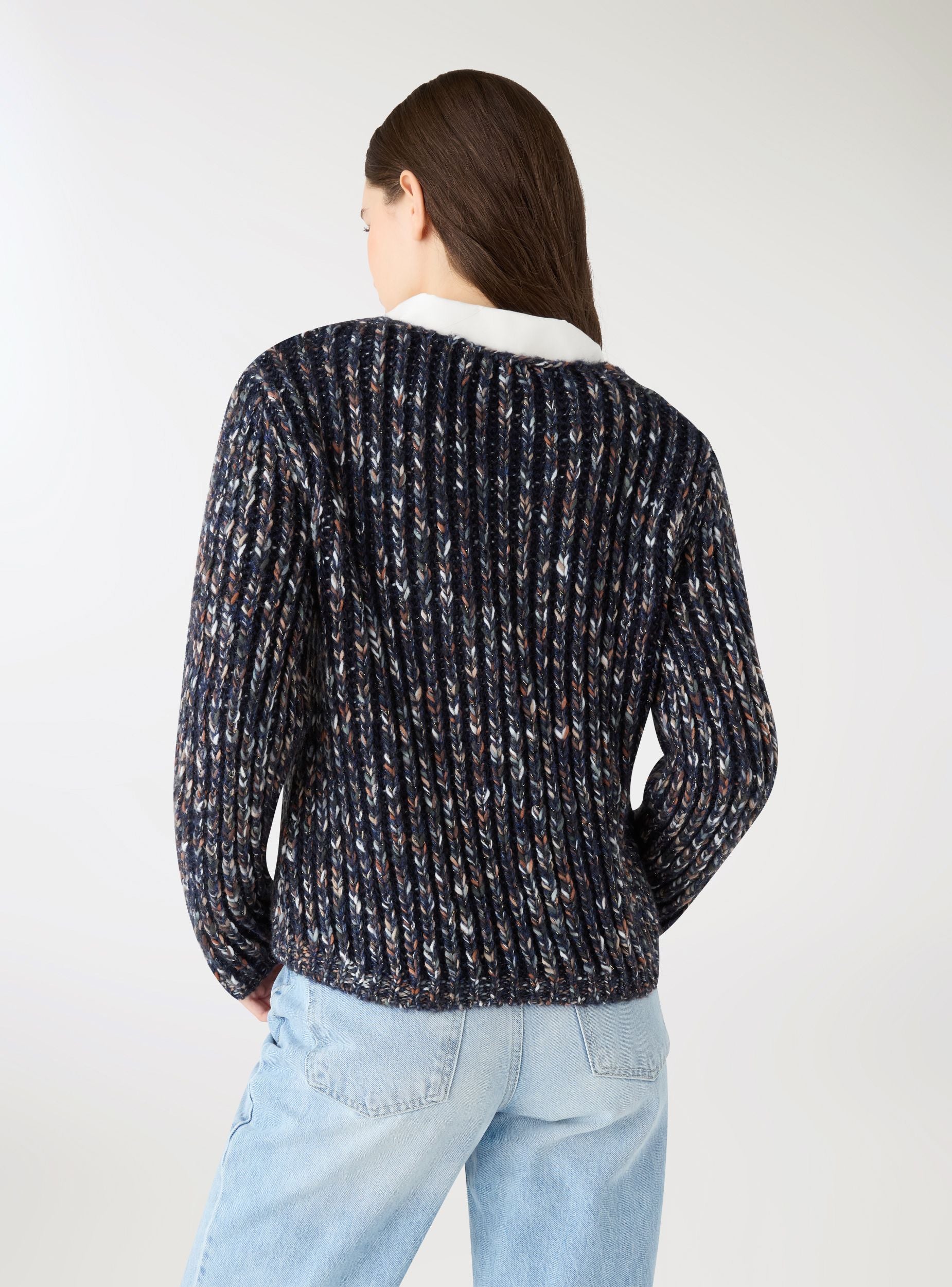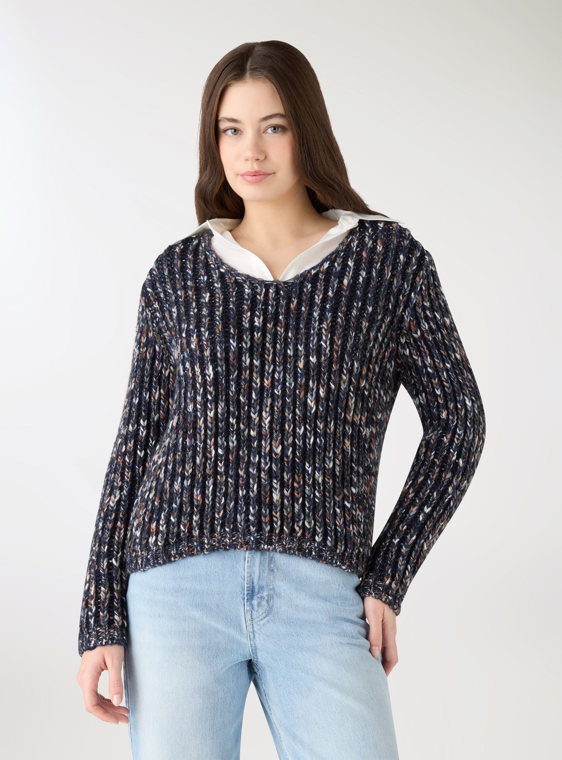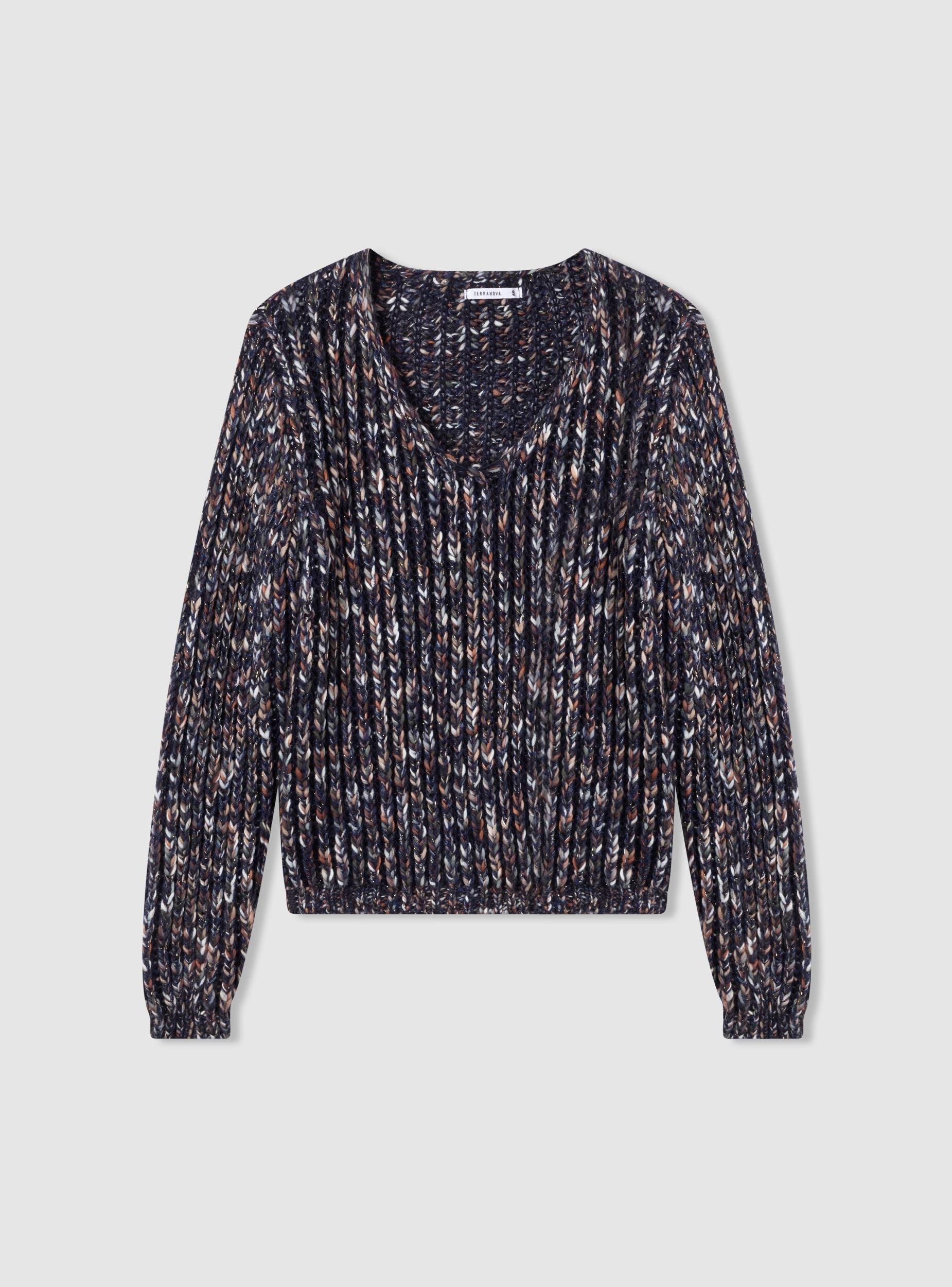 Maglia da donna a coste, dal look multicolor con effetto luccicante. Presenta scollo a V e maniche lunghe, con bordo elastico su polsi e fondo. Perfetta per outfit casual con jeans o pantaloni a vita alta, ideale anche per serate informali. Vestibilità regular che valorizza la silhouette, facile da abbinare a camicie o top.Dettagli