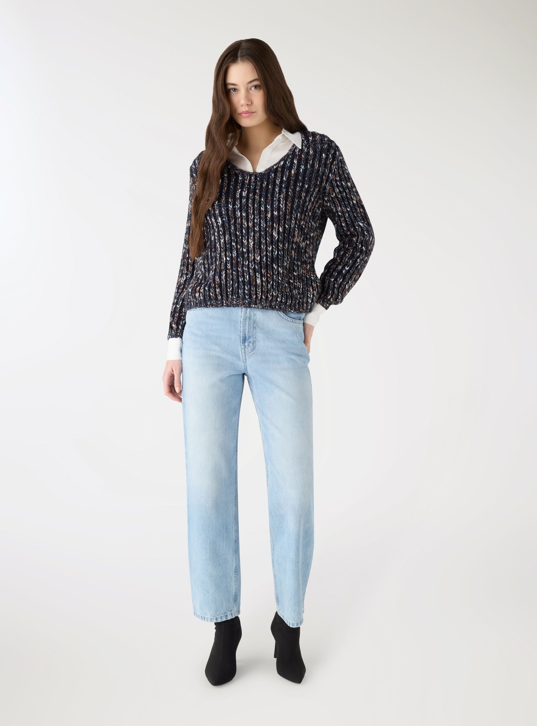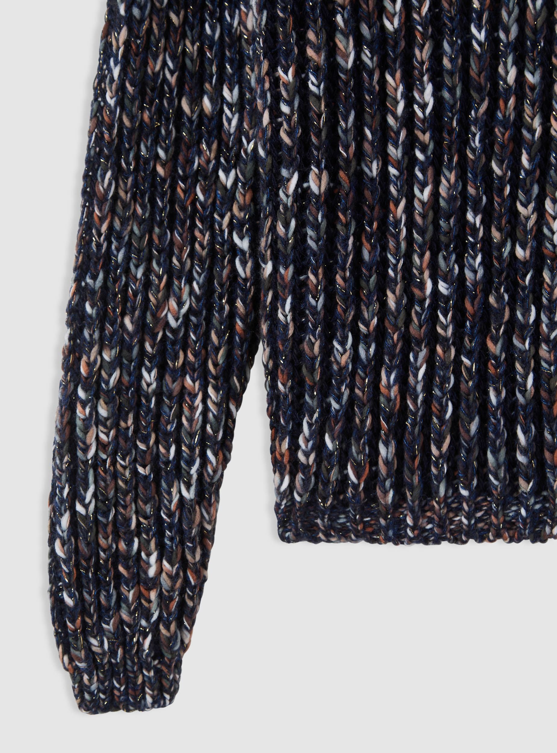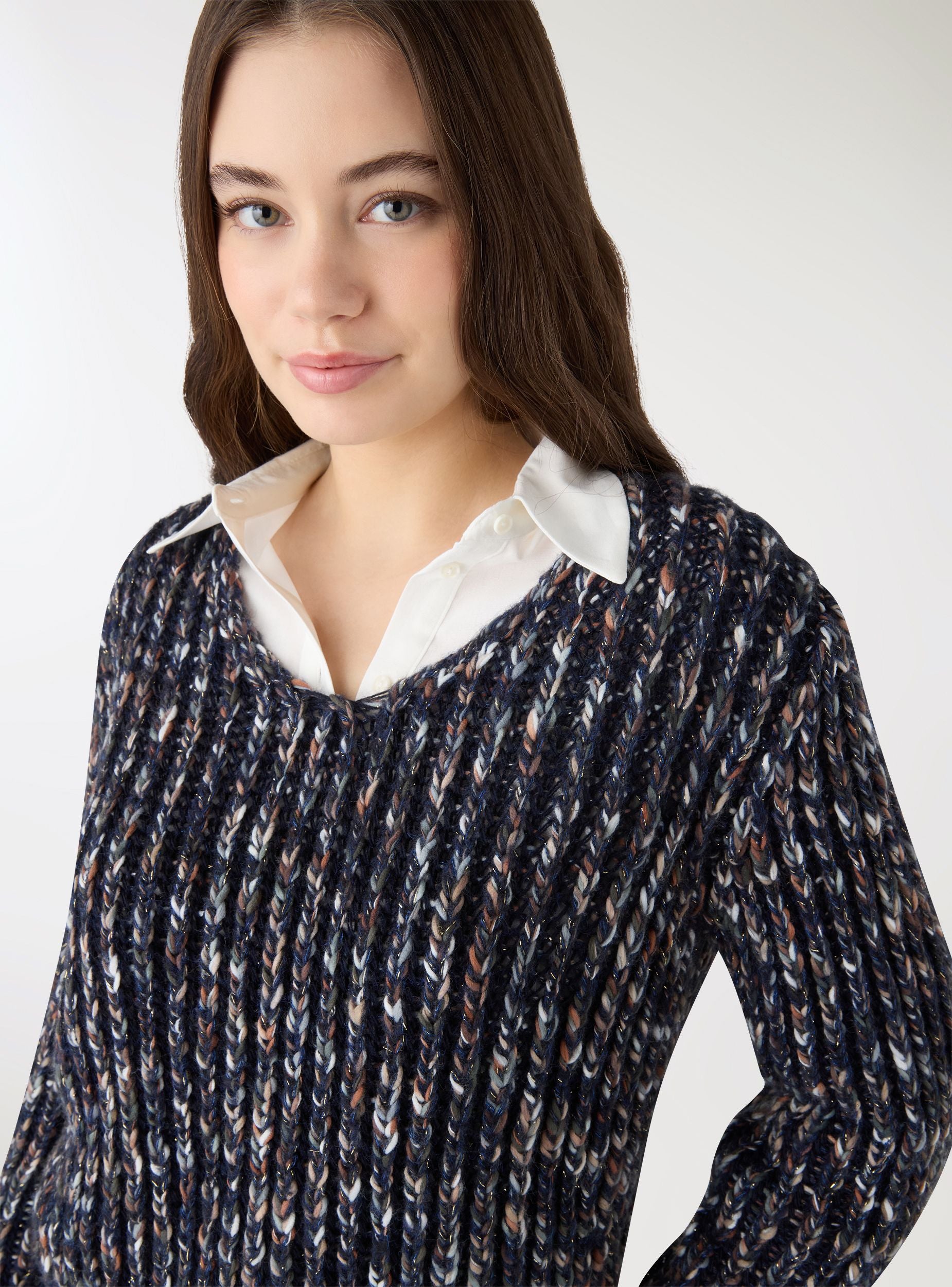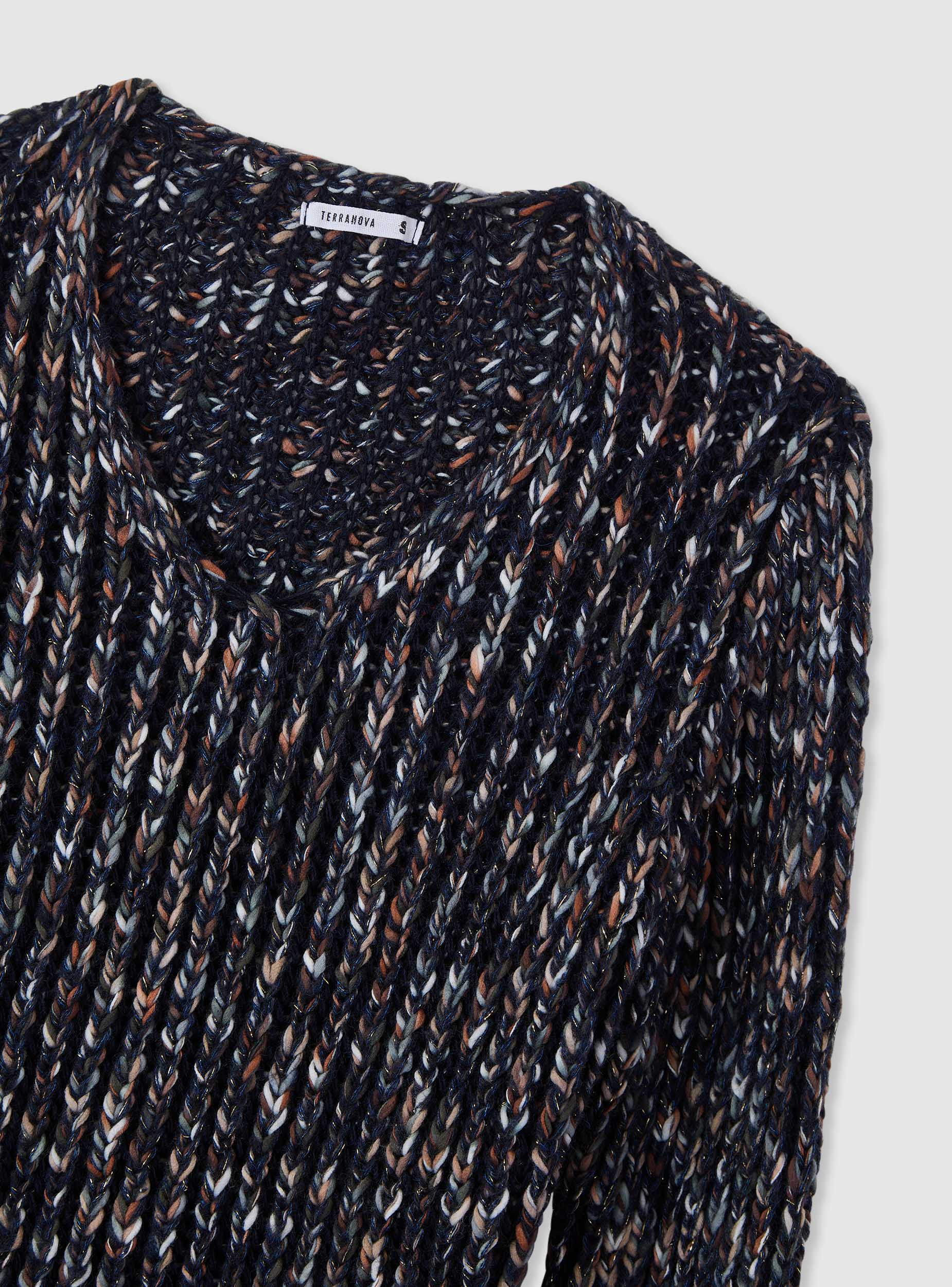 Maglia da donna a coste, dal look multicolor con effetto luccicante. Presenta scollo a V e maniche lunghe, con bordo elastico su polsi e fondo. Perfetta per outfit casual con jeans o pantaloni a vita alta, ideale anche per serate informali. Vestibilità regular che valorizza la silhouette, facile da abbinare a camicie o top.Dettagli