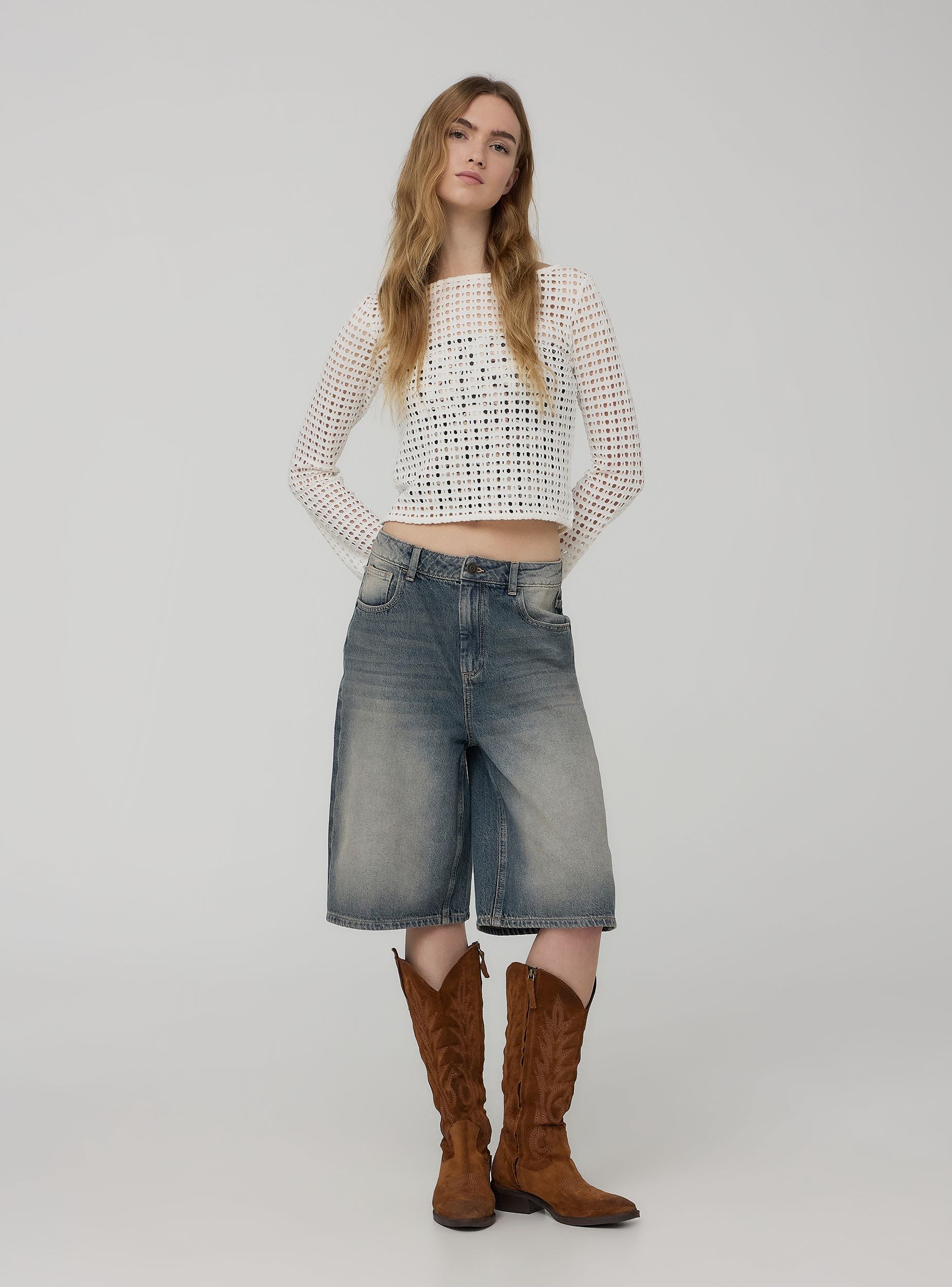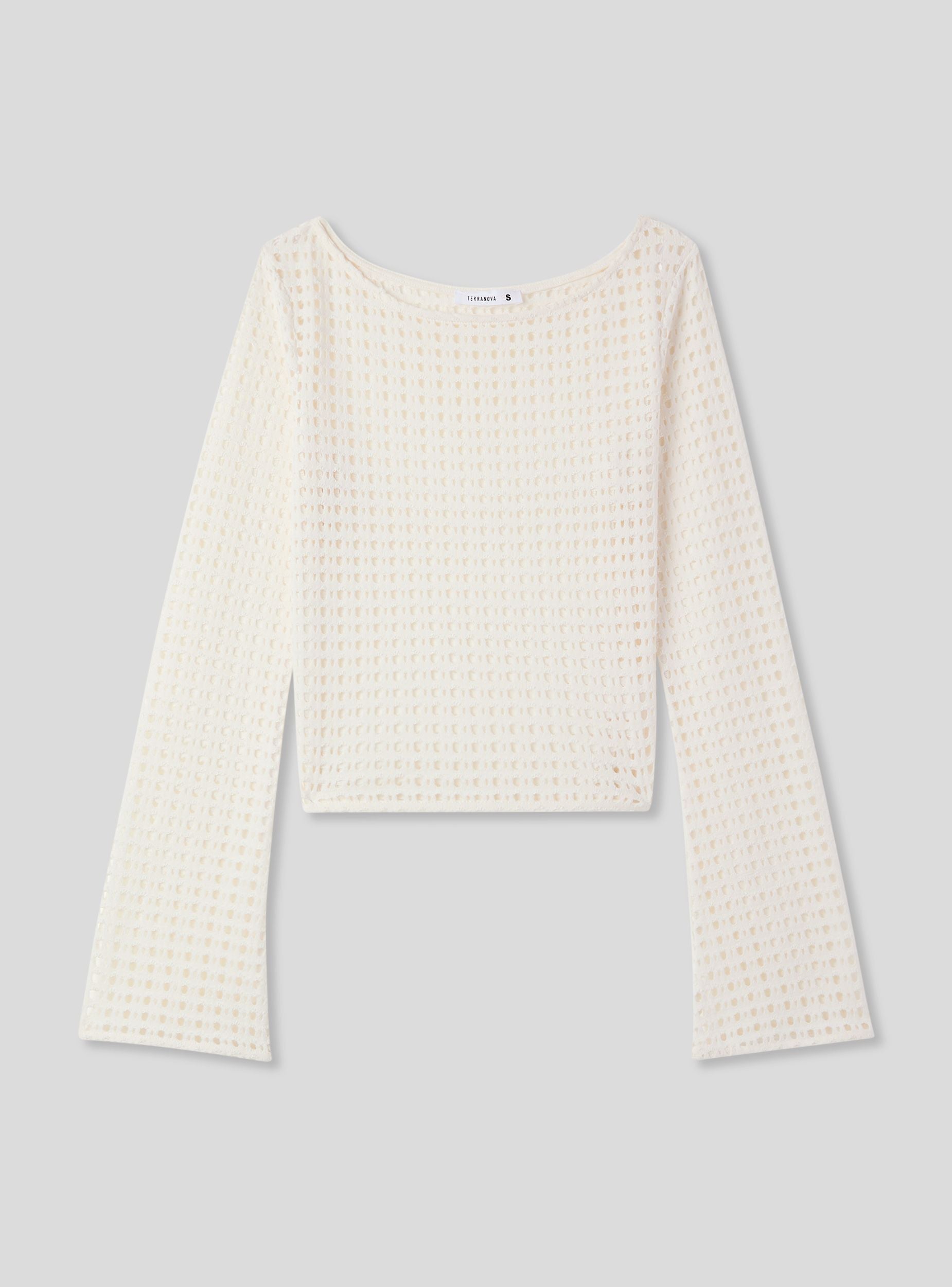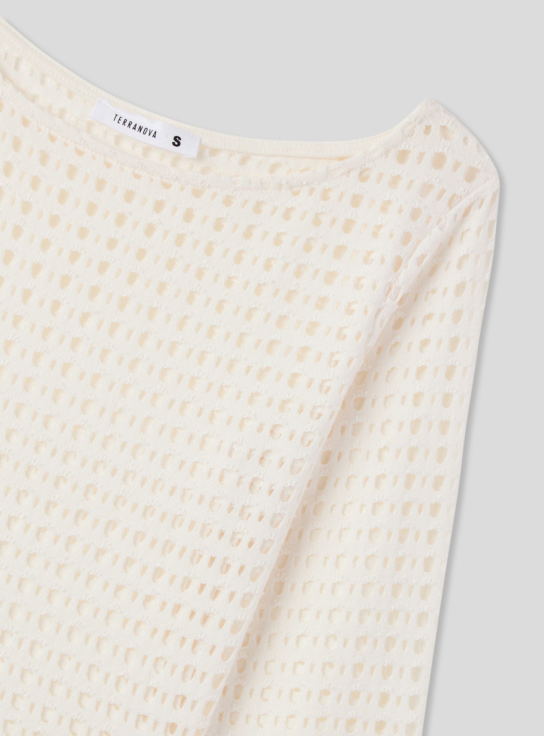 Maglia da donna dallo stile moderno e accattivante, caratterizzata da una trama traforata a rete che aggiunge un tocco di originalità al look. Questo capo a tinta unita è pensato come un must-have per completare outfit di tendenza. Dotata di maniche lunghe e scollo ampio, questa maglia è perfetta per chi cerca un pezzo versatile e distintivo. La texture traforata rende il capo leggero e ideale per abbinamenti casual o per look più ricercati, mantenendo sempre uno stile raffinato e contemporaneo.Dettagli