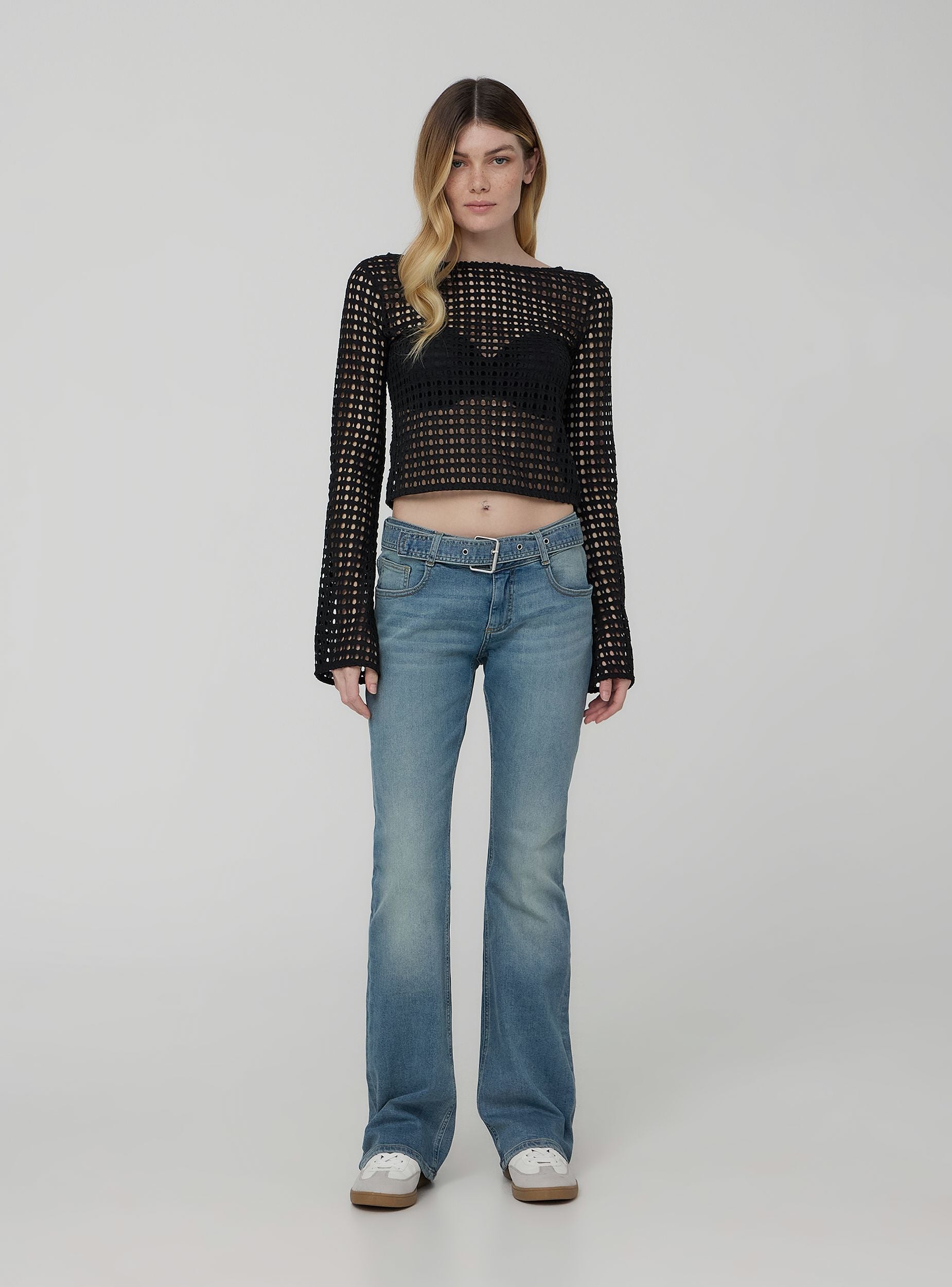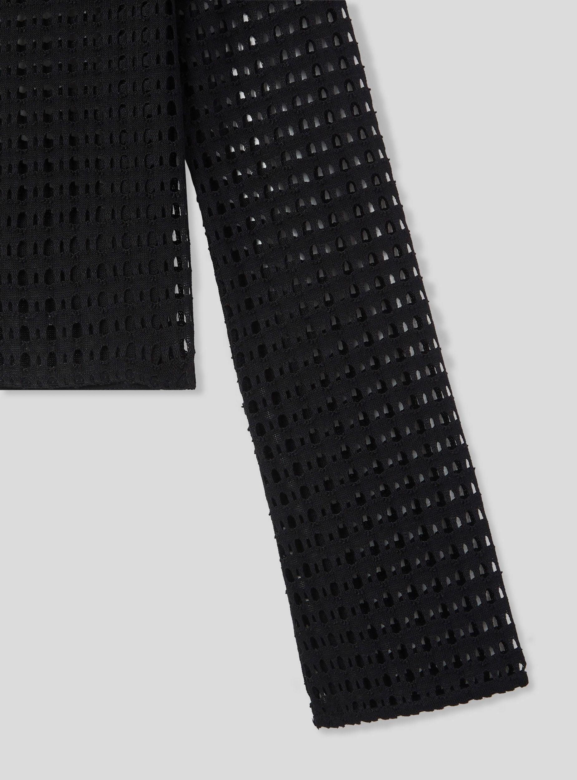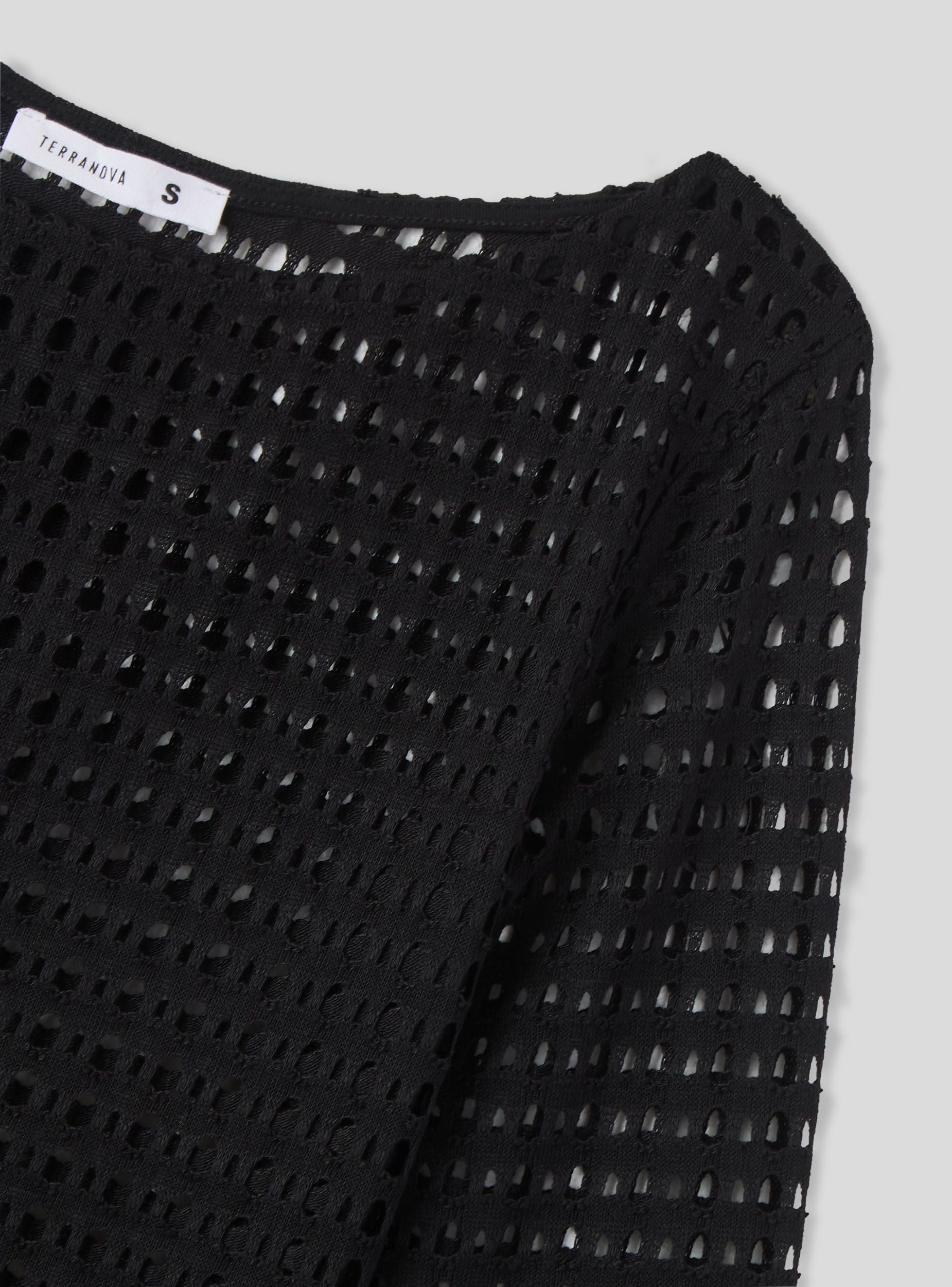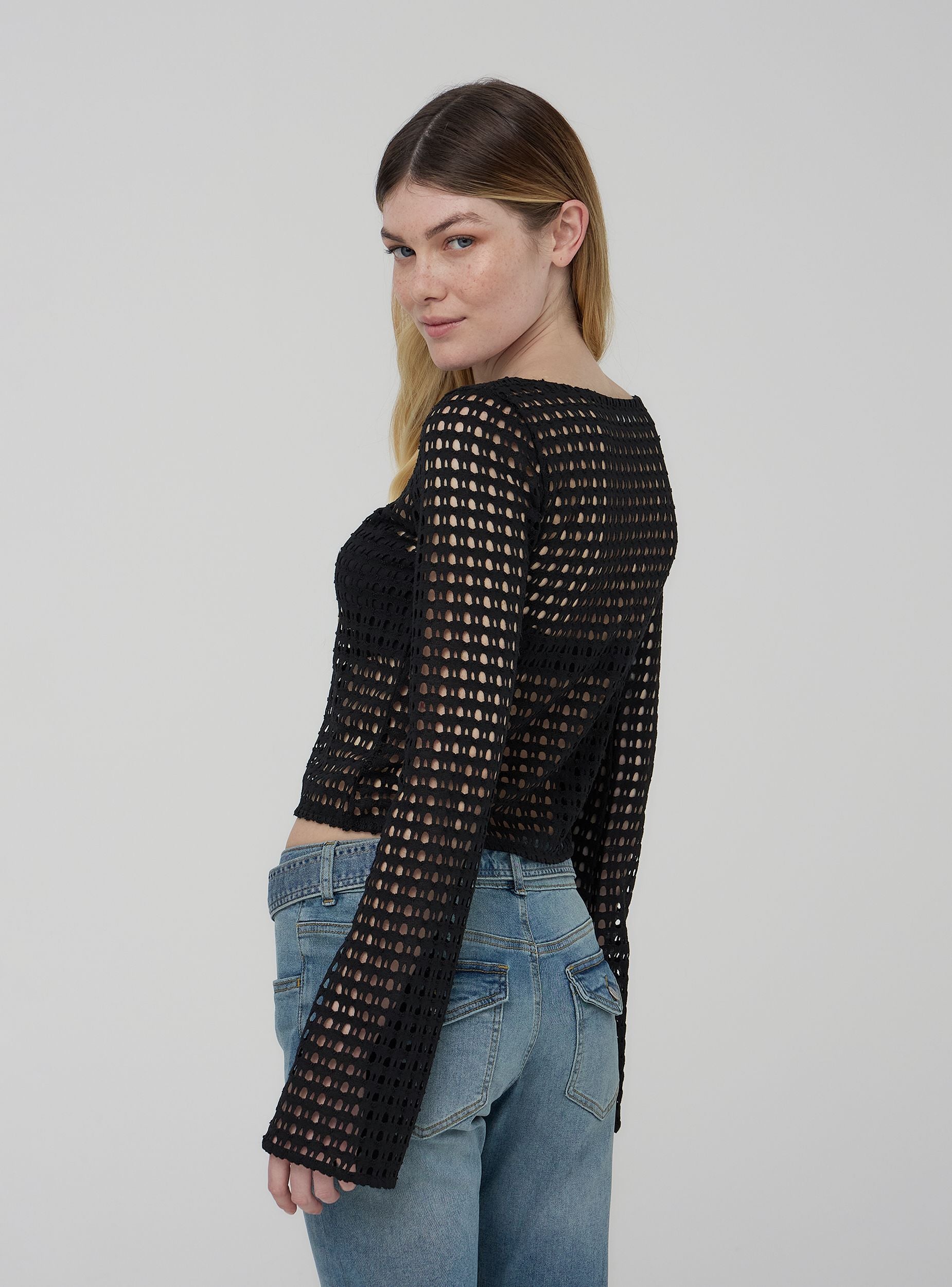 Maglia da donna dallo stile moderno e accattivante, caratterizzata da una trama traforata a rete che aggiunge un tocco di originalità al look. Questo capo a tinta unita è pensato come un must-have per completare outfit di tendenza. Dotata di maniche lunghe e scollo ampio, questa maglia è perfetta per chi cerca un pezzo versatile e distintivo. La texture traforata rende il capo leggero e ideale per abbinamenti casual o per look più ricercati, mantenendo sempre uno stile raffinato e contemporaneo.Dettagli