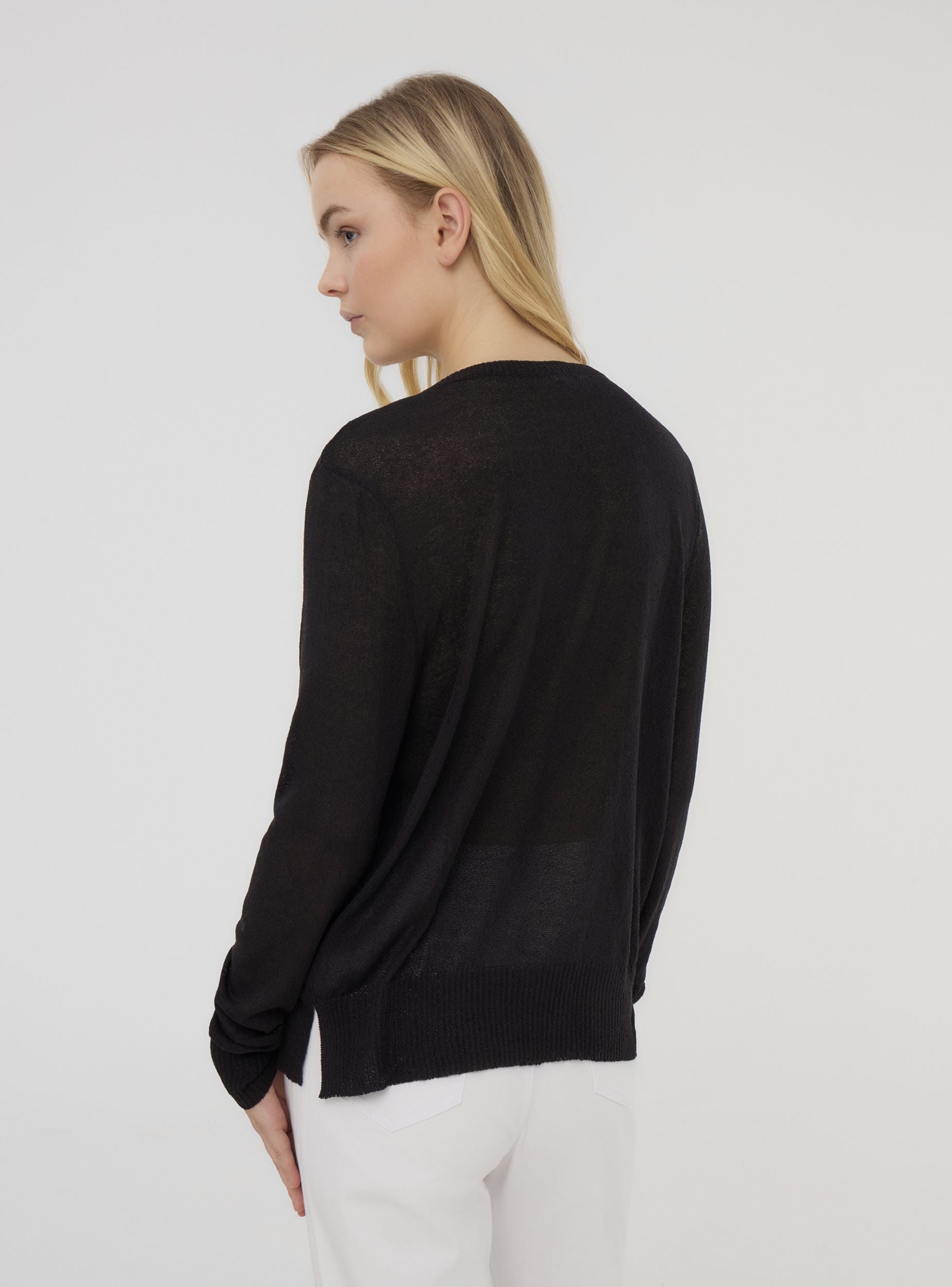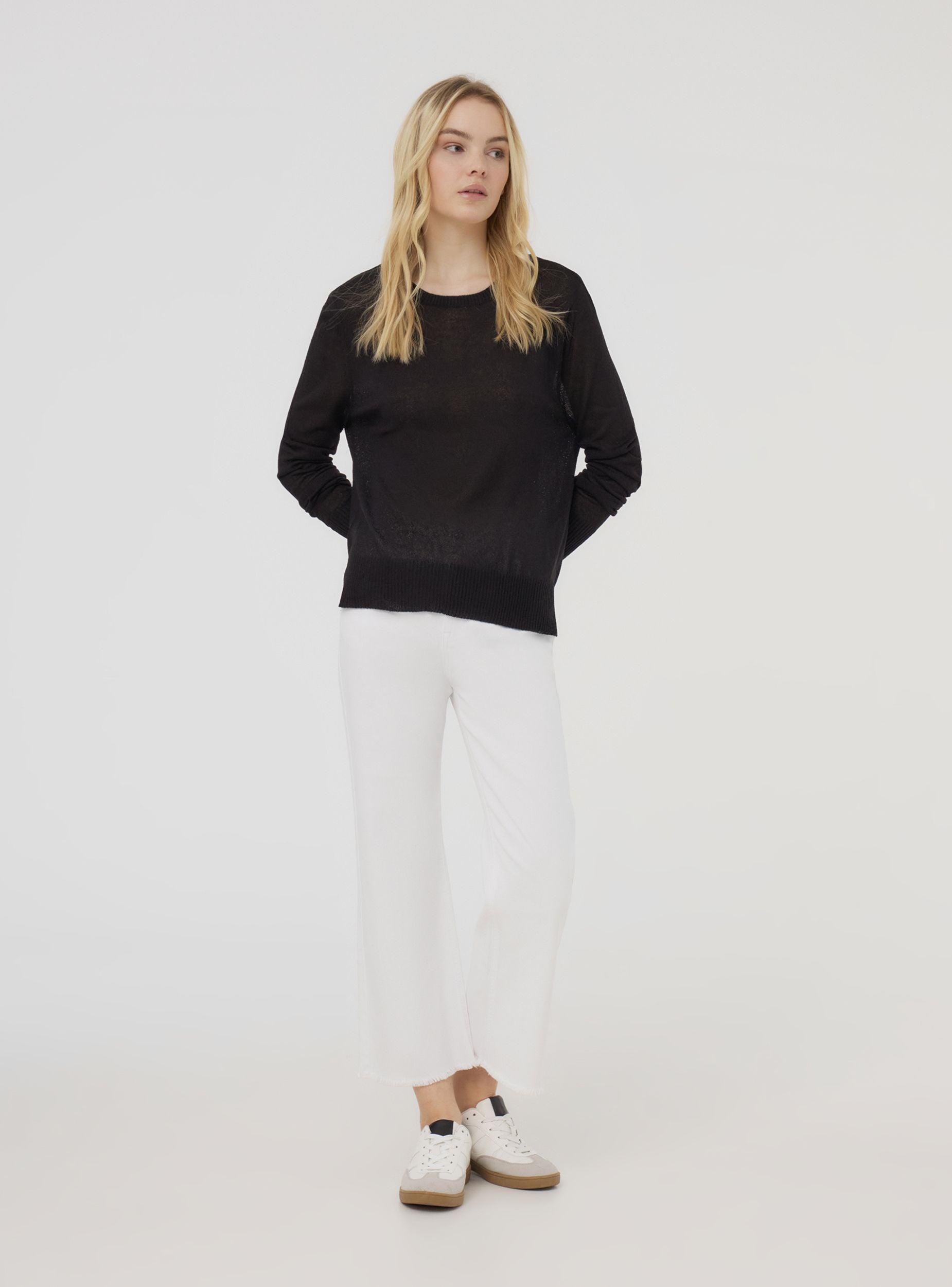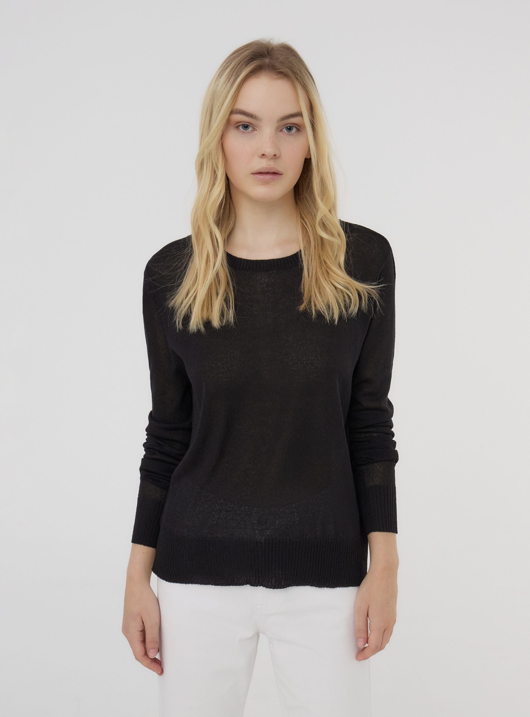 Maglia da donna ampia e versatile, dal design tinta unita e girocollo, perfetta per chi ama un look minimalista. Le maniche lunghe e il tessuto semitrasparente aggiungono un tocco di leggerezza, rendendola ideale per creare look a più strati. È dotata di un discreto spacchetto laterale, che conferisce maggiore comodità e movimento. Questo capo essenziale permette di essere indossato da solo o sopra ad altri indumenti, offrendo la massima adattabilità per ogni stagione.Dettagli