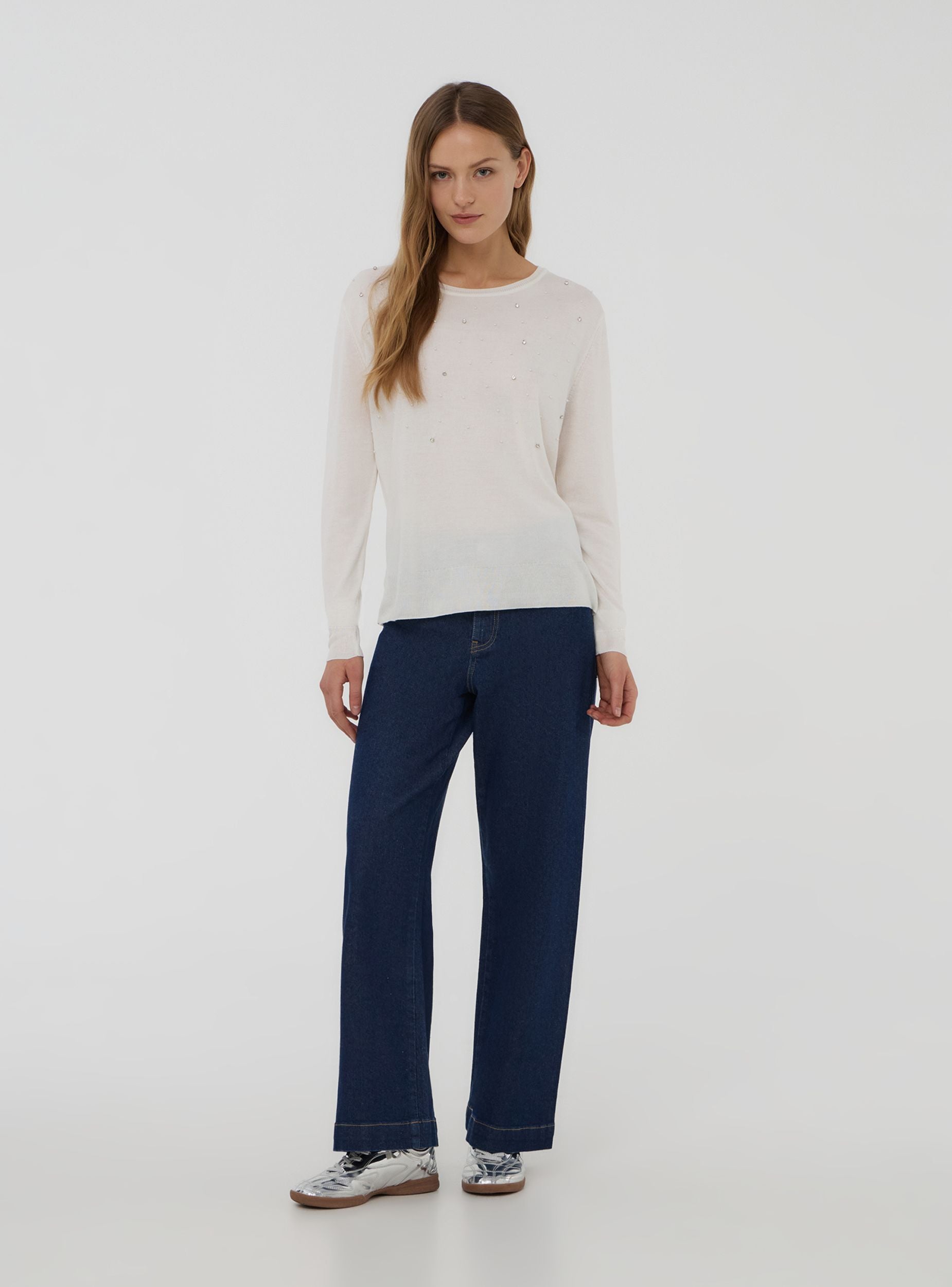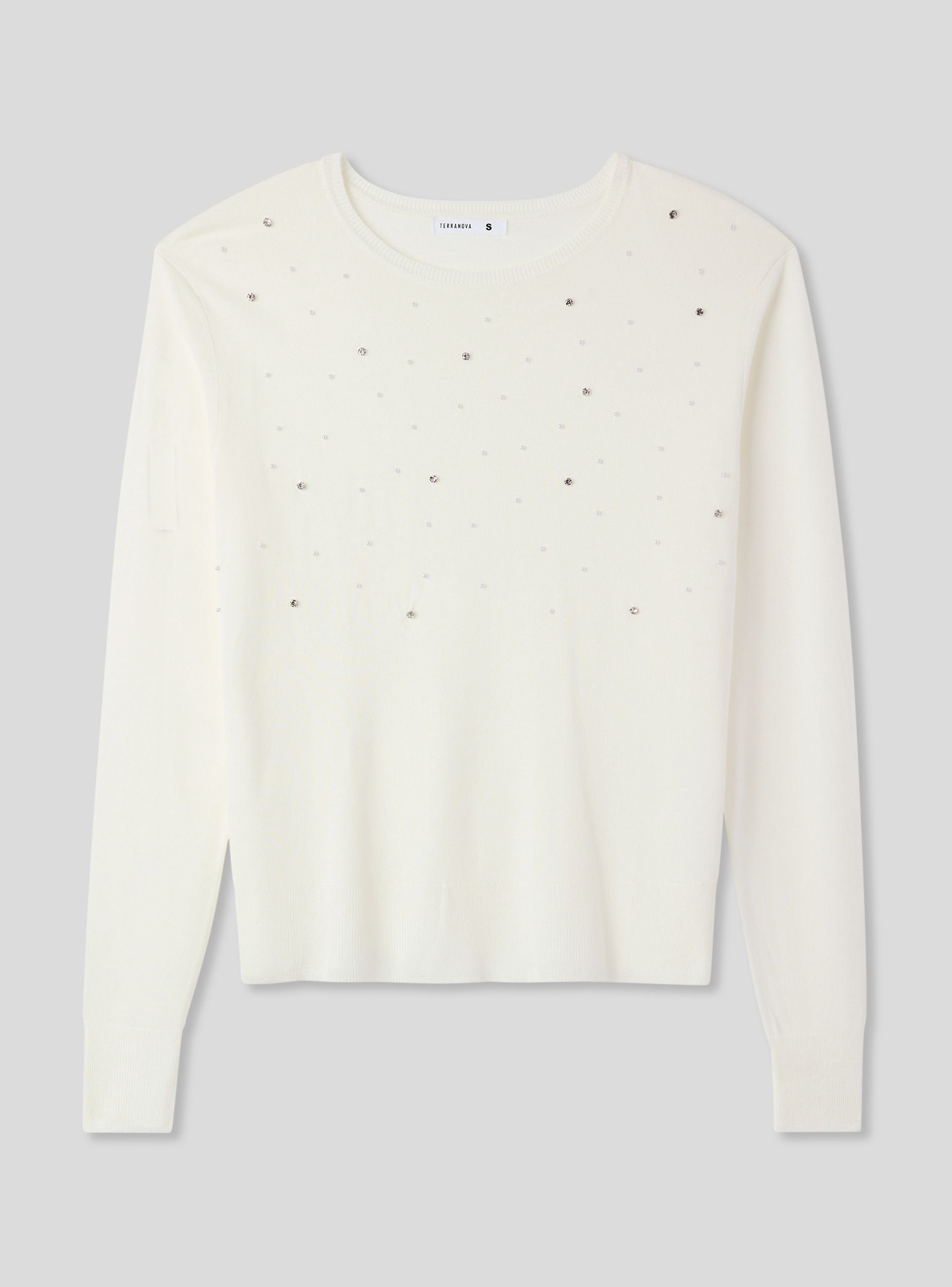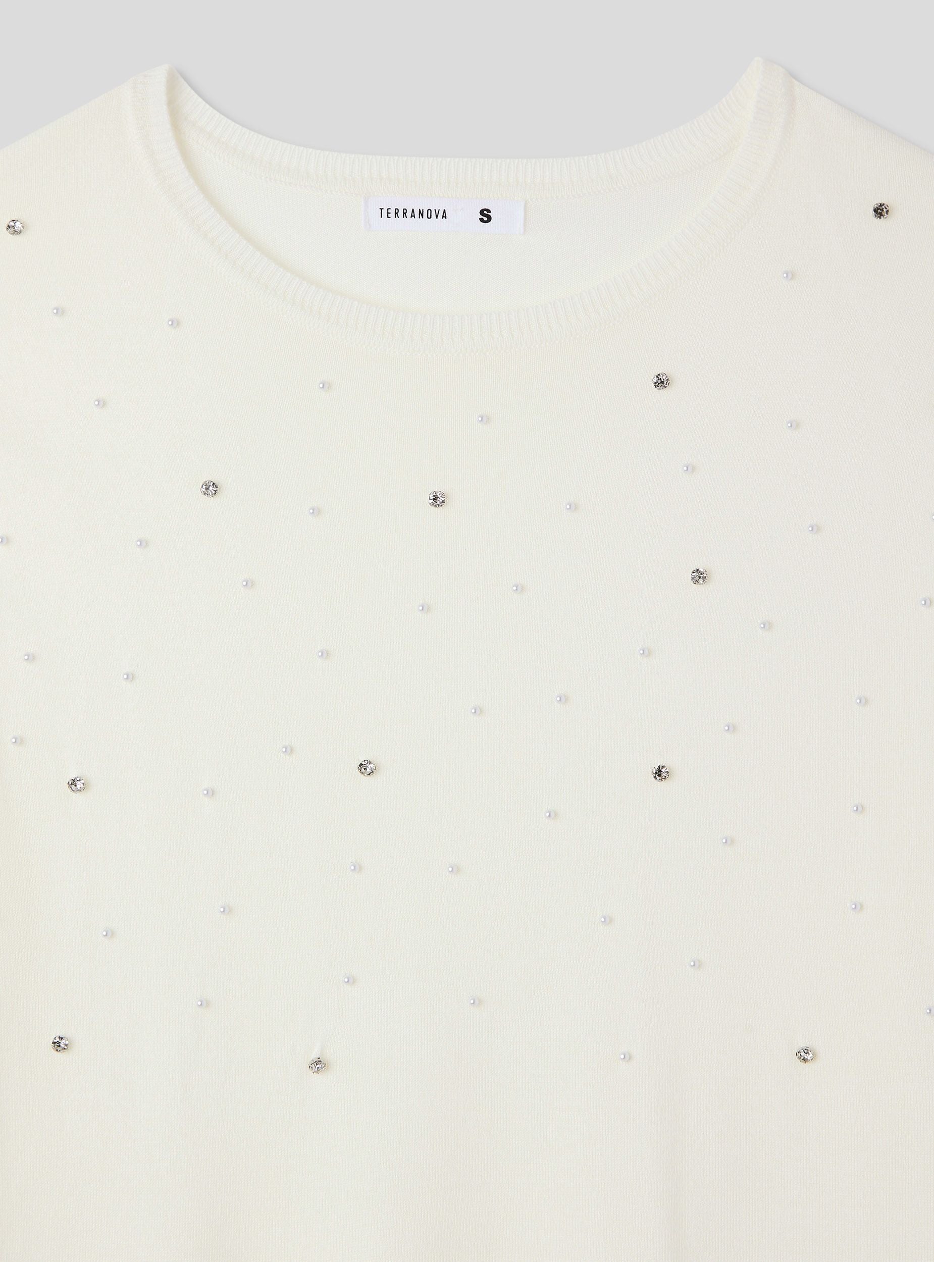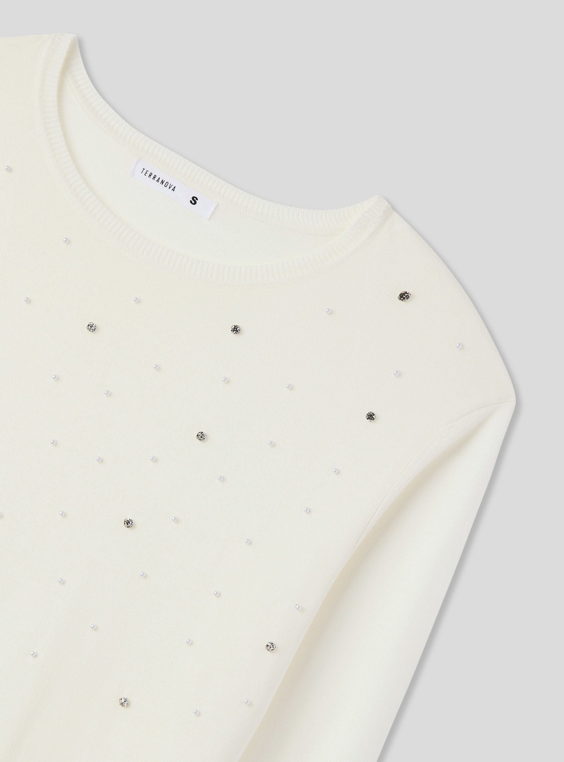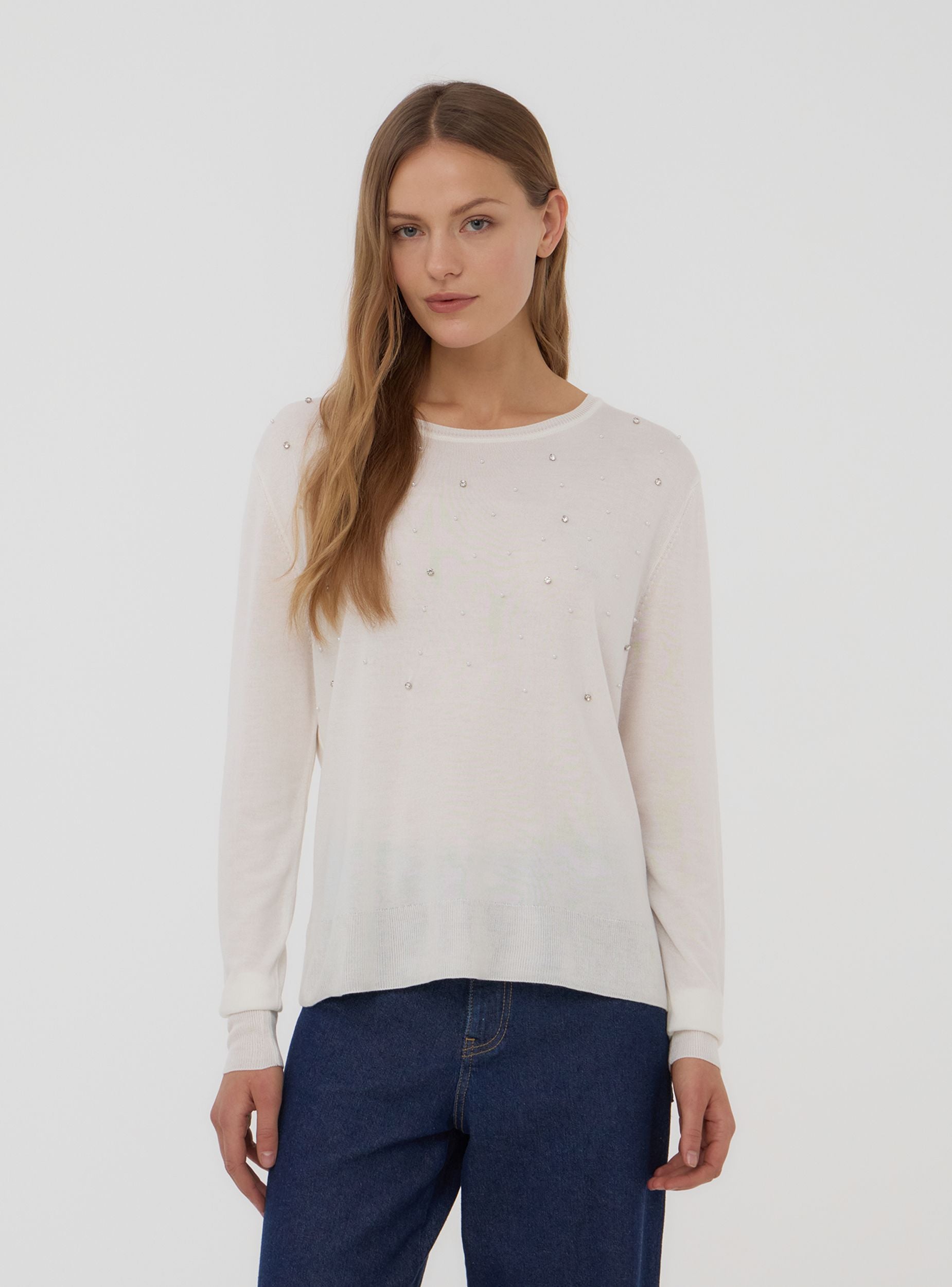 Maglia da donna a tinta unita con maniche lunghe, impreziosita da dettagli di strass e perle che donano luminosità ed eleganza. Perfetta per un look raffinato, si abbina facilmente a pantaloni eleganti o gonne midi per un effetto sofisticato. Ideale per serate speciali, eventi o occasioni in cui desideri brillare con stile, unendo comfort e femminilità in un'unica soluzione di tendenza.Dettagli