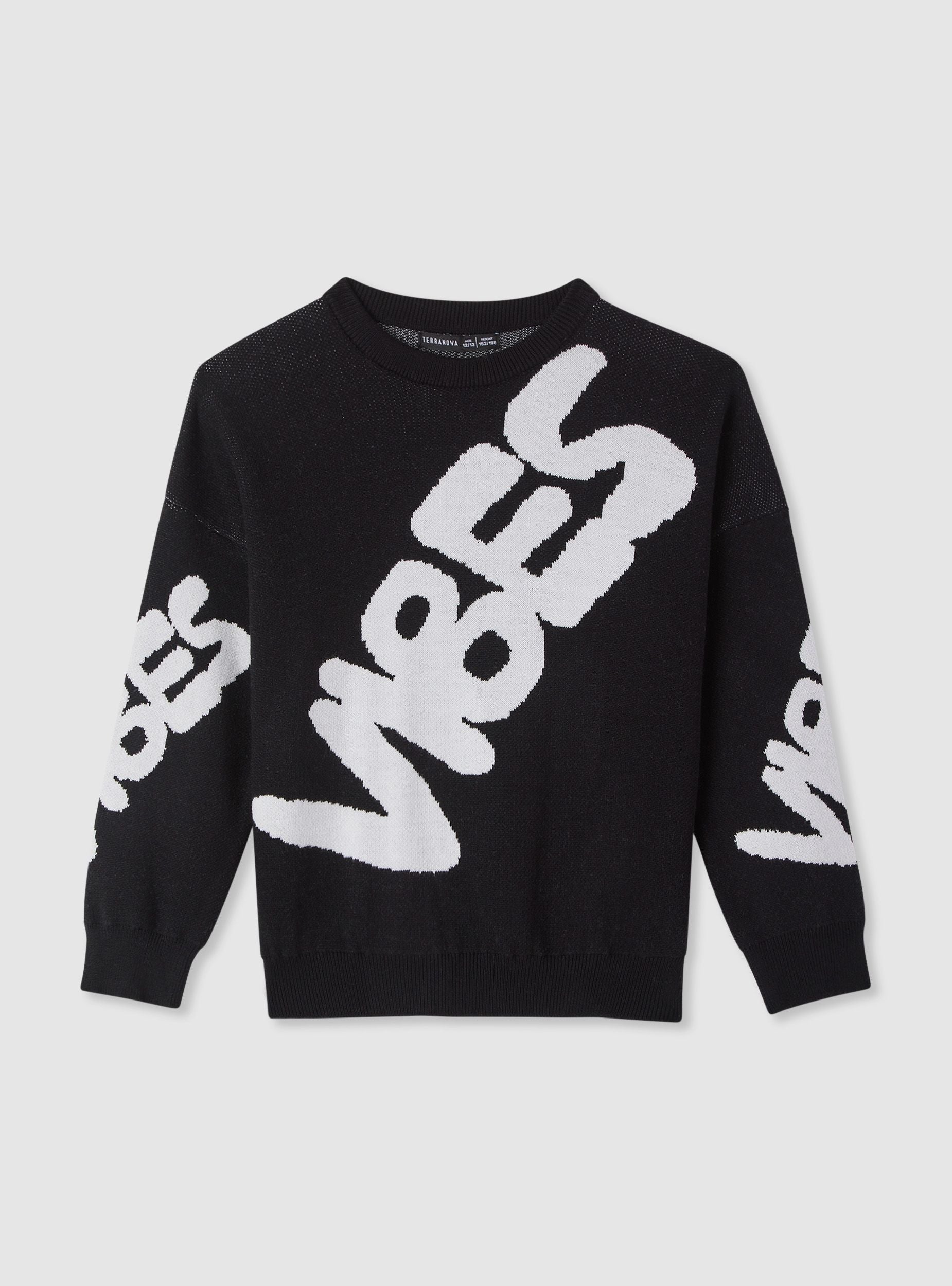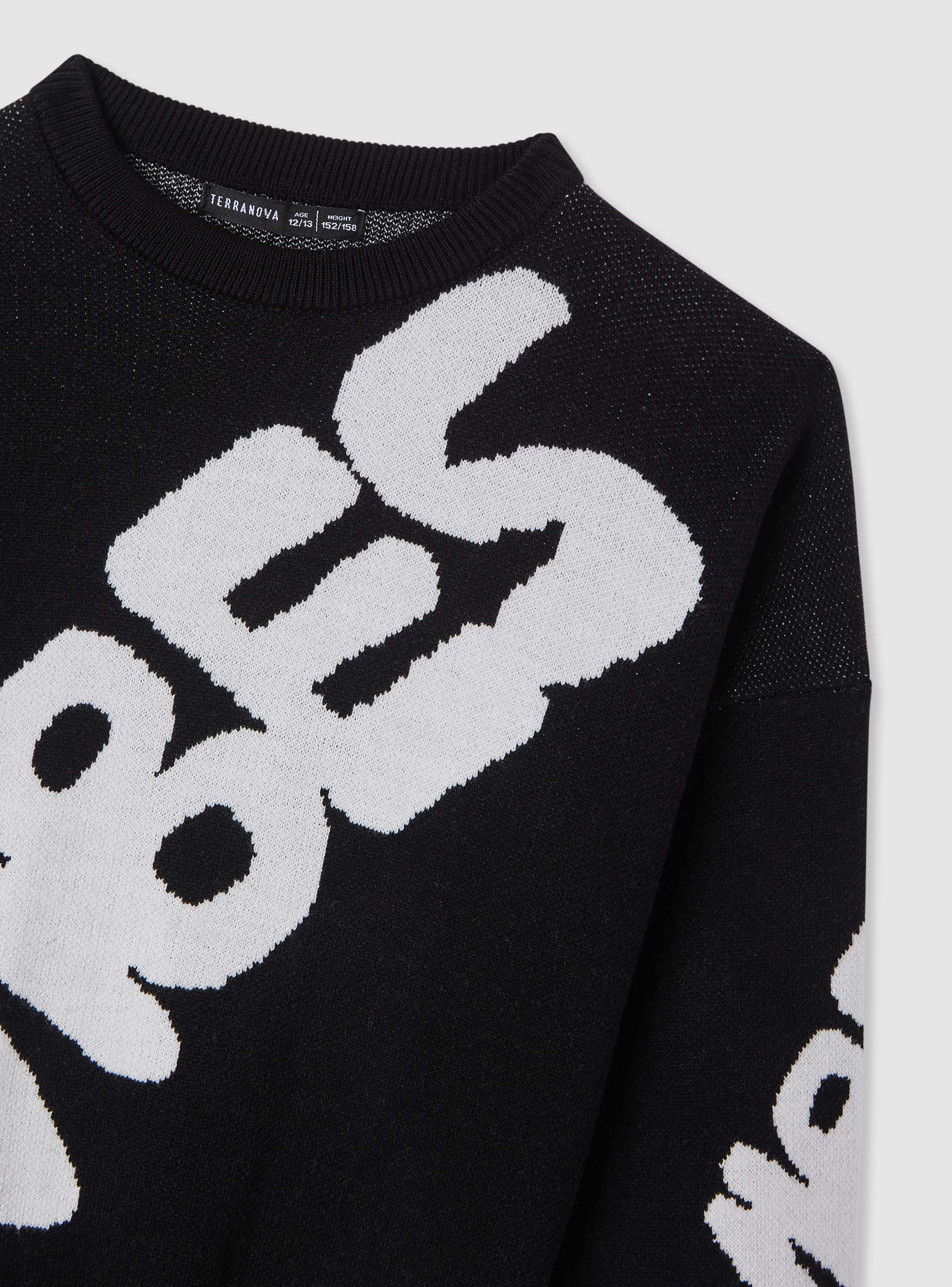 Maglia da bambino a tinta unita con scritta jacquard a contrasto. Modello con girocollo, maniche lunghe e bordi a coste su polsi e fondo per una vestibilità confortevole. Perfetta per la scuola e il tempo libero, si abbina a jeans o pantaloni jogger. Il design con lettering dinamico aggiunge un tocco urbano al look, ideale da indossare sotto giubbotti e overshirt.Dettagli