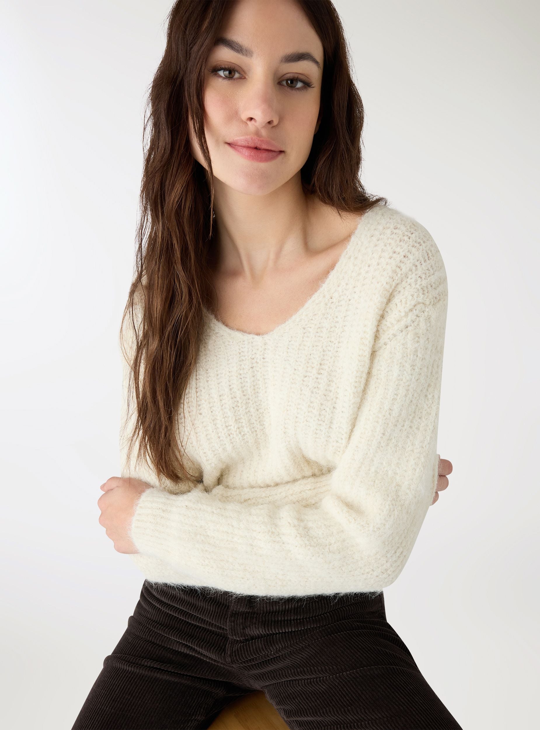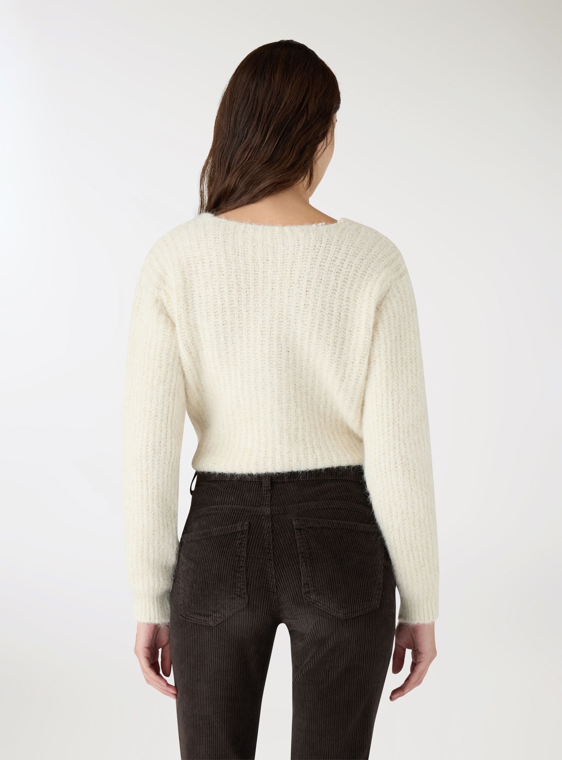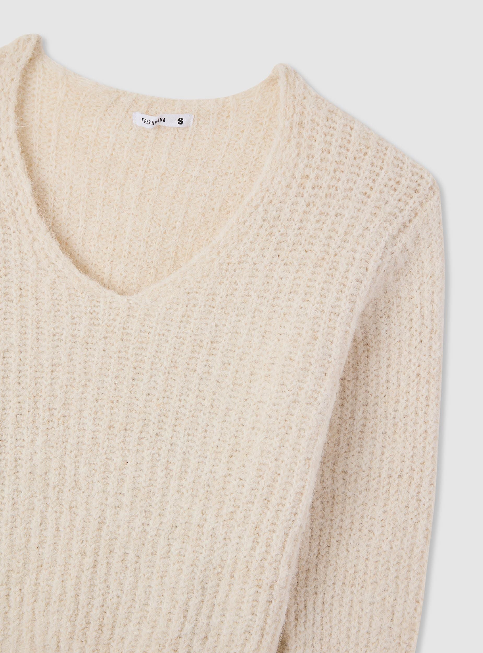 Maglia da donna a tinta unita con scollo a V ampio e maniche lunghe. Il taglio corto valorizza la silhouette e si abbina facilmente a jeans e gonne a vita alta per look da giorno e uscite serali. Finiture a costine su fondo e polsini per una linea definita, con spalle leggermente scese e vestibilità comoda.Dettagli