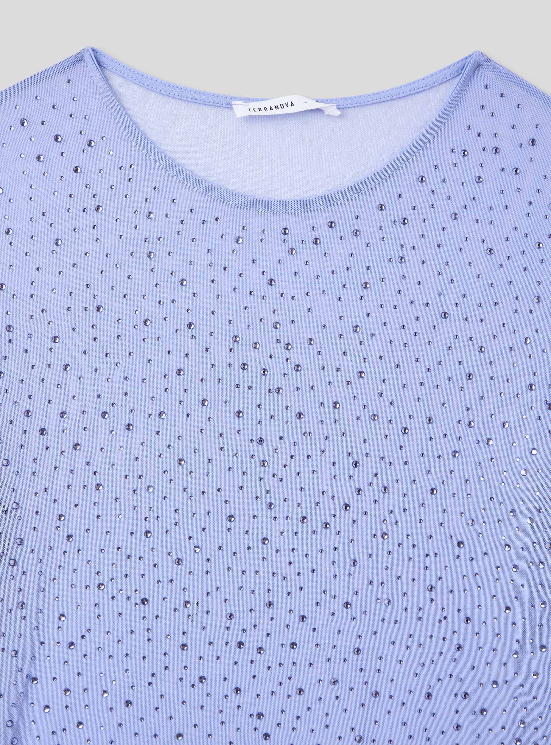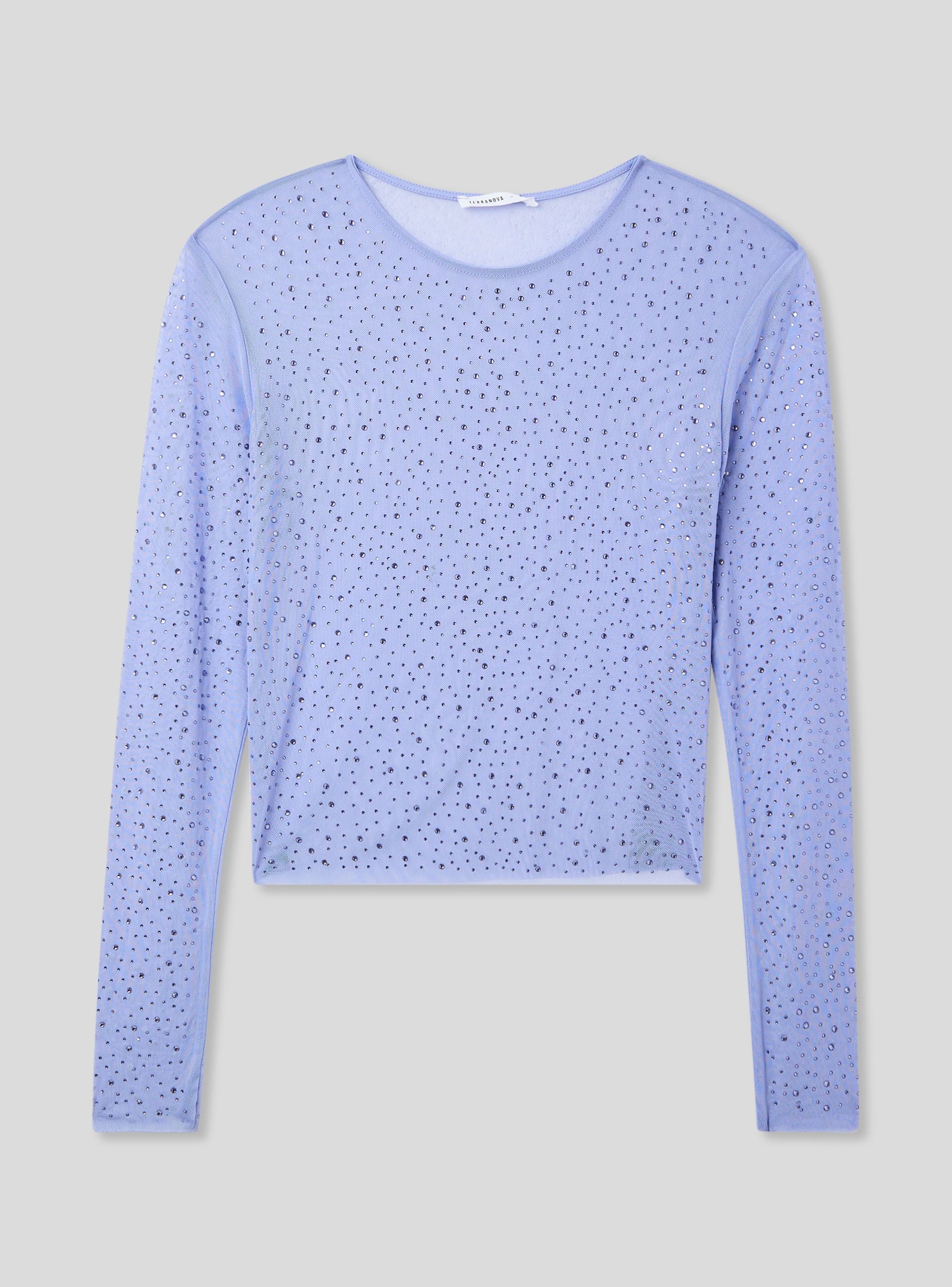 Maglia da donna con design tinta unita impreziosito da applicazioni di strass che donano un tocco brillante e femminile. Realizzata in tulle è caratterizzata da un elegante girocollo e maniche lunghe, perfetta per creare outfit sofisticati e ricercati. La sua vestibilità fluida la rende ideale per essere abbinata sia a look casual che a combinazioni più eleganti.Dettagli