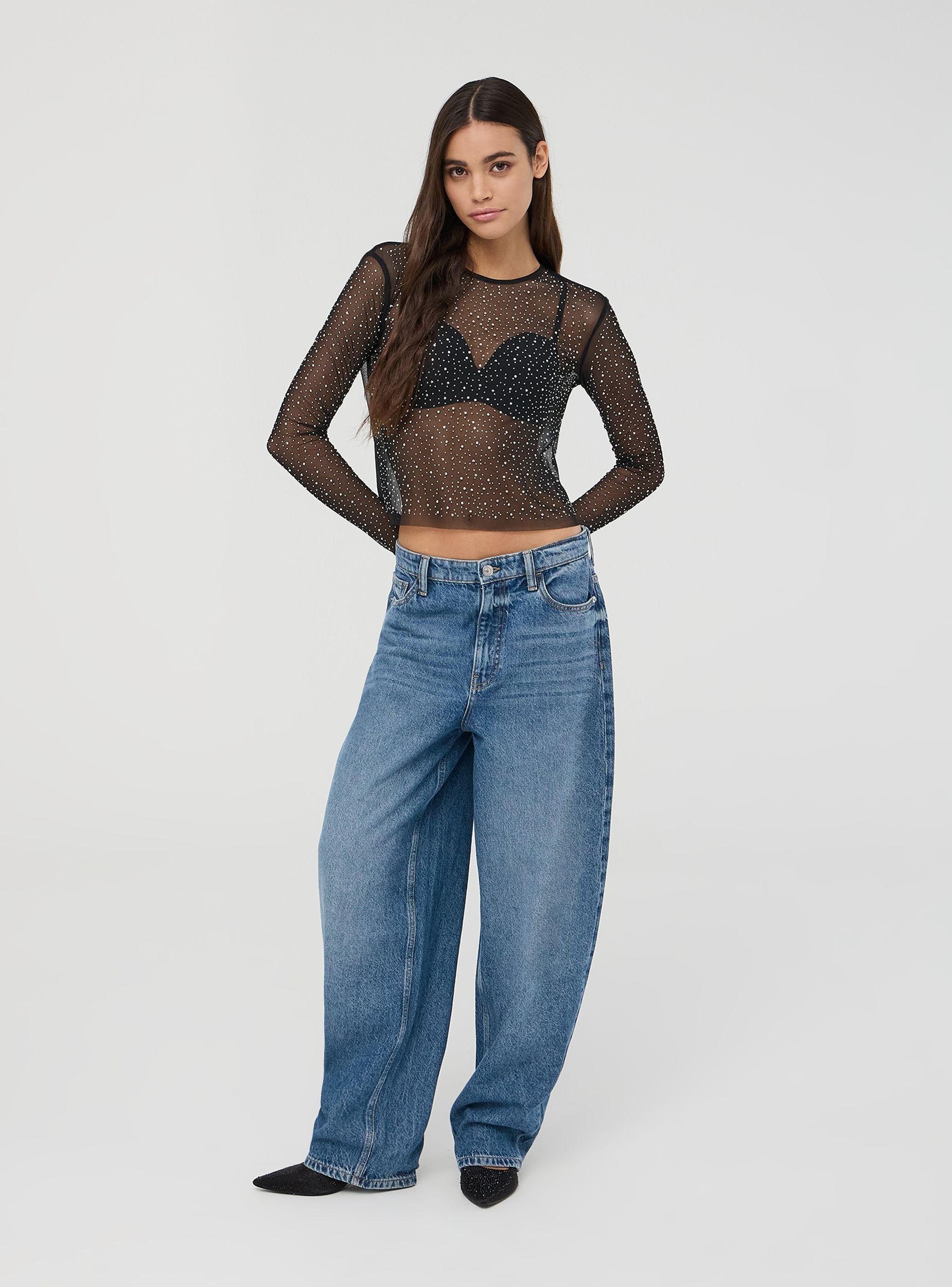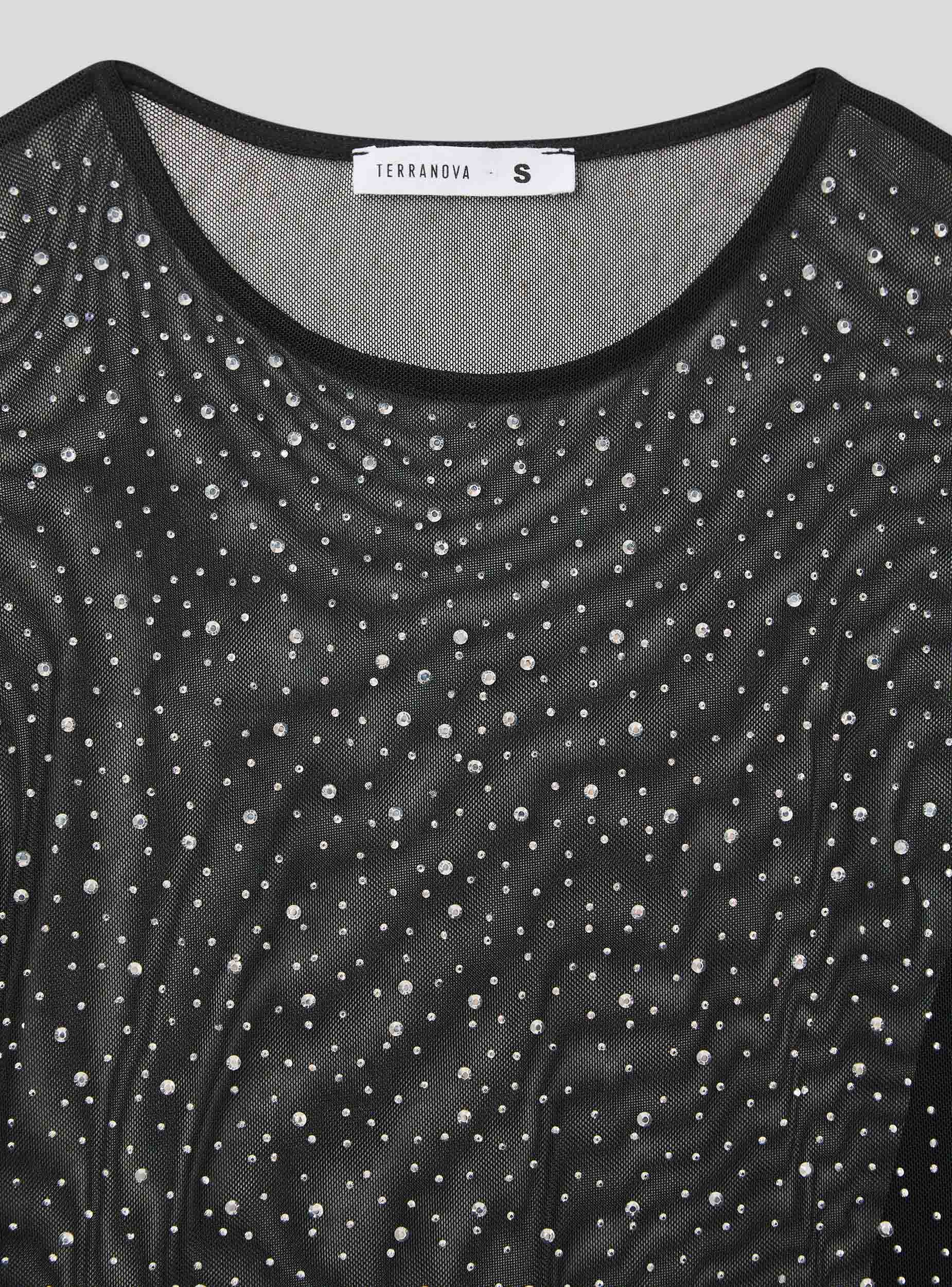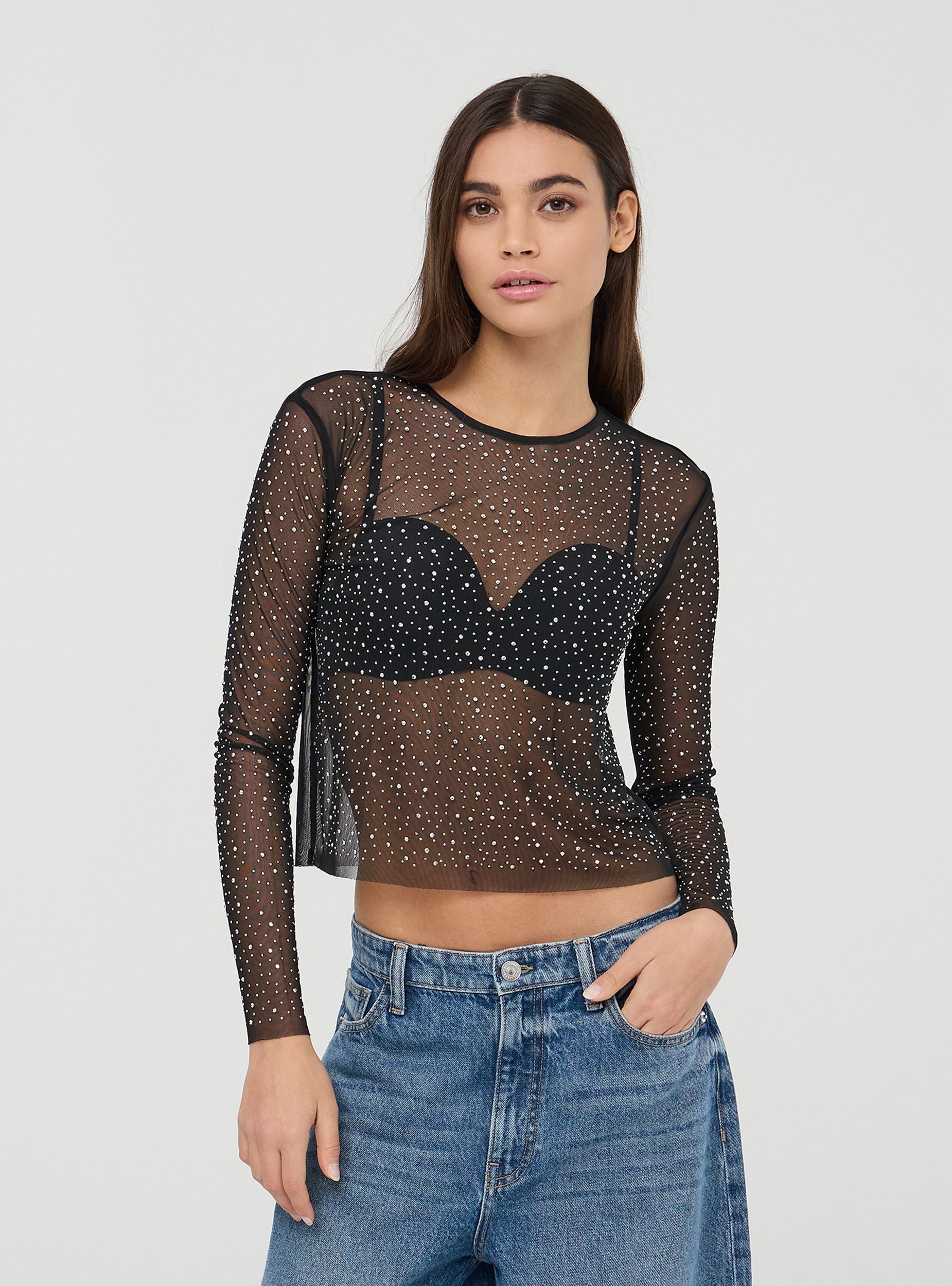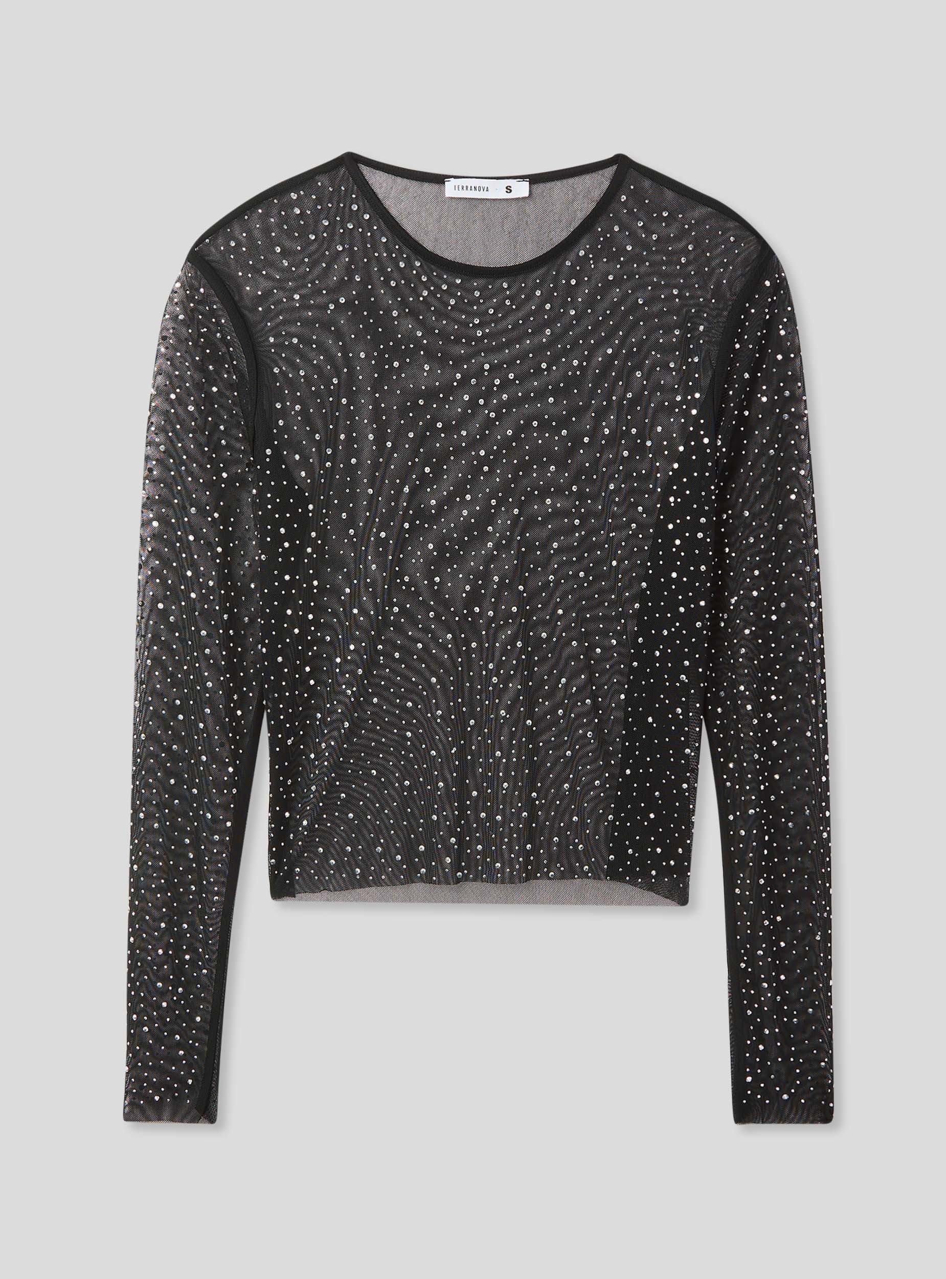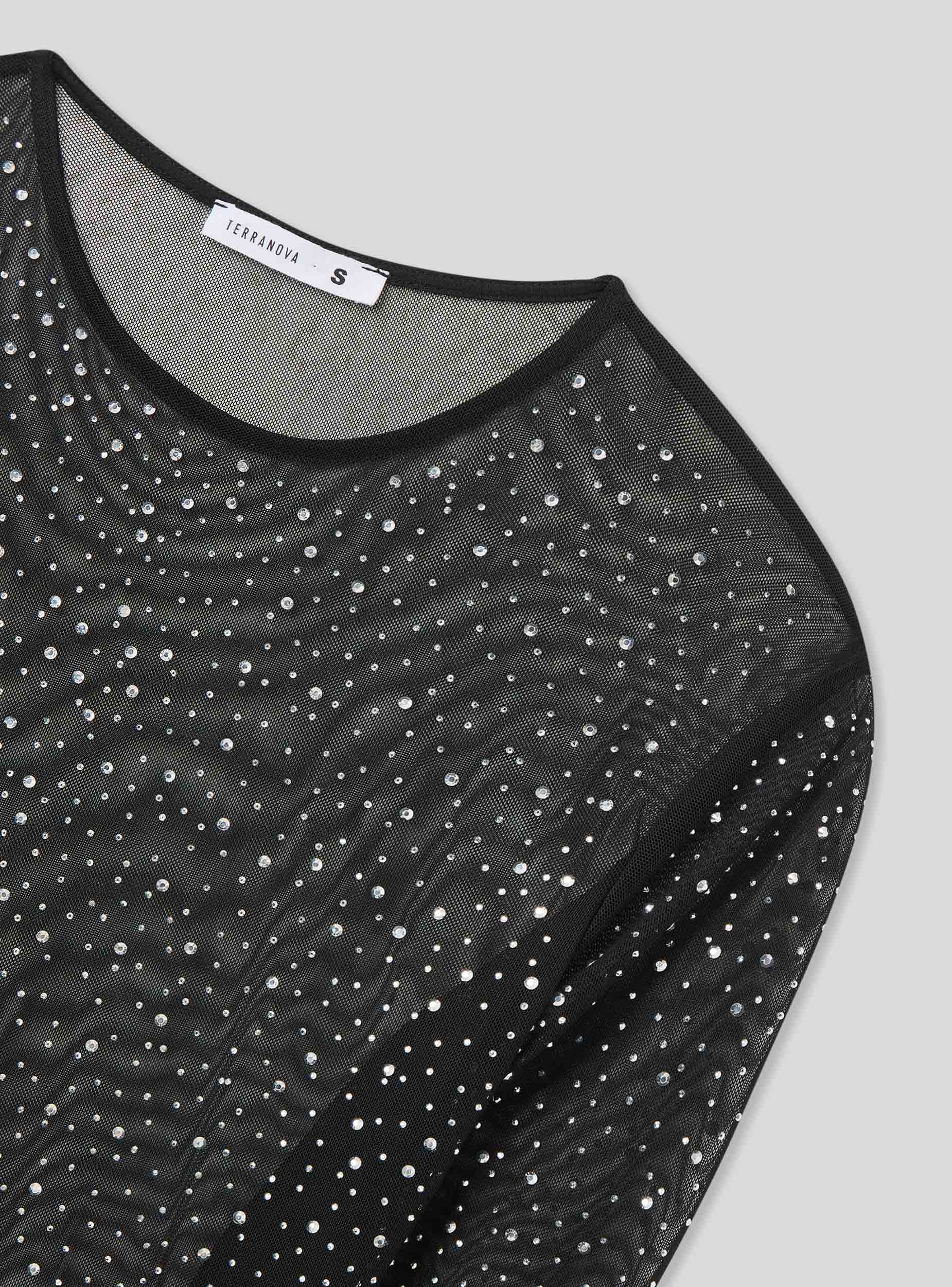 Maglia da donna con design tinta unita impreziosito da applicazioni di strass che donano un tocco brillante e femminile. Realizzata in tulle è caratterizzata da un elegante girocollo e maniche lunghe, perfetta per creare outfit sofisticati e ricercati. La sua vestibilità fluida la rende ideale per essere abbinata sia a look casual che a combinazioni più eleganti.Dettagli