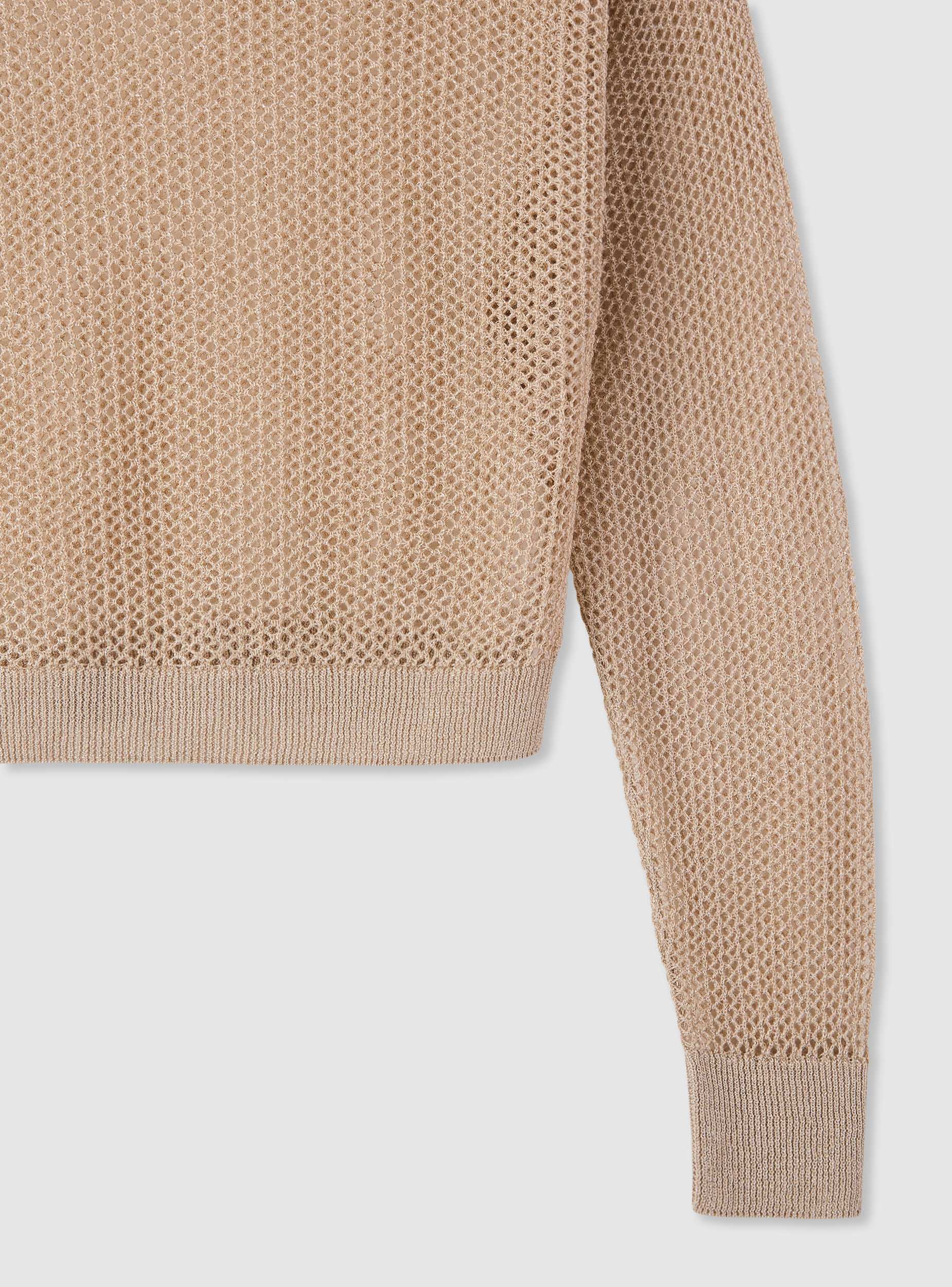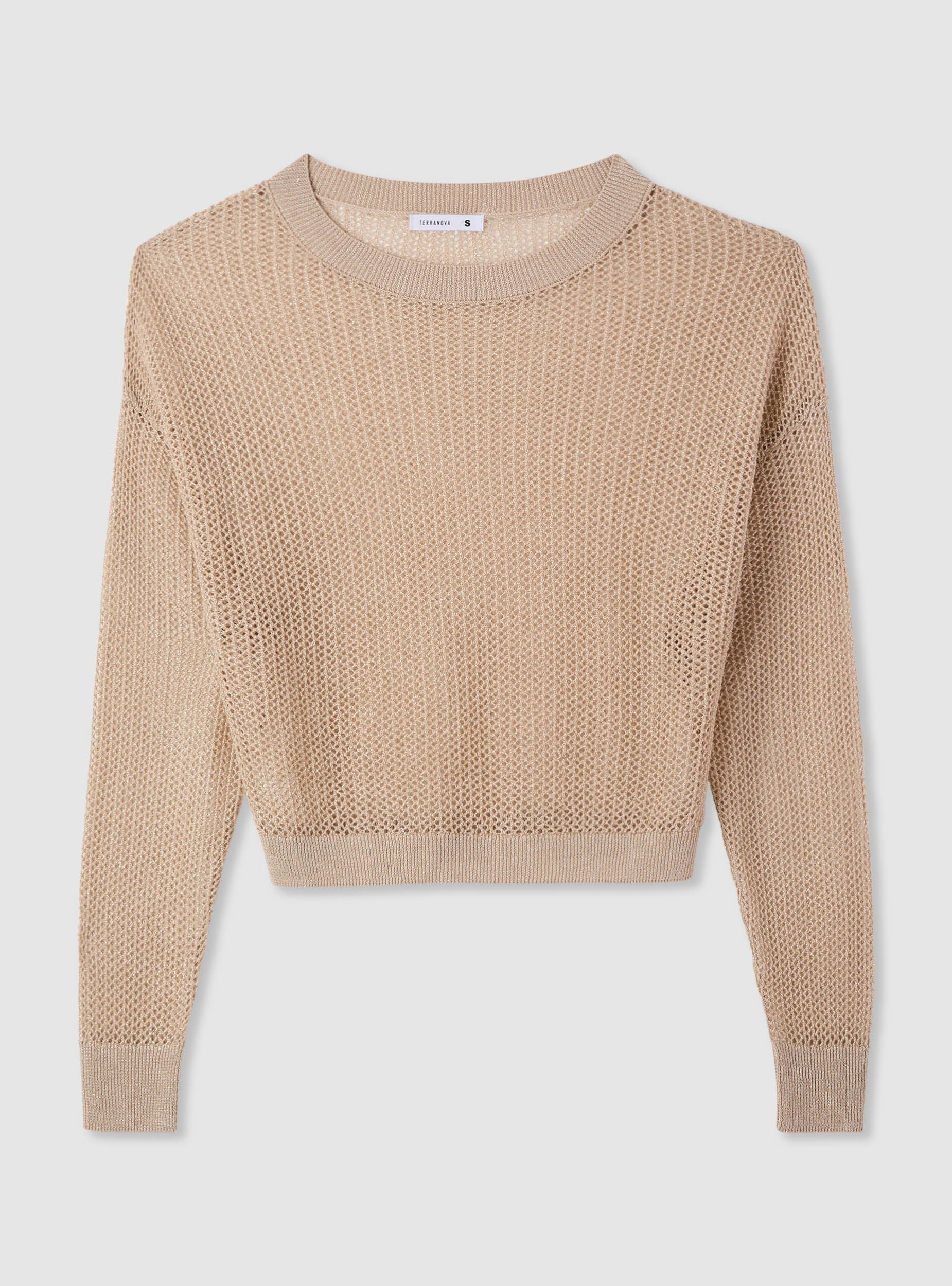Maglia da donna in tinta unita con lavorazione a rete e vestibilità crop. Girocollo e maniche lunghe, bordi a coste su collo, polsi e fondo per una finitura pulita. Perfetta su jeans a vita alta o gonne midi per un look contemporaneo, ideale dal tempo libero alle uscite serali grazie all’effetto luccicante che dona luminosità al tuo outfit.Dettagli