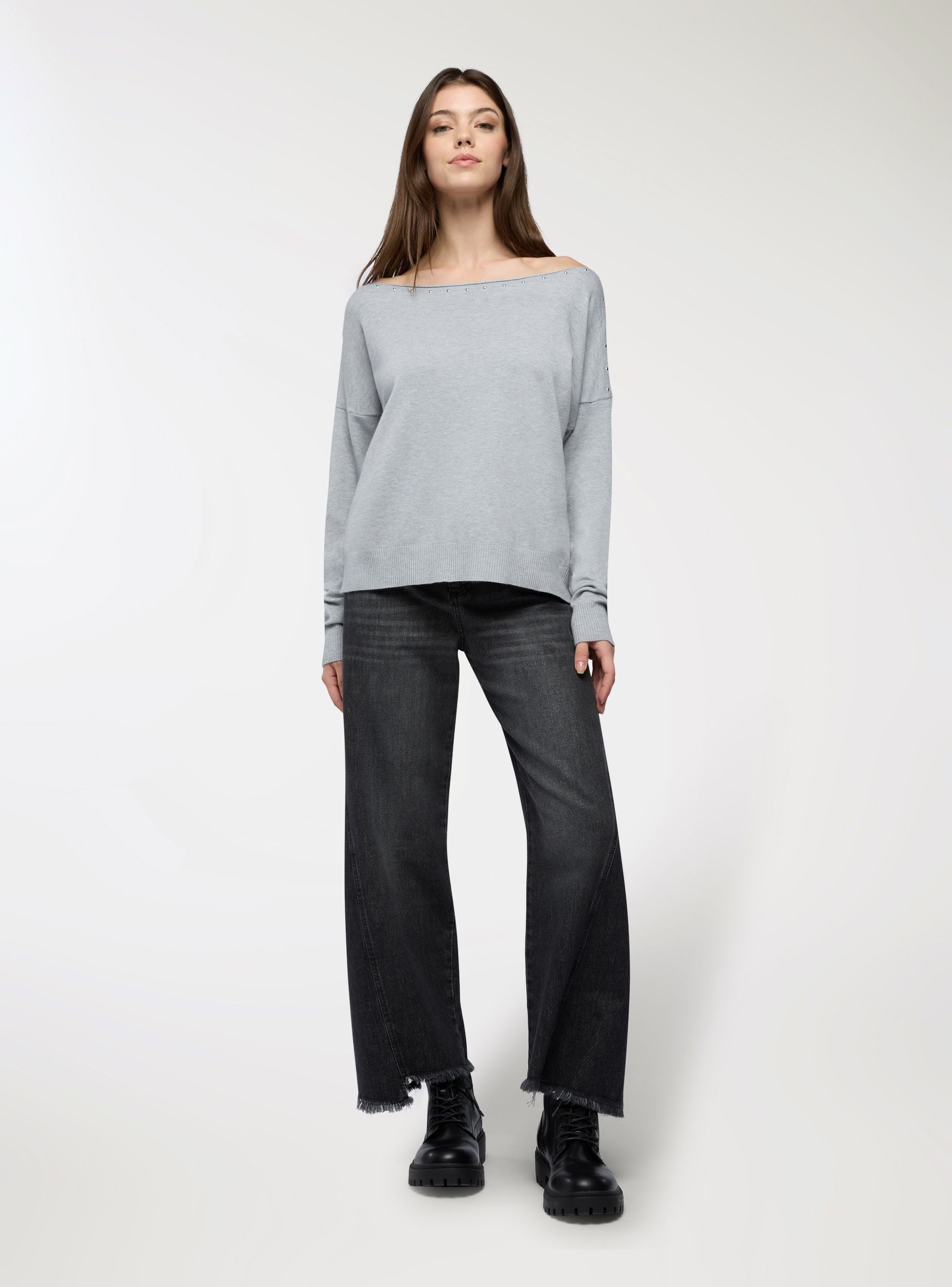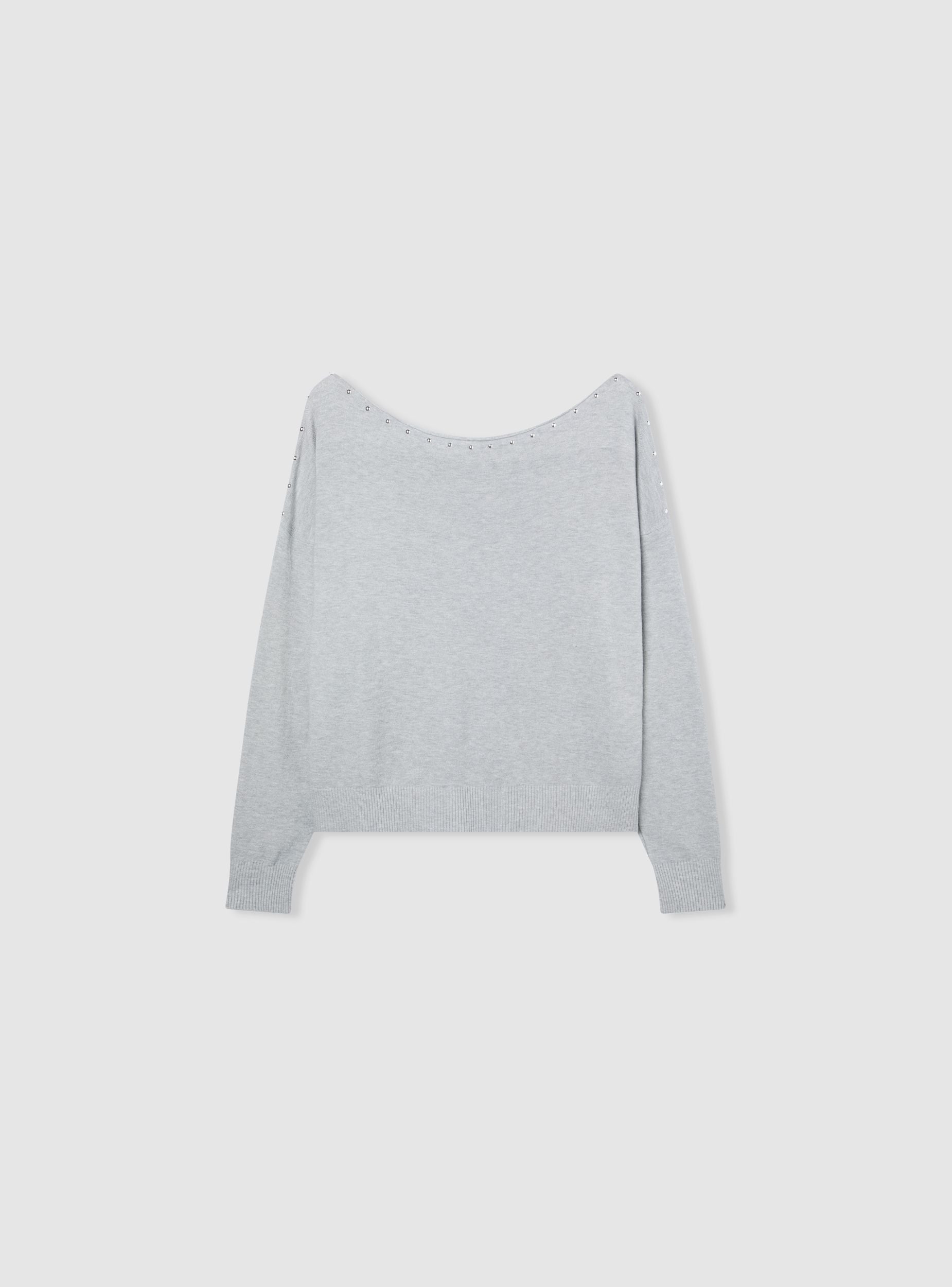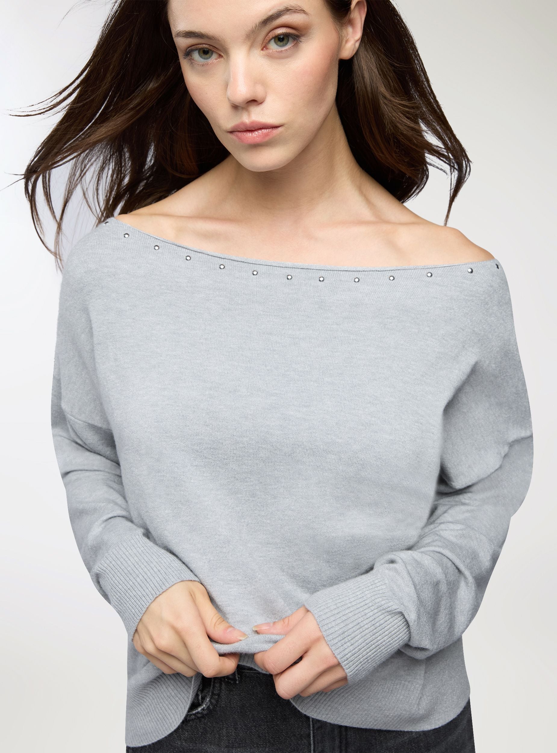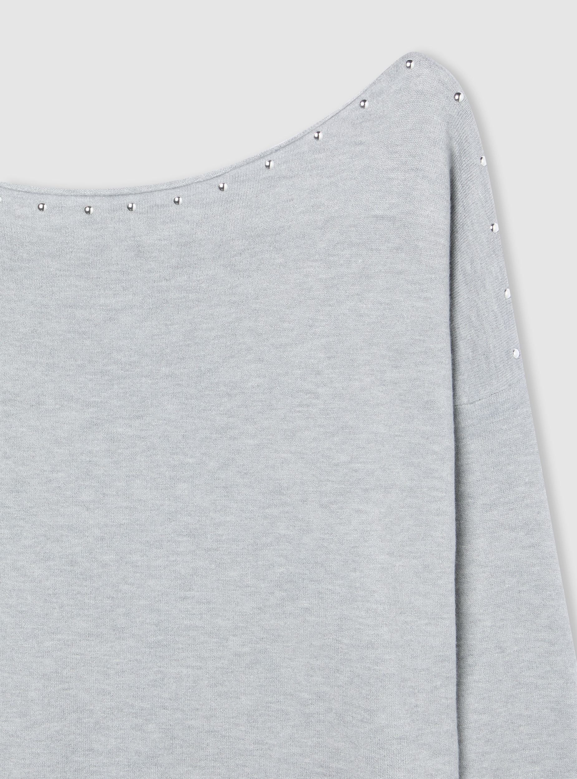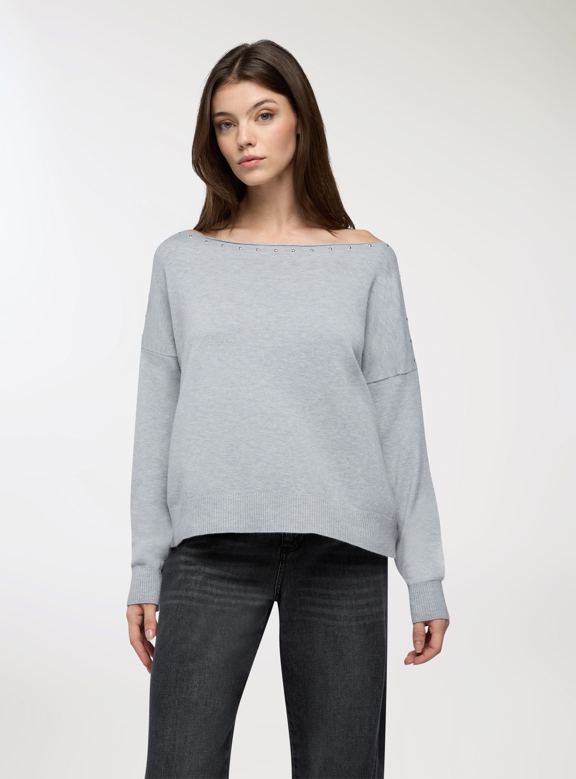 Maglia da donna a maniche lunghe con scollo a barca impreziosito da piccole borchie lungo il bordo e sulle spalle. Il design a tinta unita la rendono facile da abbinare a jeans, pantaloni sartoriali o gonne per il tempo libero o l’ufficio. Vestibilità regular che cade morbida sul busto, ideale da indossare anche sopra top o camicie leggere.
