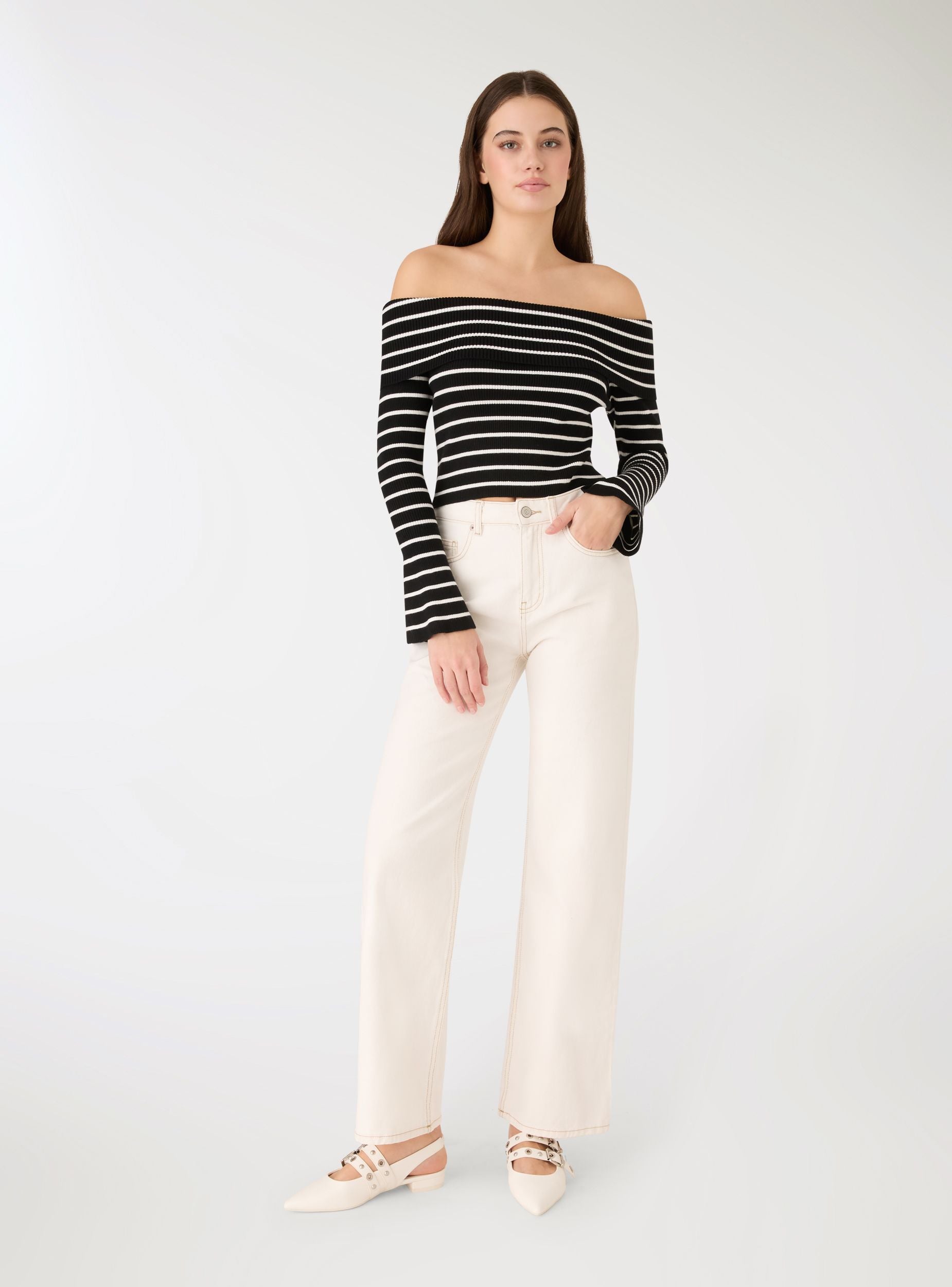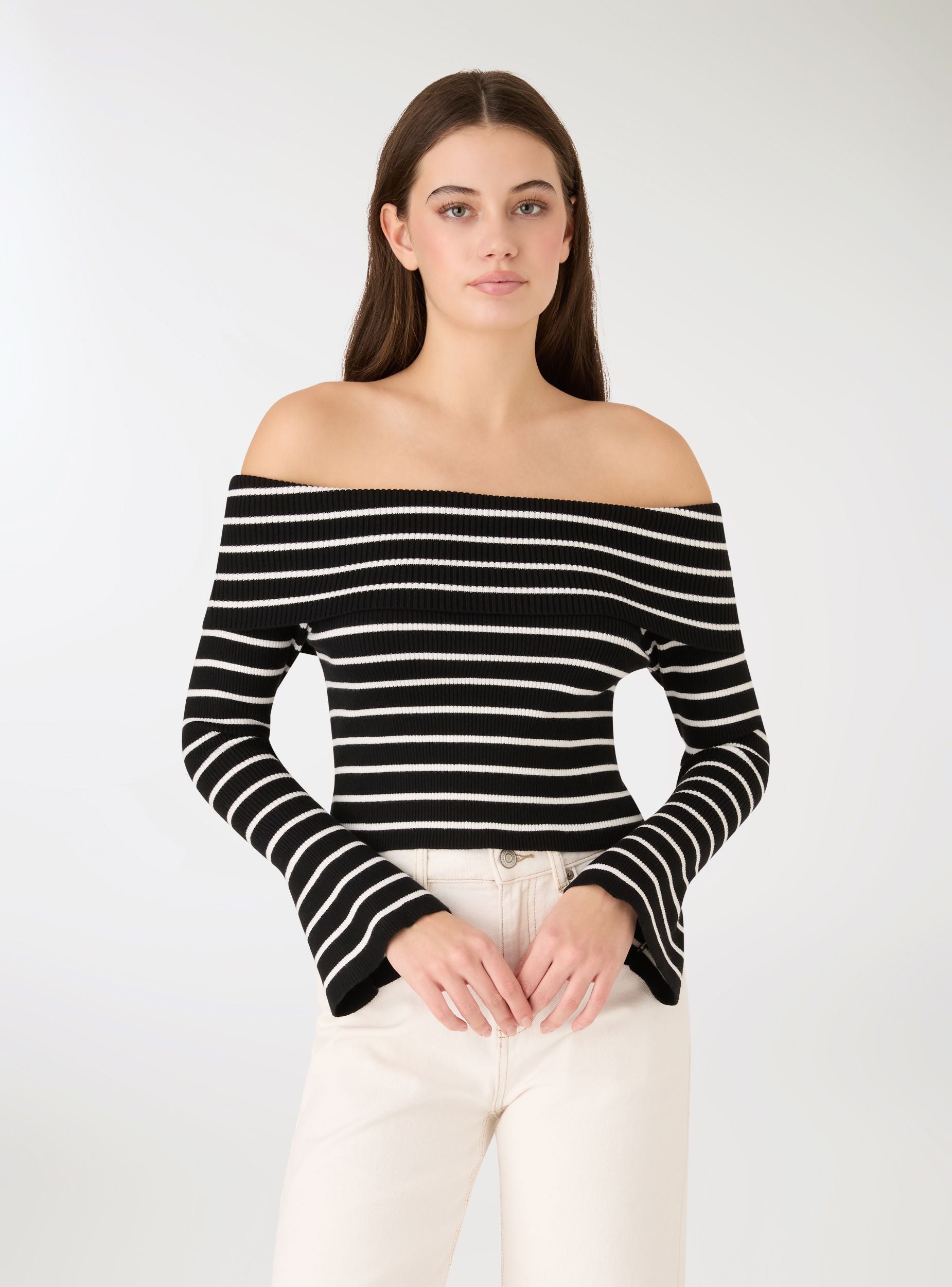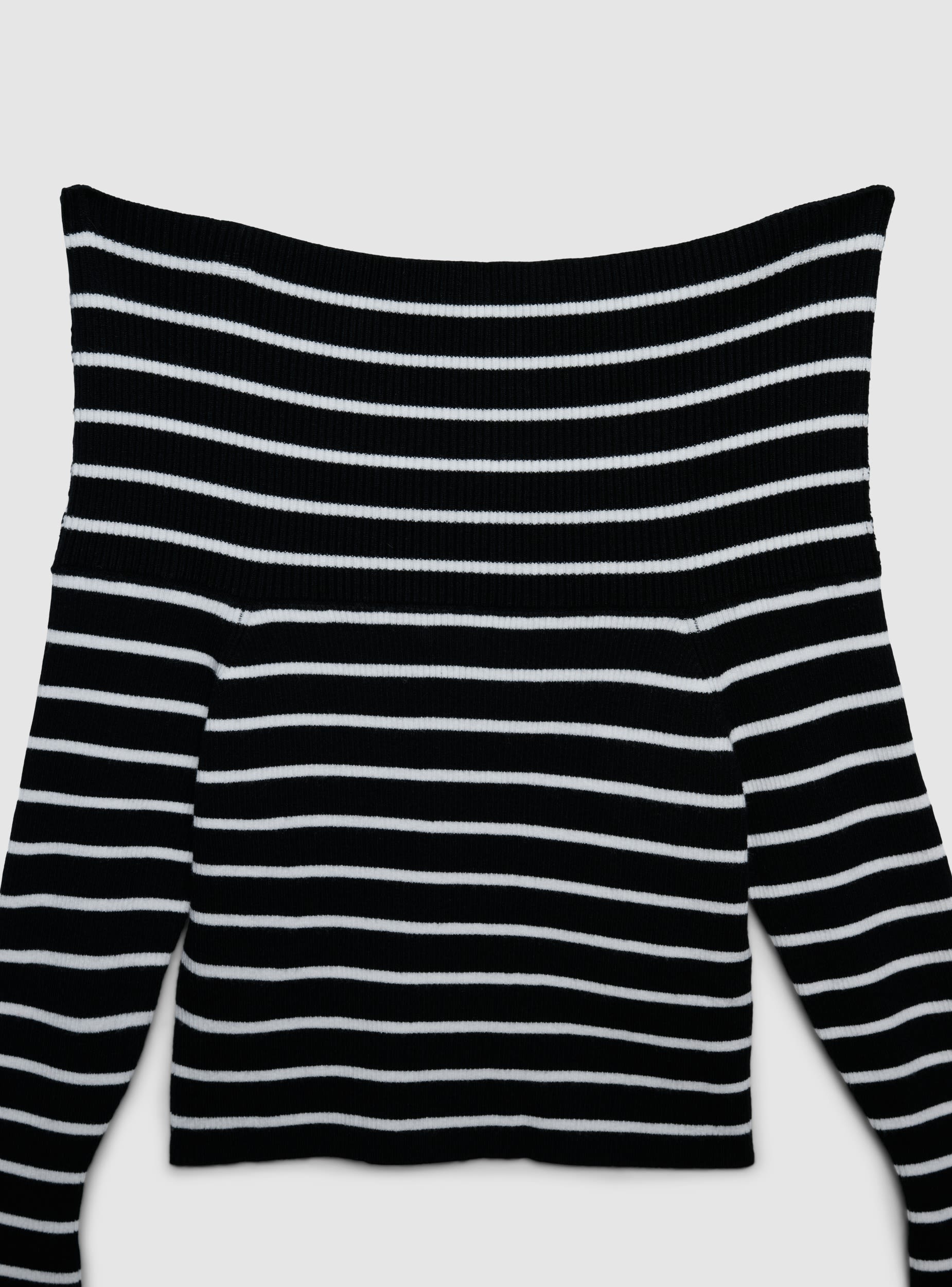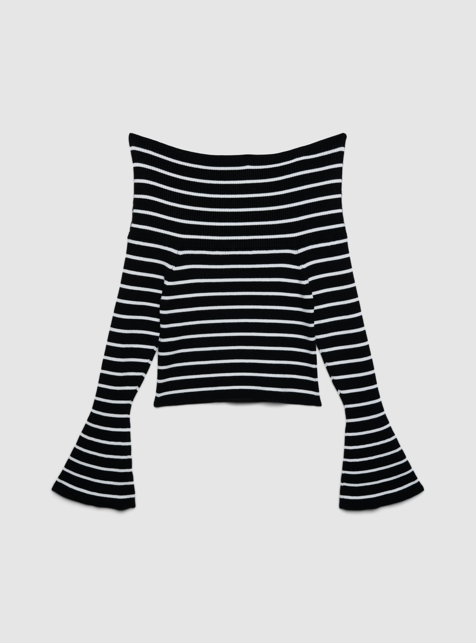 Maglia da donna a righe, modello crop, con spalle scoperte. Realizzata in maglia a costine, presenta maniche lunghe a campana per un tocco elegante. Vestibilità aderente sul busto e orlo dritto. Perfetta con jeans a vita alta o gonne midi per il tempo libero o uscite serali, si indossa facilmente sopra top minimal per un look curato e femminile.Dettagli
