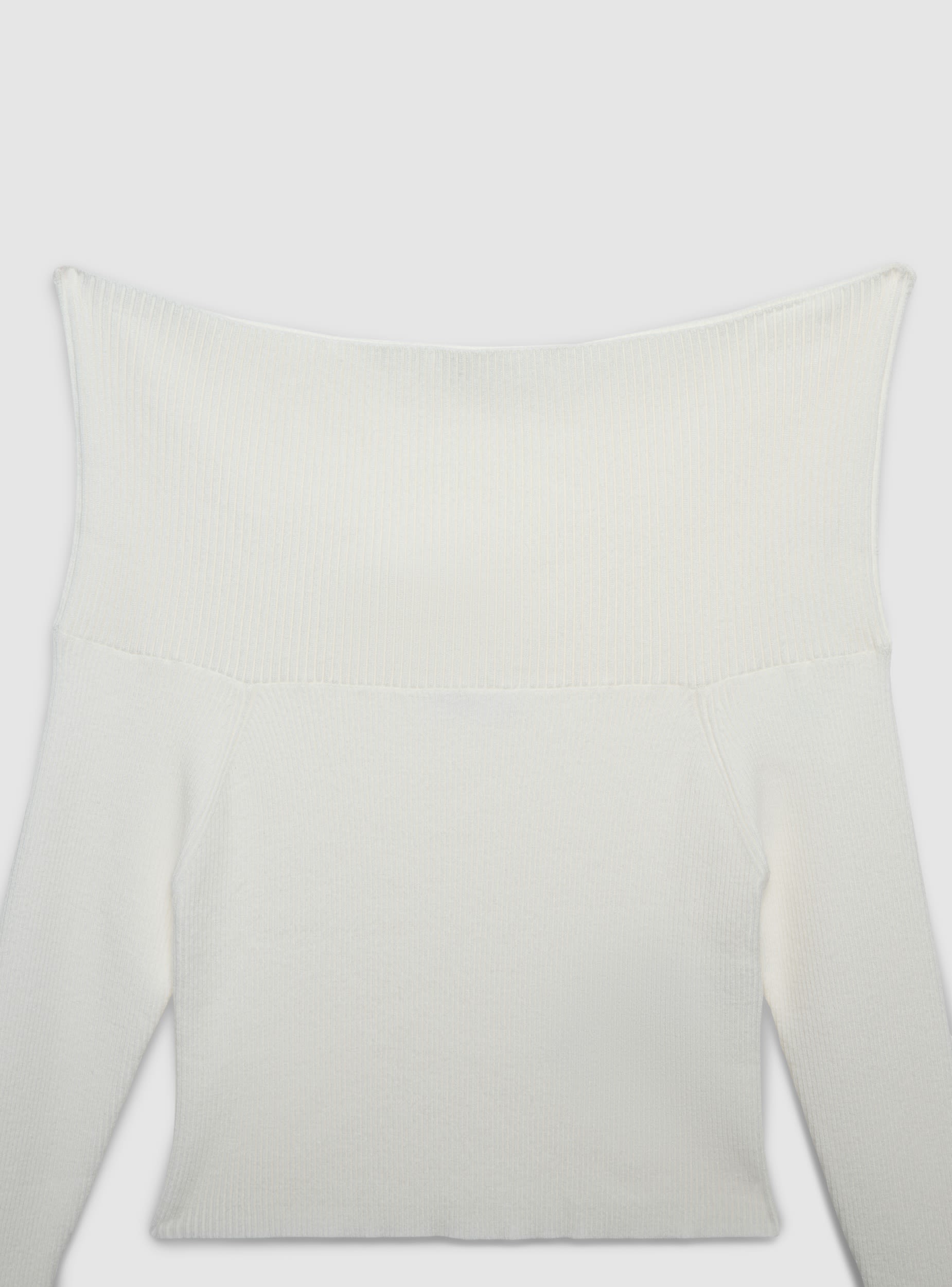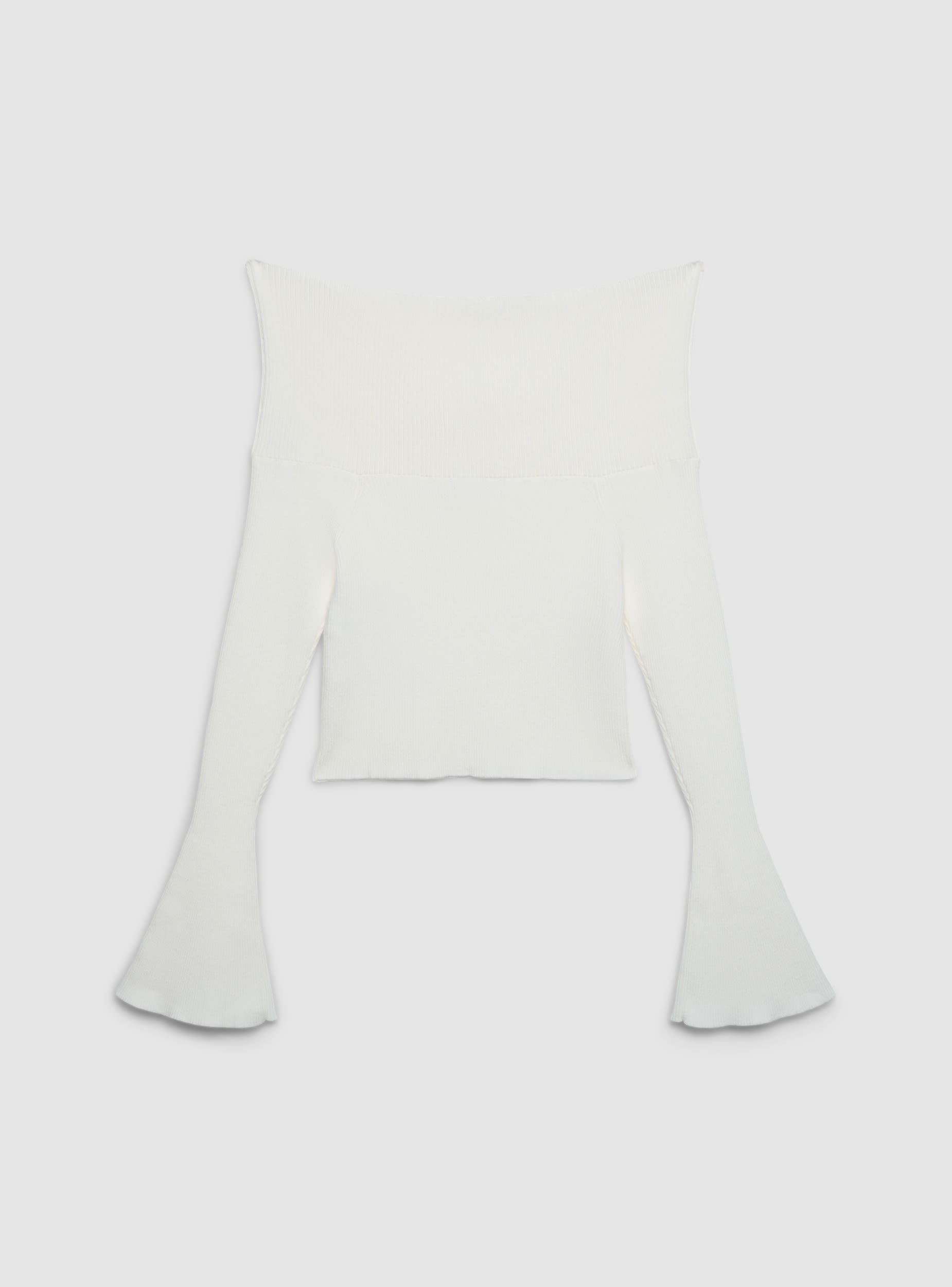 Maglia da donna crop a spalle scoperte, perfetta per look trendy e serate. Le maniche lunghe svasate aggiungono un tocco femminile. La lavorazione a coste nella parte superiore valorizza la silhouette. Vestibilità aderente sul busto. Tinta unita facile da abbinare con jeans a vita alta, gonne midi o pantaloni eleganti.Dettagli