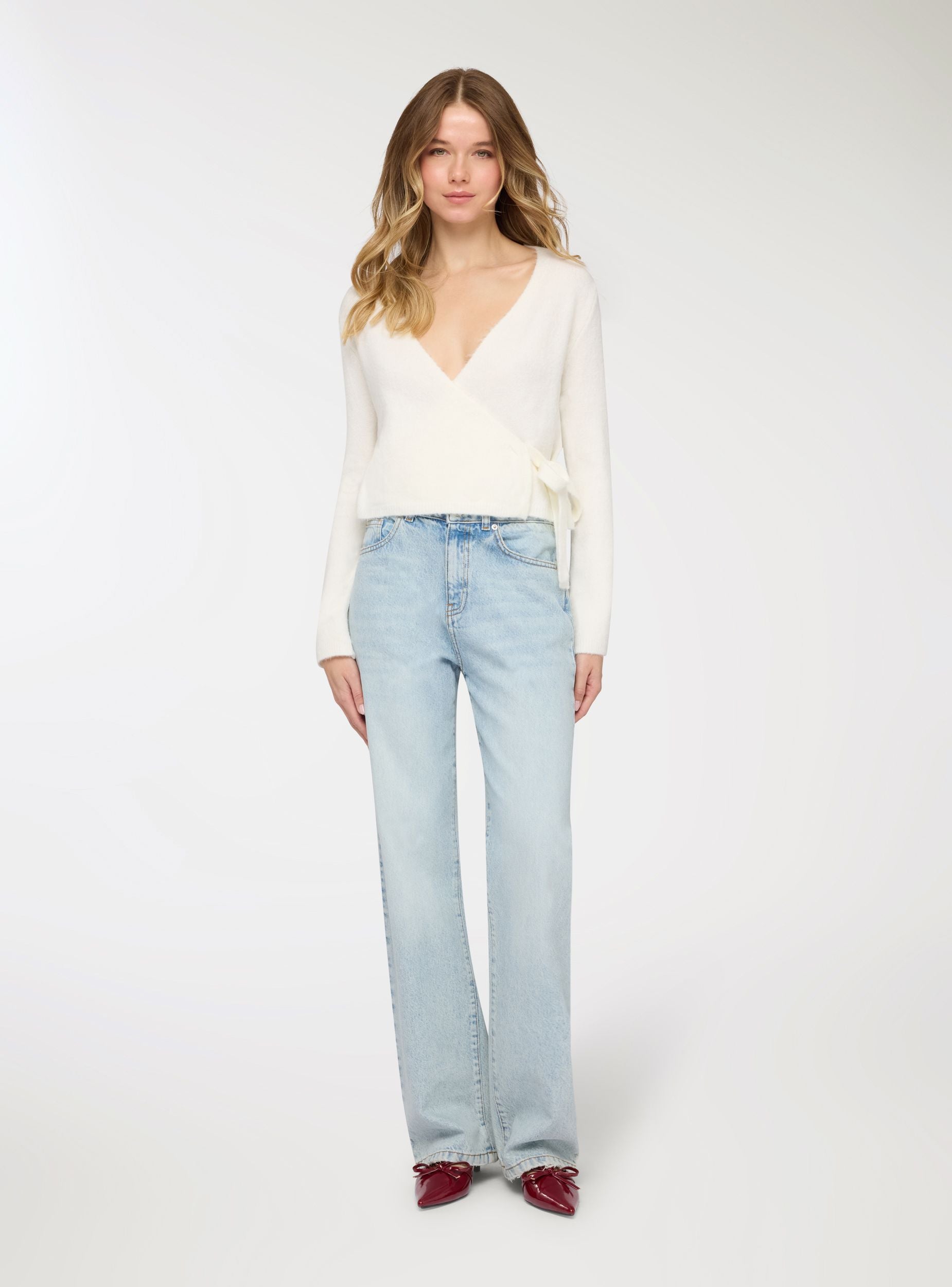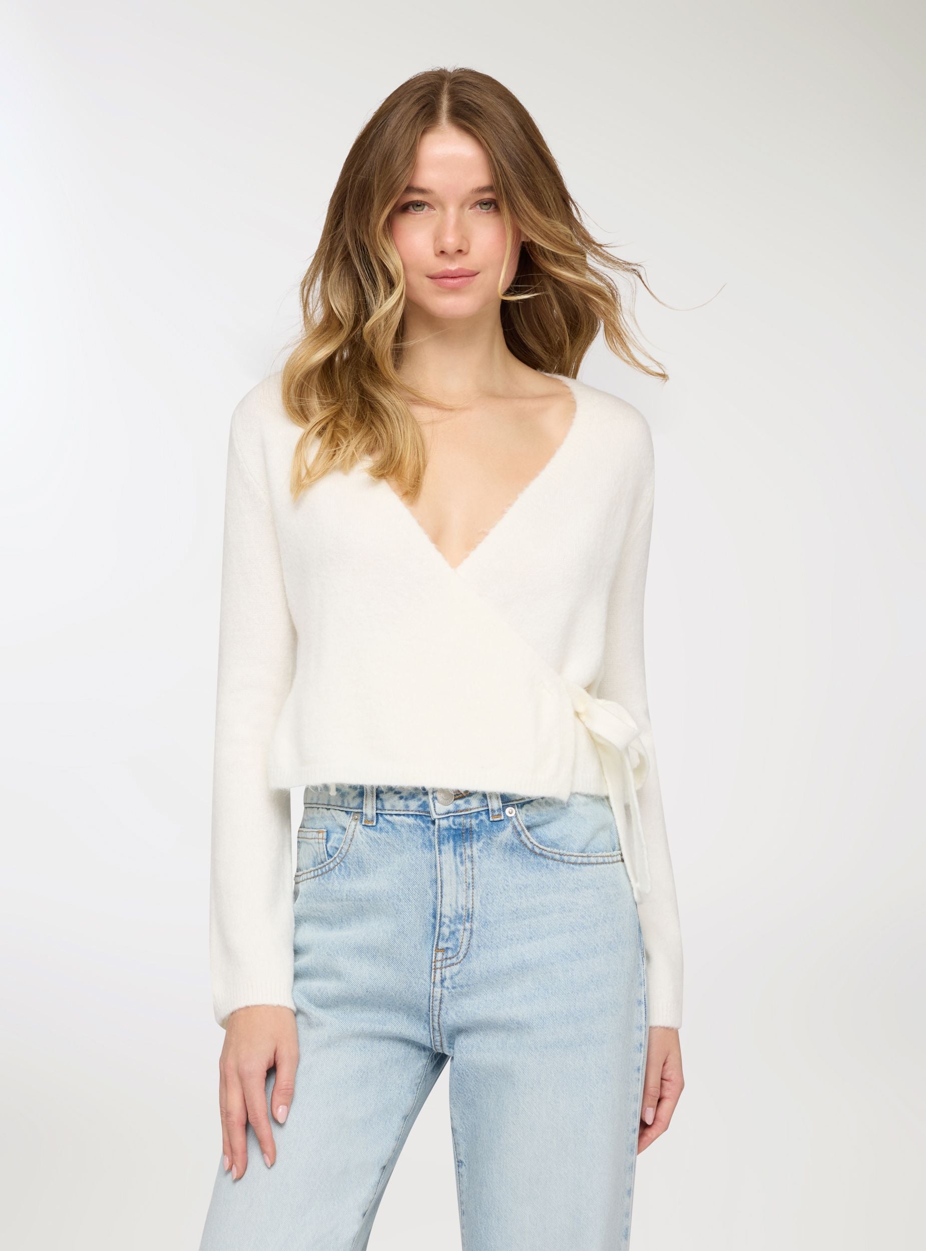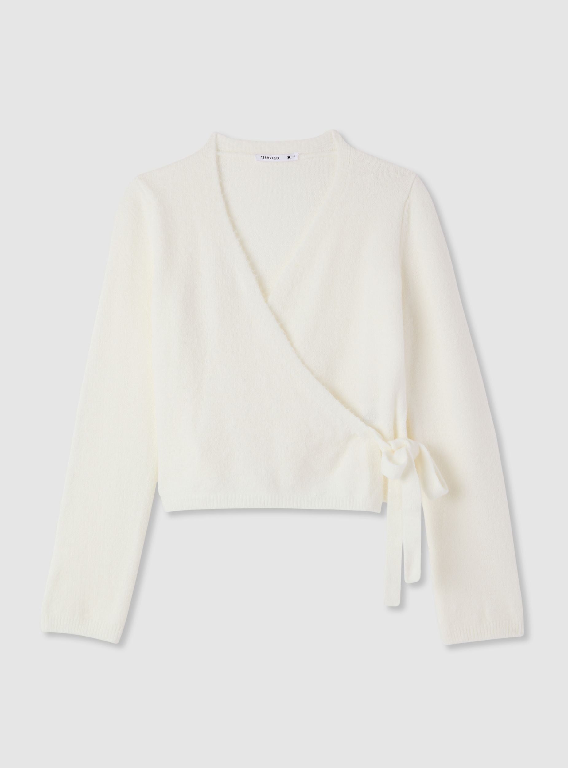 Maglia da donna a tinta unita, modello scalda cuore, con scollo a V e chiusura con fiocco laterale. Maniche lunghe, ideale per valorizzare vita alta e gonne midi. Perfetta per il tempo libero e look trendy, si abbina a jeans o pantaloni sartoriali. Bordo a coste sull’orlo e polsi, vestibilità comoda che segue le linee senza costringere.Dettagli