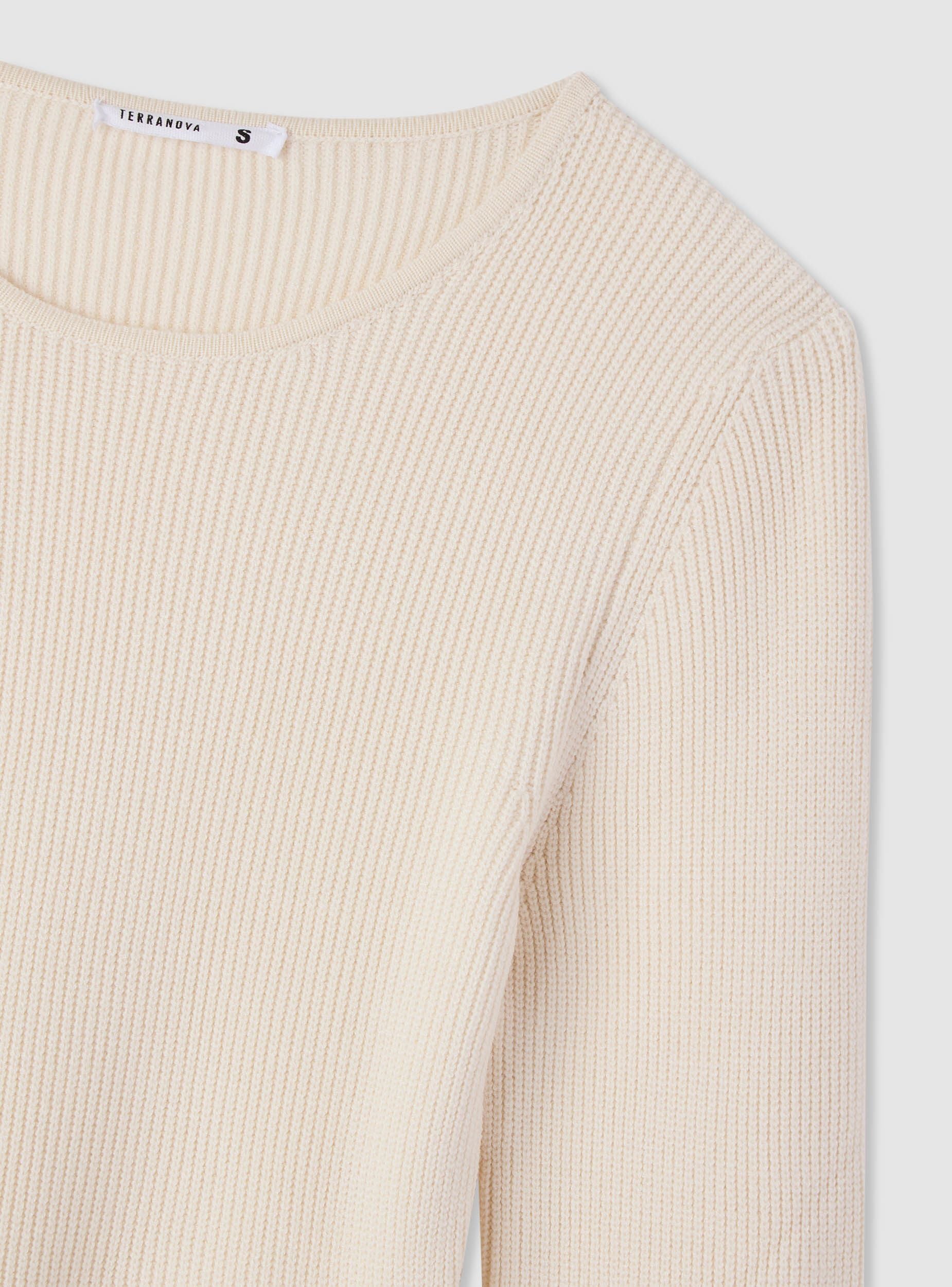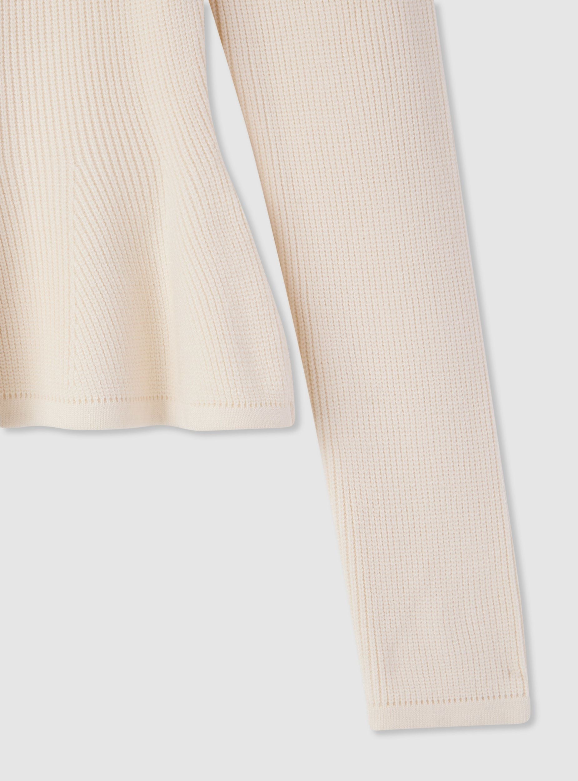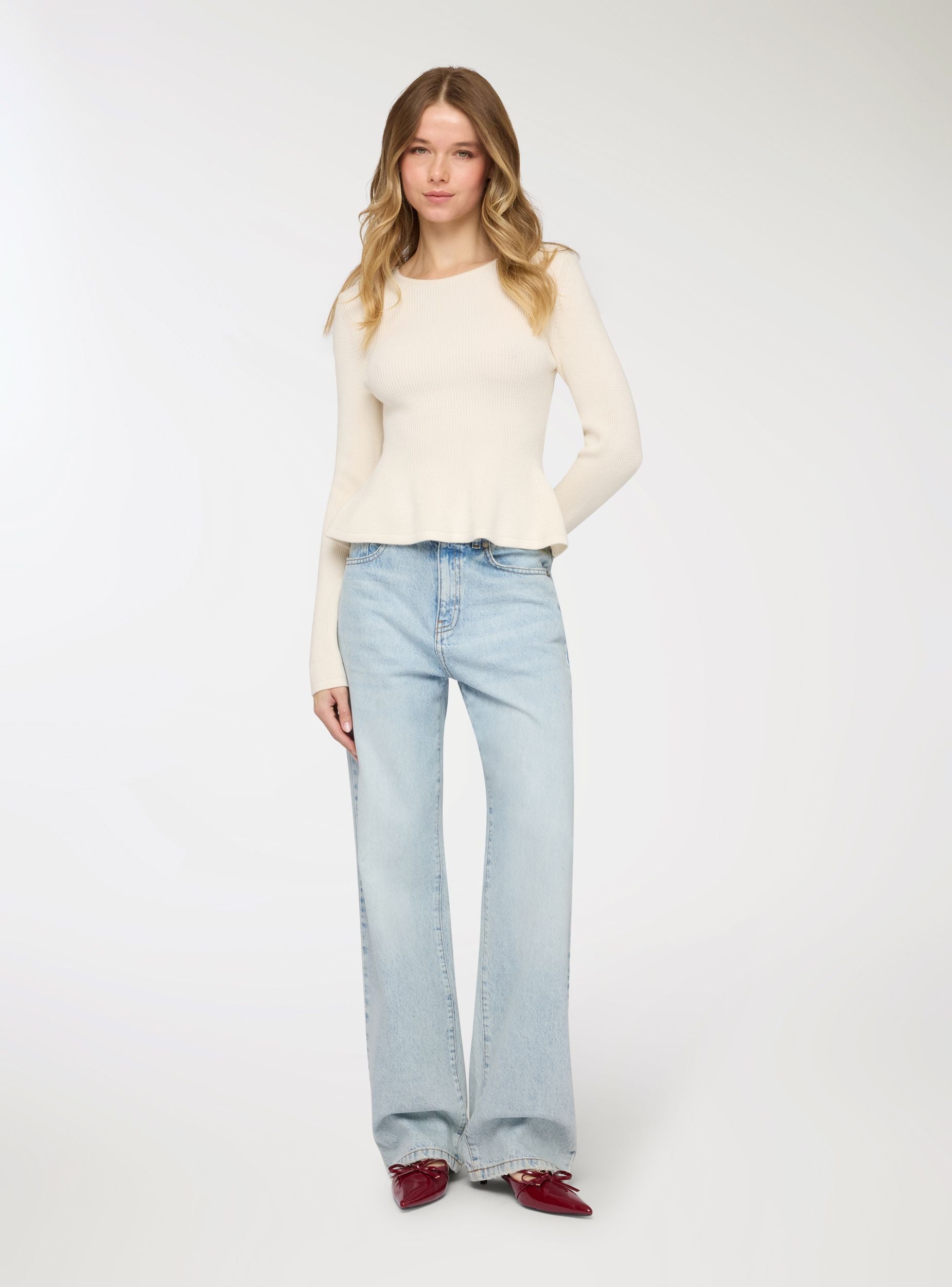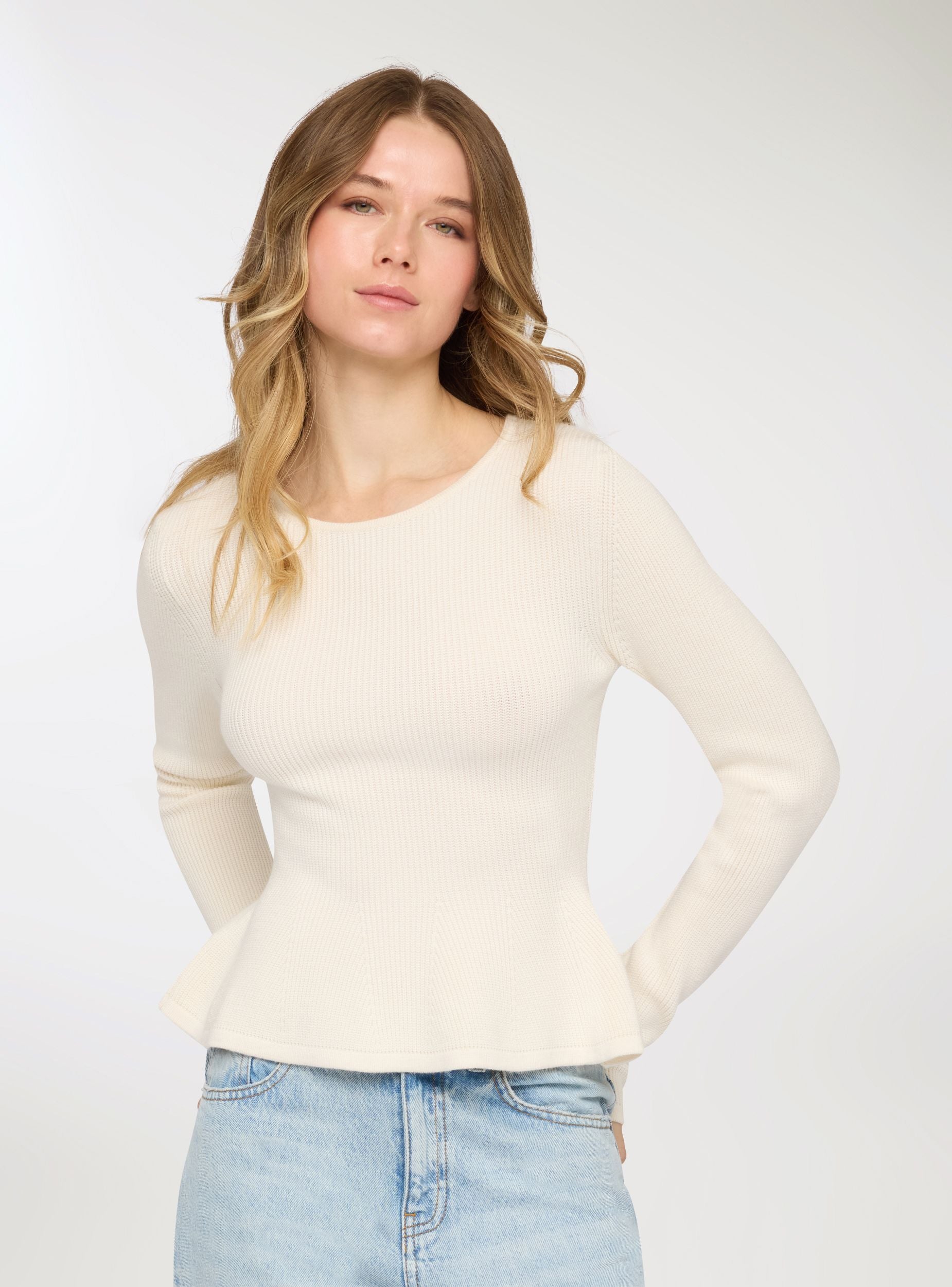 Maglia da donna a tinta unita con scollo rotondo e maniche lunghe. Lavorazione a coste che valorizza la silhouette e fondo peplum leggermente svasato per un tocco femminile. Perfetta per outfit casual o trendy con jeans e stivali, si indossa anche sotto giacche e cardigan. Vestibilità regular, ideale per il quotidiano e per ufficio informale.Dettagli