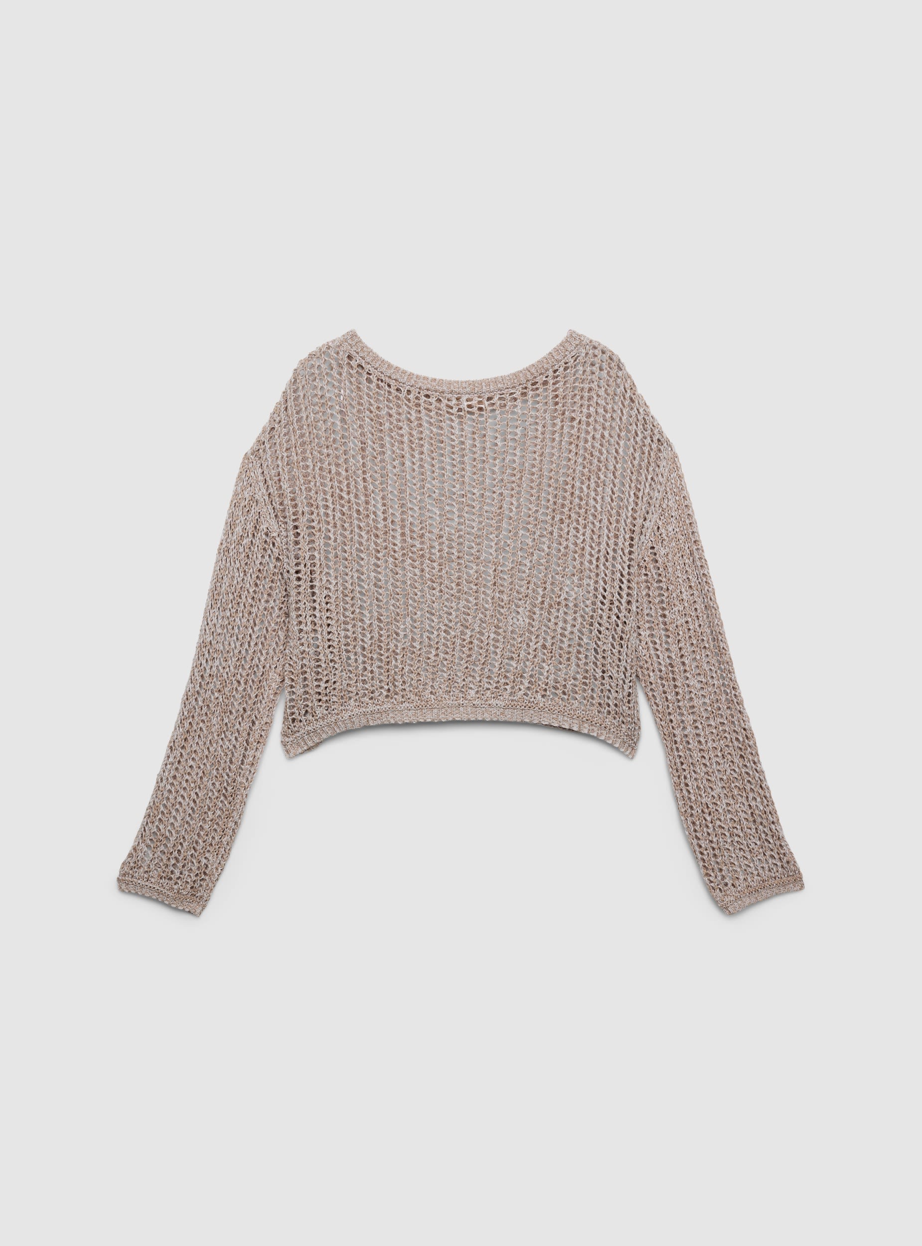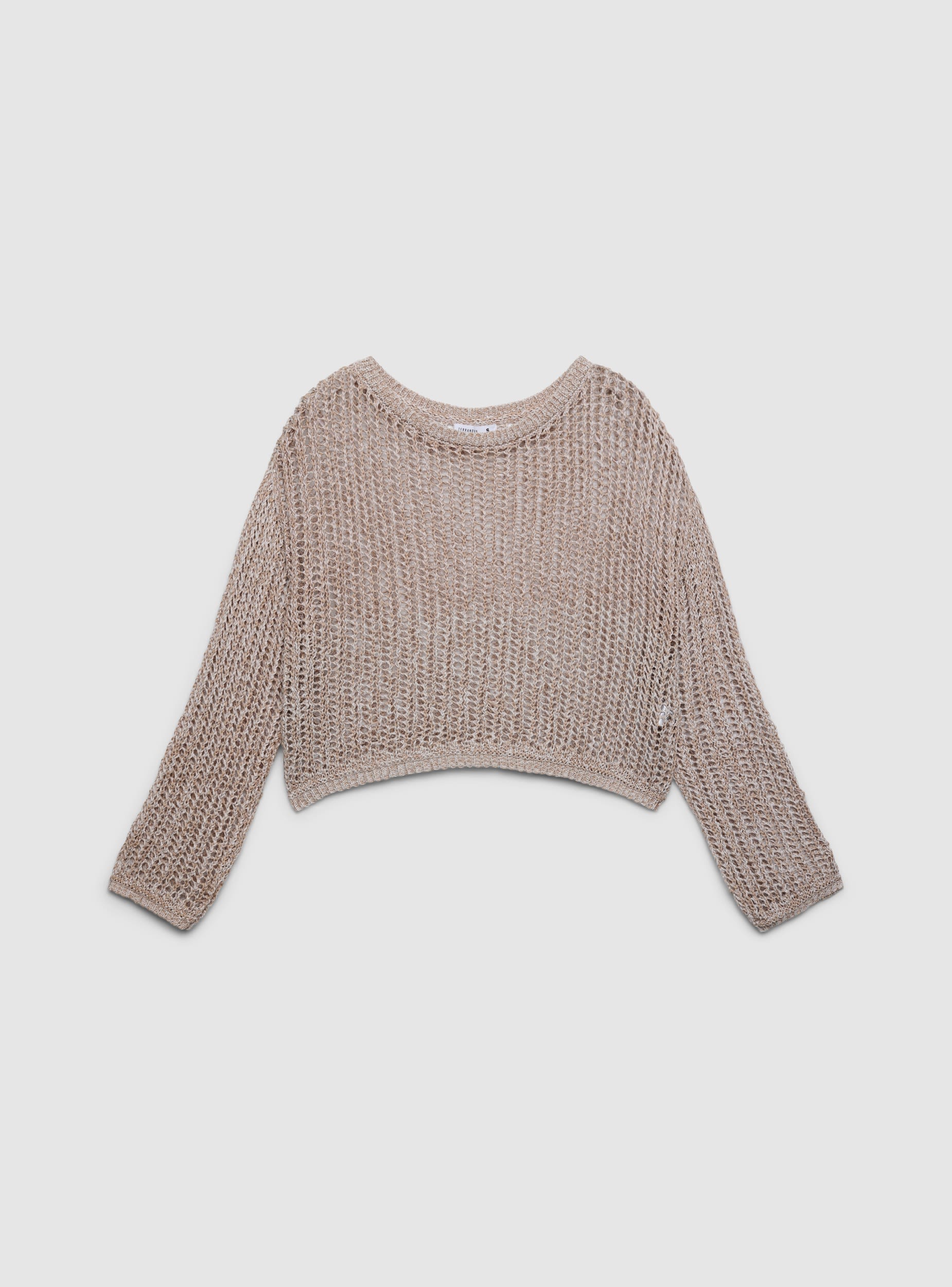 Maglia da donna a tinta unita con lavorazione traforata, vestibilità crop e scollo a barca. Maniche lunghe e profilo rifinito in maglia. Perfetta sopra top aderenti o bralette per look urbani, si abbina a jeans a vita alta o gonne. Il design leggero la rende ideale per la mezza stagione e serate informali.Dettagli