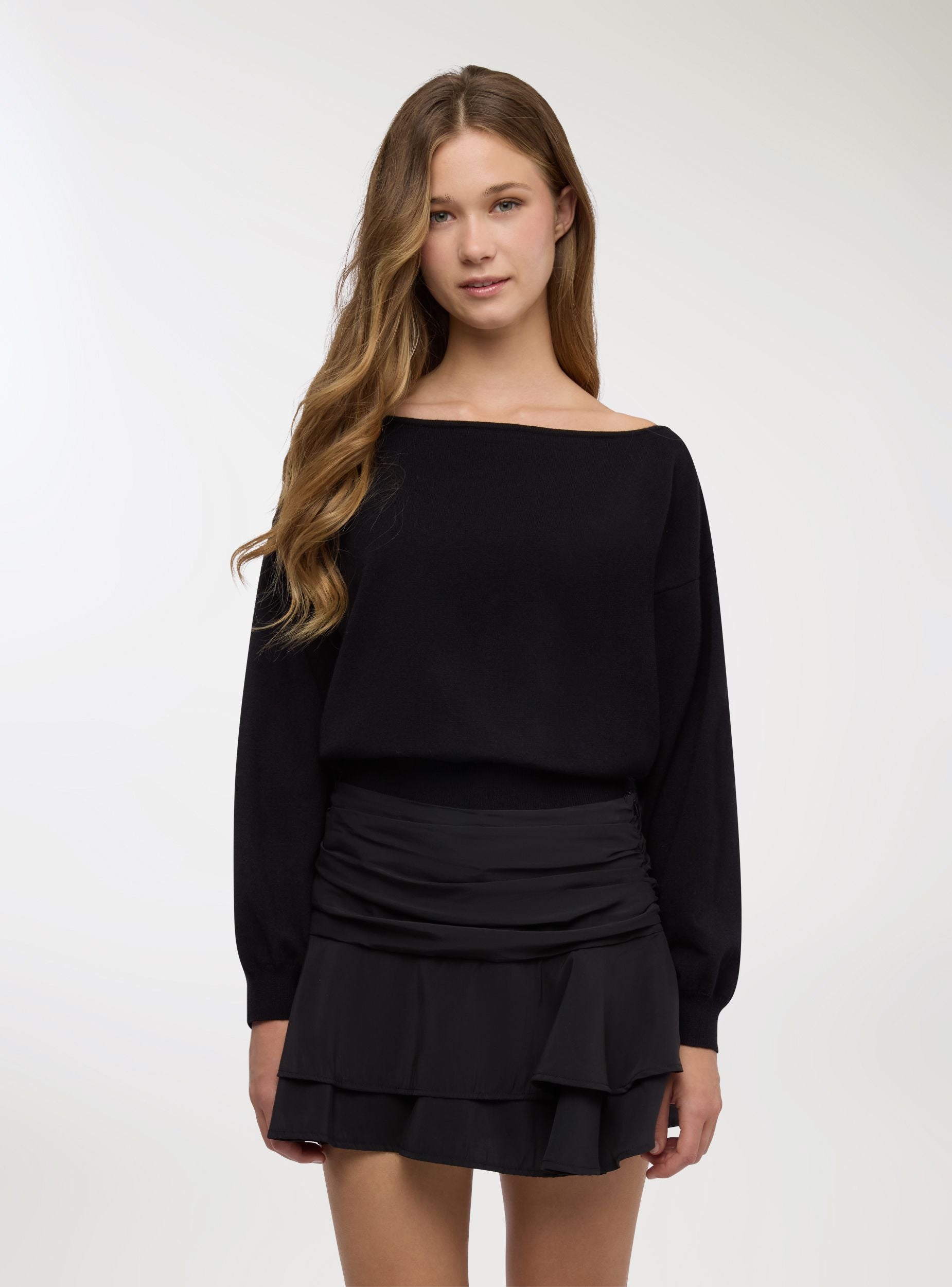 Maglia da donna a tinta unita con scollo ampio e maniche lunghe. Il bordo ampio in maglia crea una fascia in vita che definisce la silhouette con vestibilità regolare. Perfetta per l’ufficio o il tempo libero, si abbina a jeans a vita alta o a una gonna midi. Polsini e fondo a coste offrono comfort e una linea pulita, ideale da indossare sotto blazer o capispalla leggeri.Dettagli