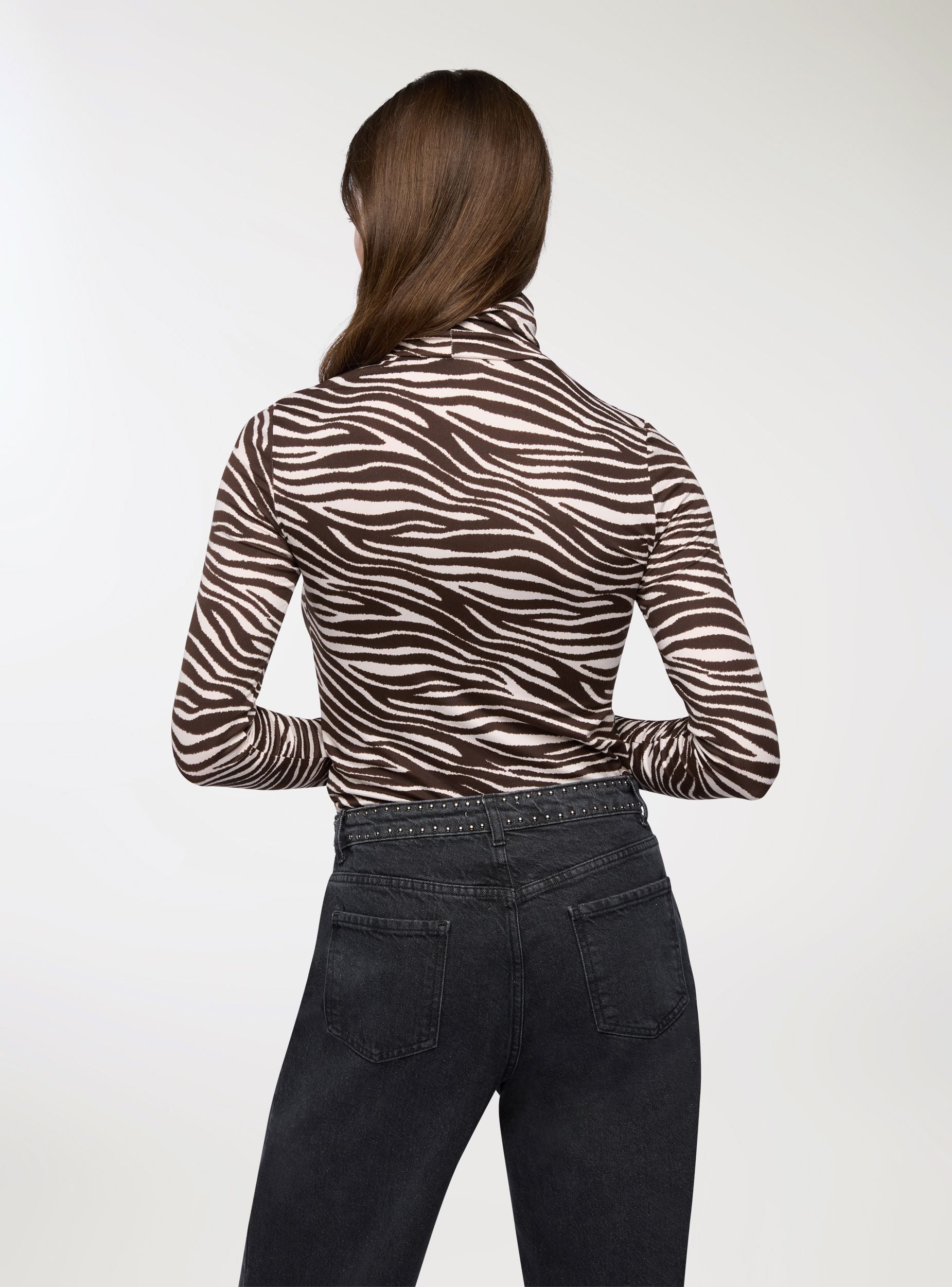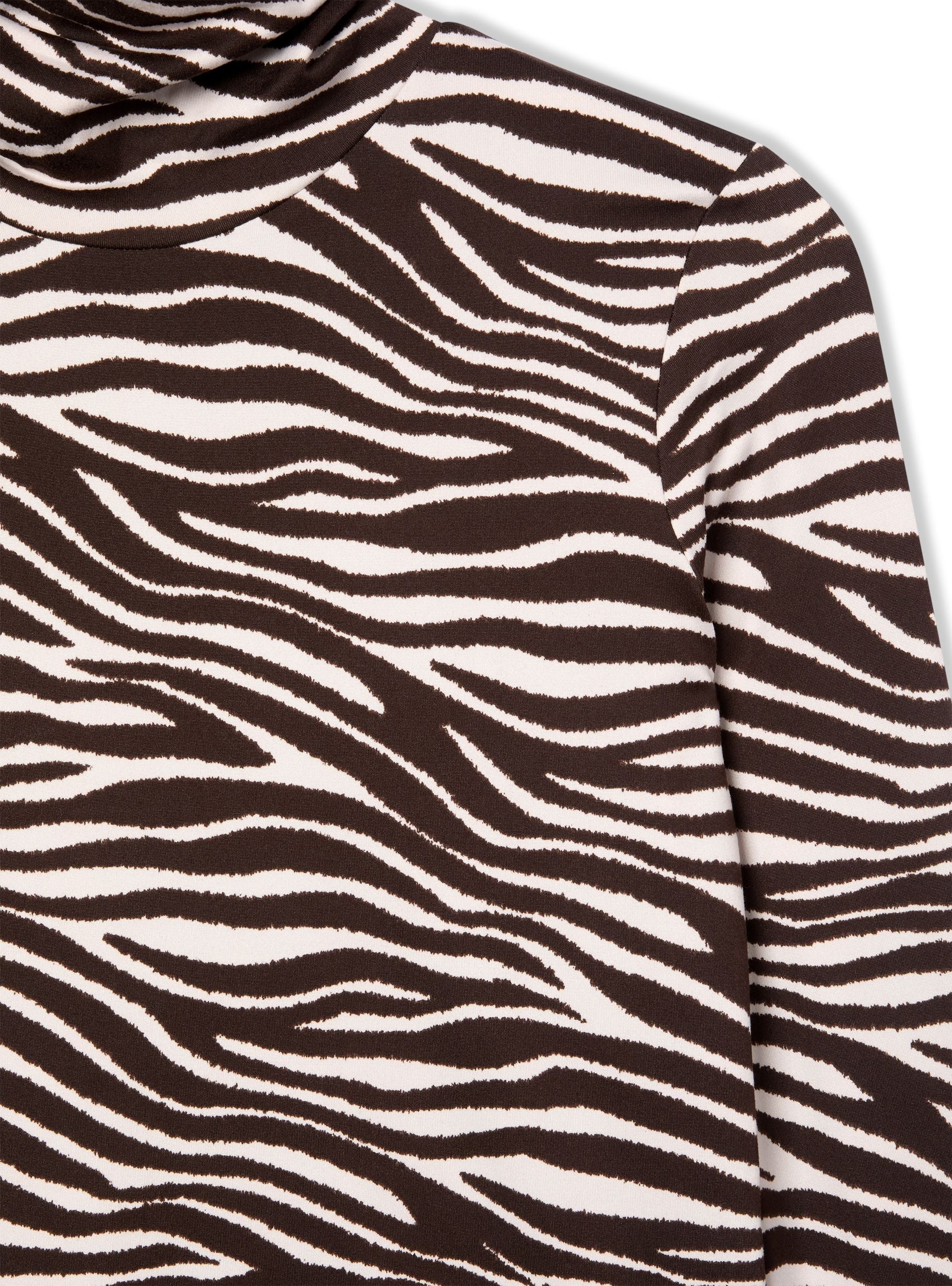 Maglietta da donna a maniche lunghe. Tessuto morbido con stampa zebrata, perfetta per look urban e per dare carattere agli outfit quotidiani. Il collo alto aggiunge un tocco raffinato e protegge nelle giornate fresche, mentre la vestibilità regolare la rende comoda sotto blazer, cardigan o giacche. Design pulito senza chiusure e profilo dritto al fondo. Ideale con jeans, minigonne o pantaloni sartoriali per passare dal giorno alla sera.
