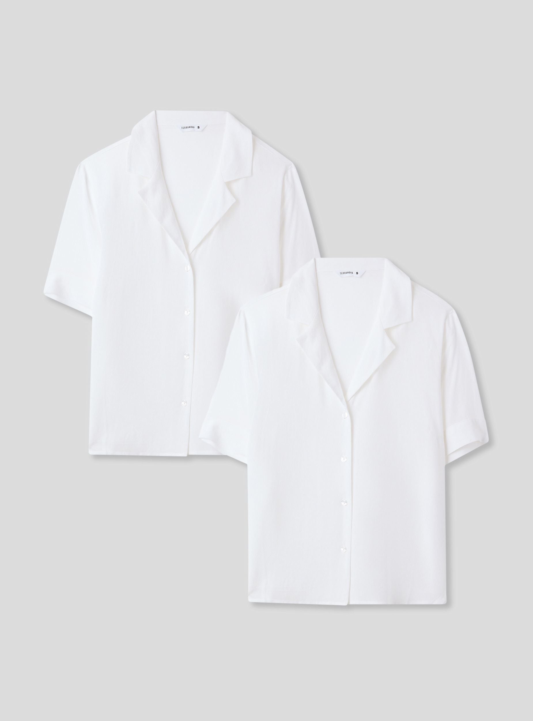 Confezione composta da 2 camicie da donna ideali per un look casual chic. Caratterizzate da un design ampio e confortevole, presentano una tinta unita versatile, maniche corte per un tocco estivo e una chiusura con bottoni che dona praticità. Il colletto a revers aggiunge un dettaglio elegante, rendendole perfette per abbinamenti con pantaloni o gonne sia per il giorno che per la sera.Dettagli