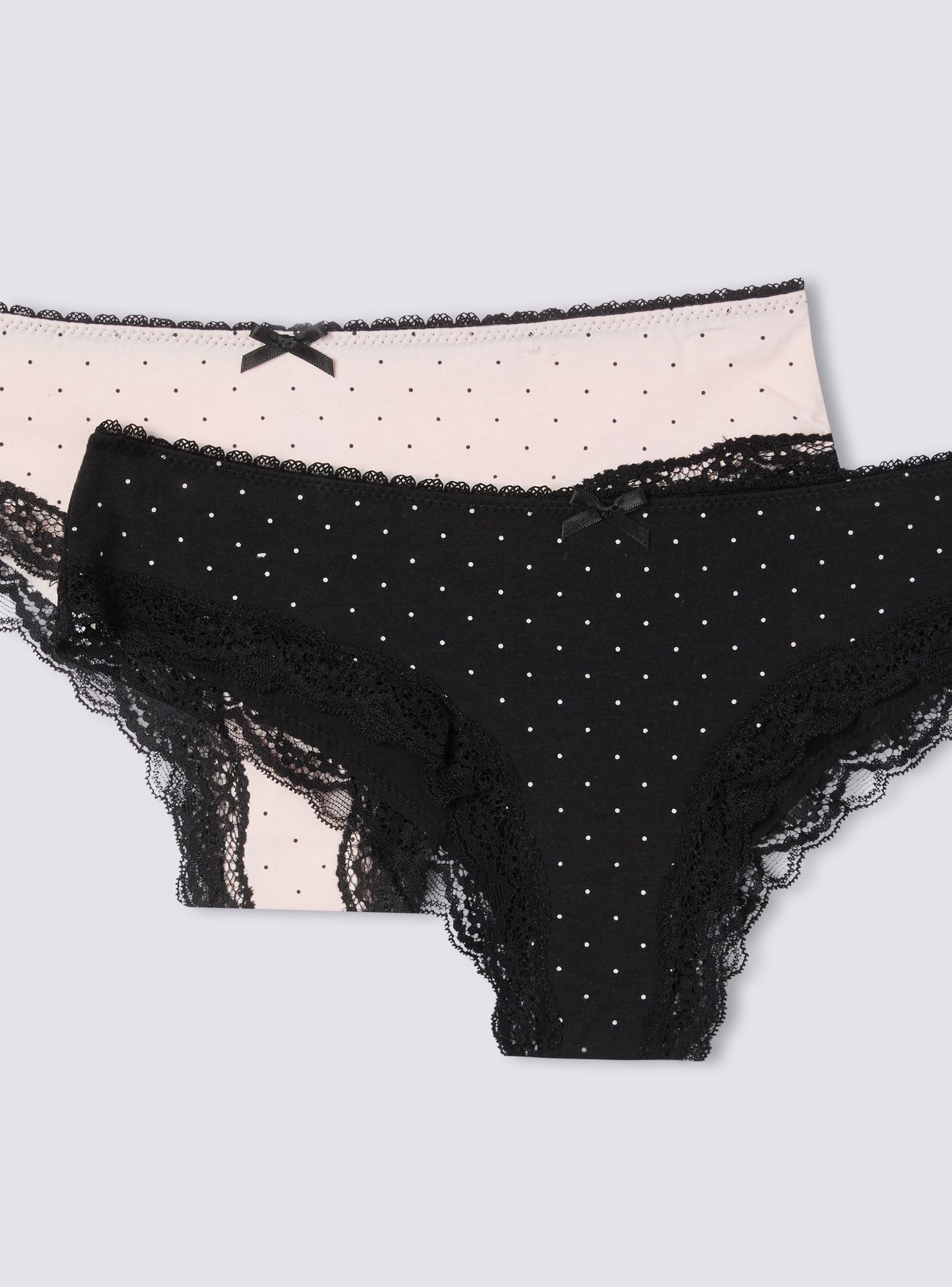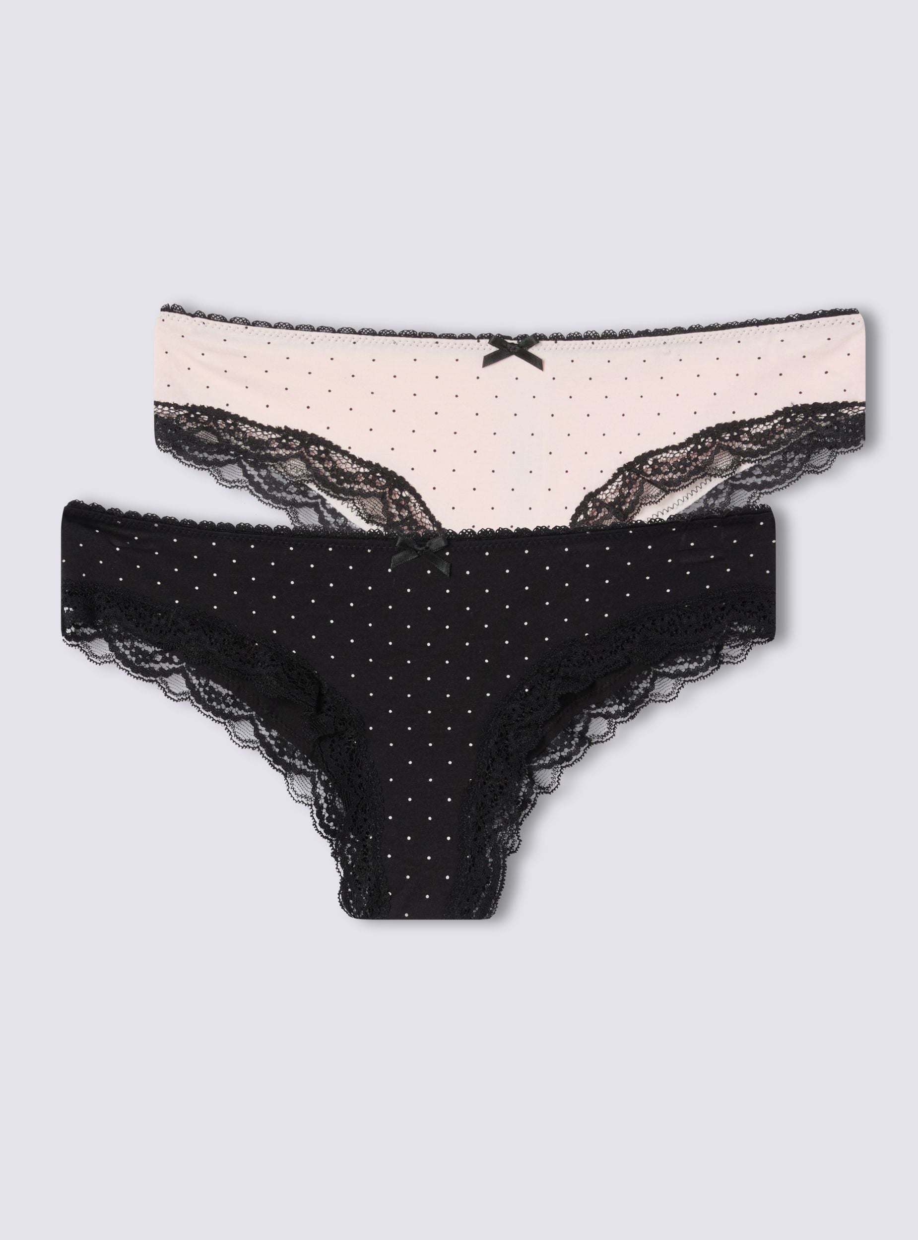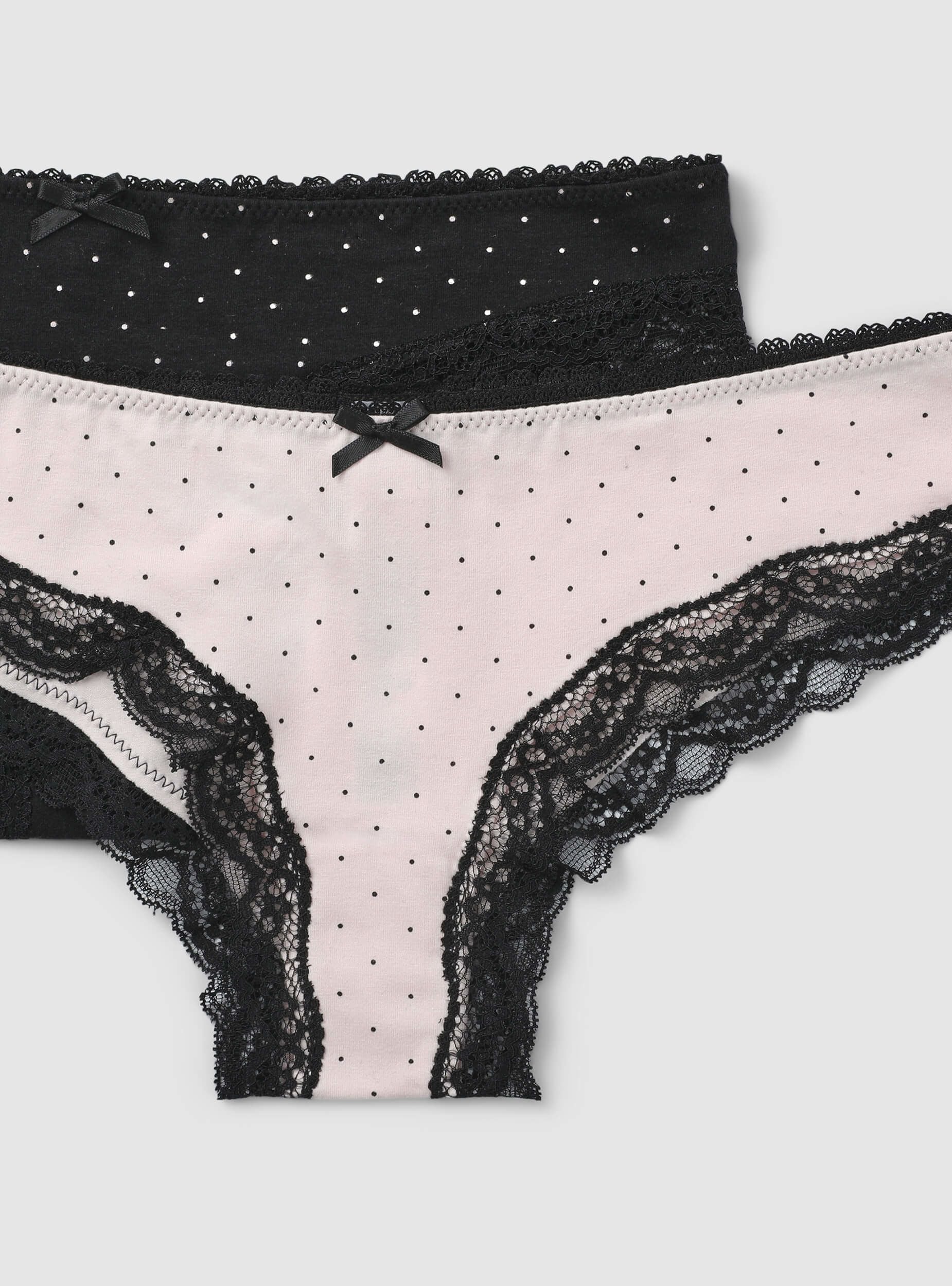 Confezione composta da 2 slip da donna dal design femminile e raffinato. Entrambi i modelli sono decorati con delicati motivi a pois e arricchiti da dettagli in pizzo che valorizzano la linea. Il fiocco aggiunge un tocco di grazia e stile. Ideali per chi cerca un intimo elegante e confortevole, perfetto per ogni momento della giornata.Dettagli