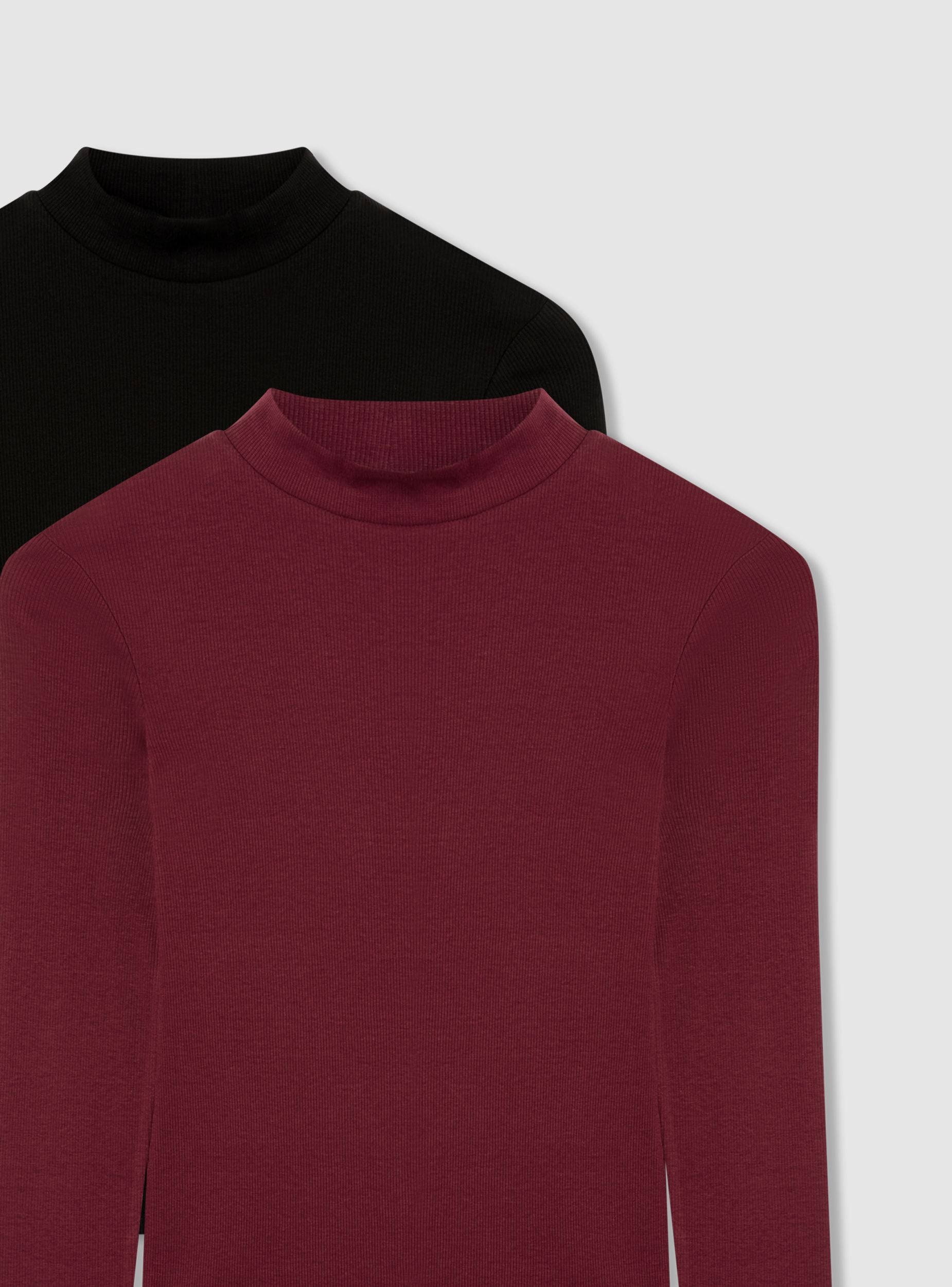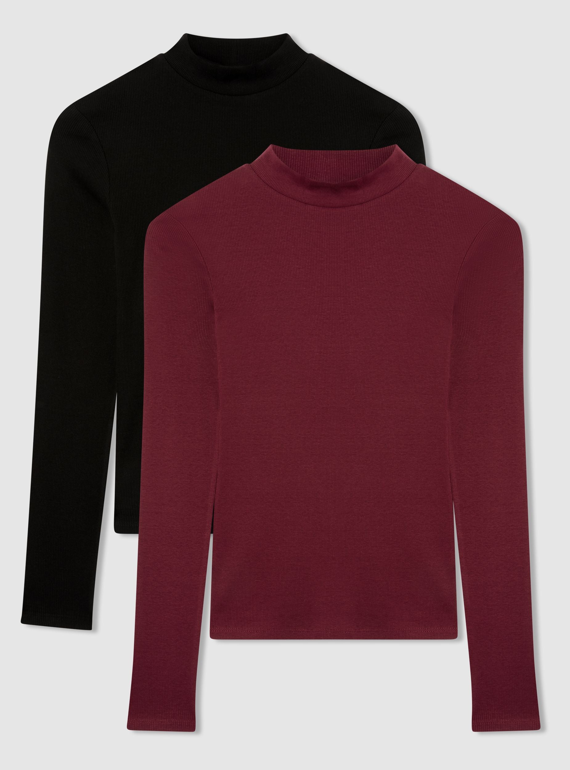 Confezione composta da 2 maglie a maniche lunghe da donna in cotone a tinta unita. Capo basic perfetto per qualunque occasione. Realizzate con un tessuto morbido e traspirante, offrono un comfort eccezionale. Il design presenta un elegante collo alto e una vestibilità aderente, ideale da indossare sotto giacche o blazer. Indispensabile nel guardaroba di ogni donna.Dettagli