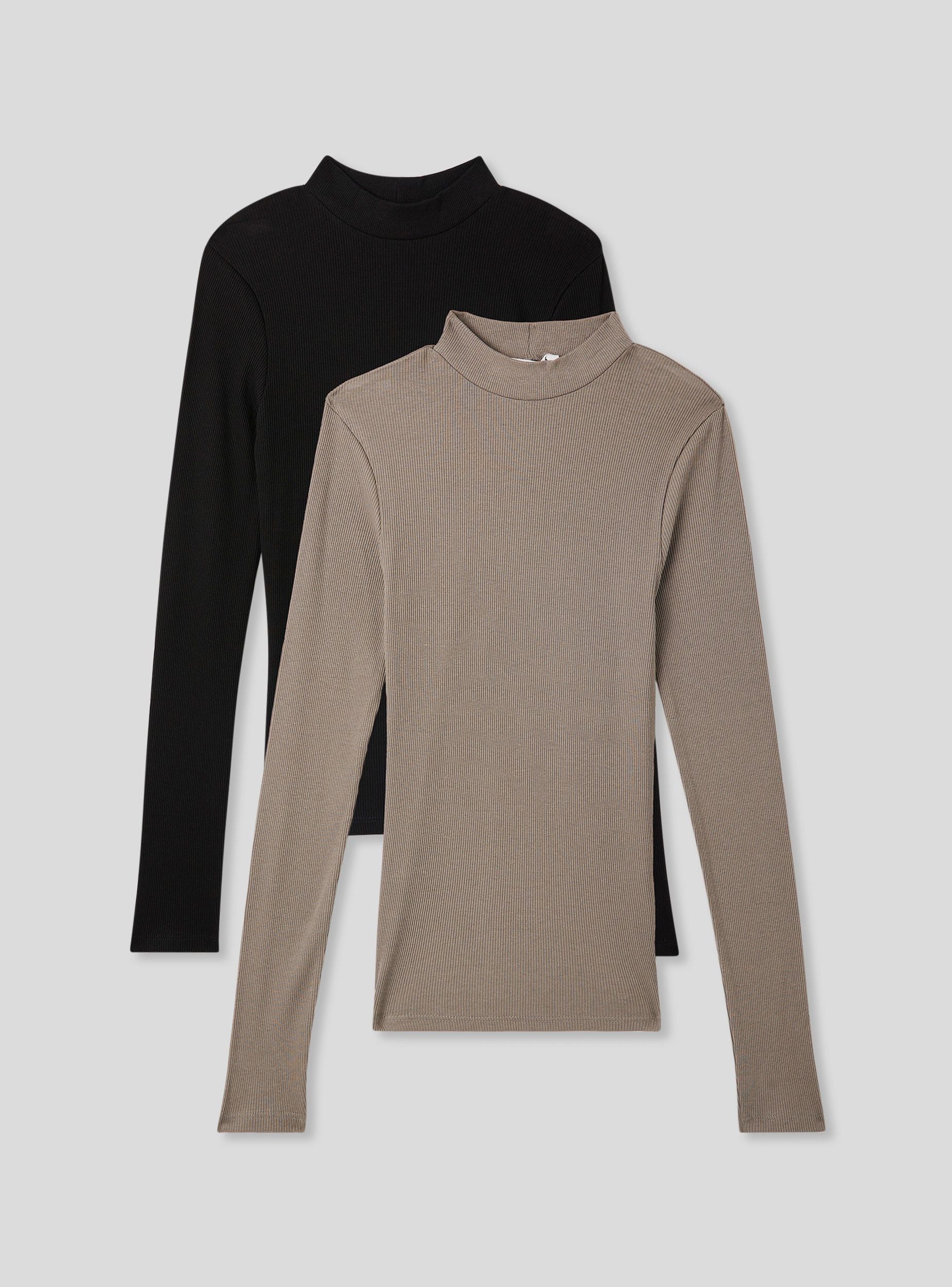 Confezione composta da 2 maglie a maniche lunghe da donna in cotone a tinta unita. Capo basic perfetto per qualunque occasione. Realizzate con un tessuto morbido e traspirante, offrono un comfort eccezionale. Il design presenta un elegante collo alto e una vestibilità aderente, ideale da indossare sotto giacche o blazer. Indispensabile nel guardaroba di ogni donna.