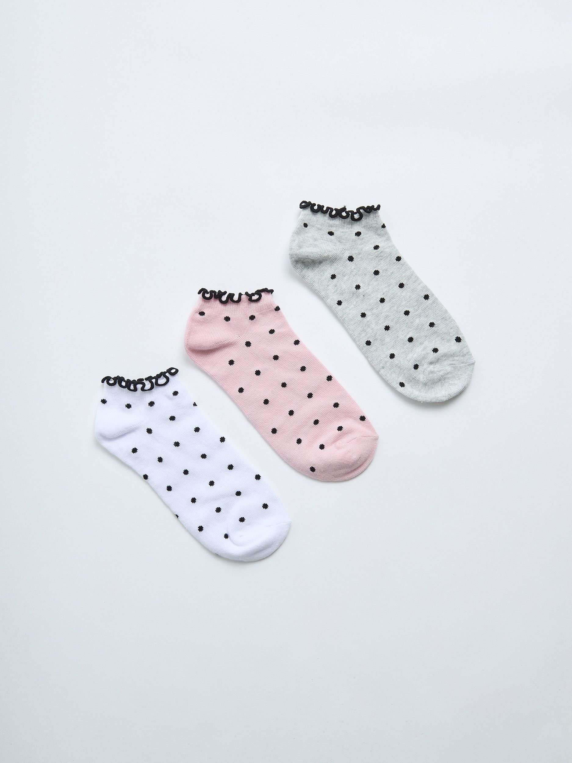 Confezione composta da 3 paia di calzini corti da donna, tre colorazioni differenti con fantasia a pois, e bordo con volant.Dettagli