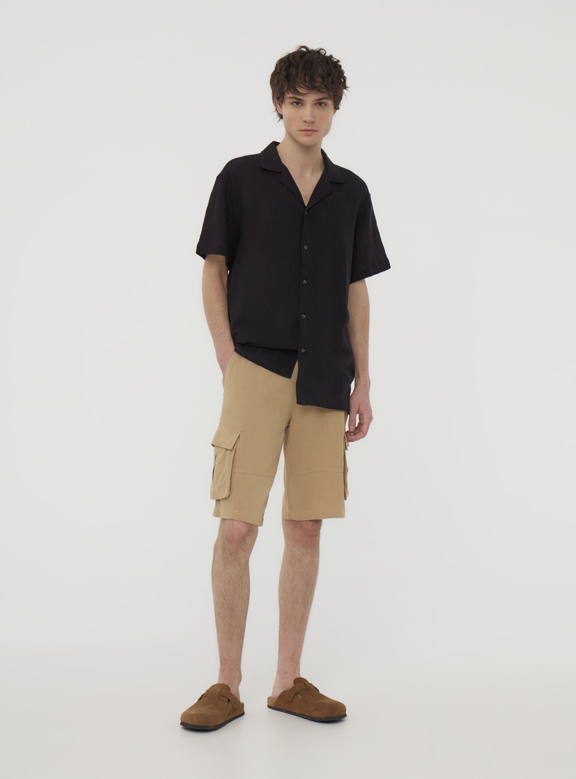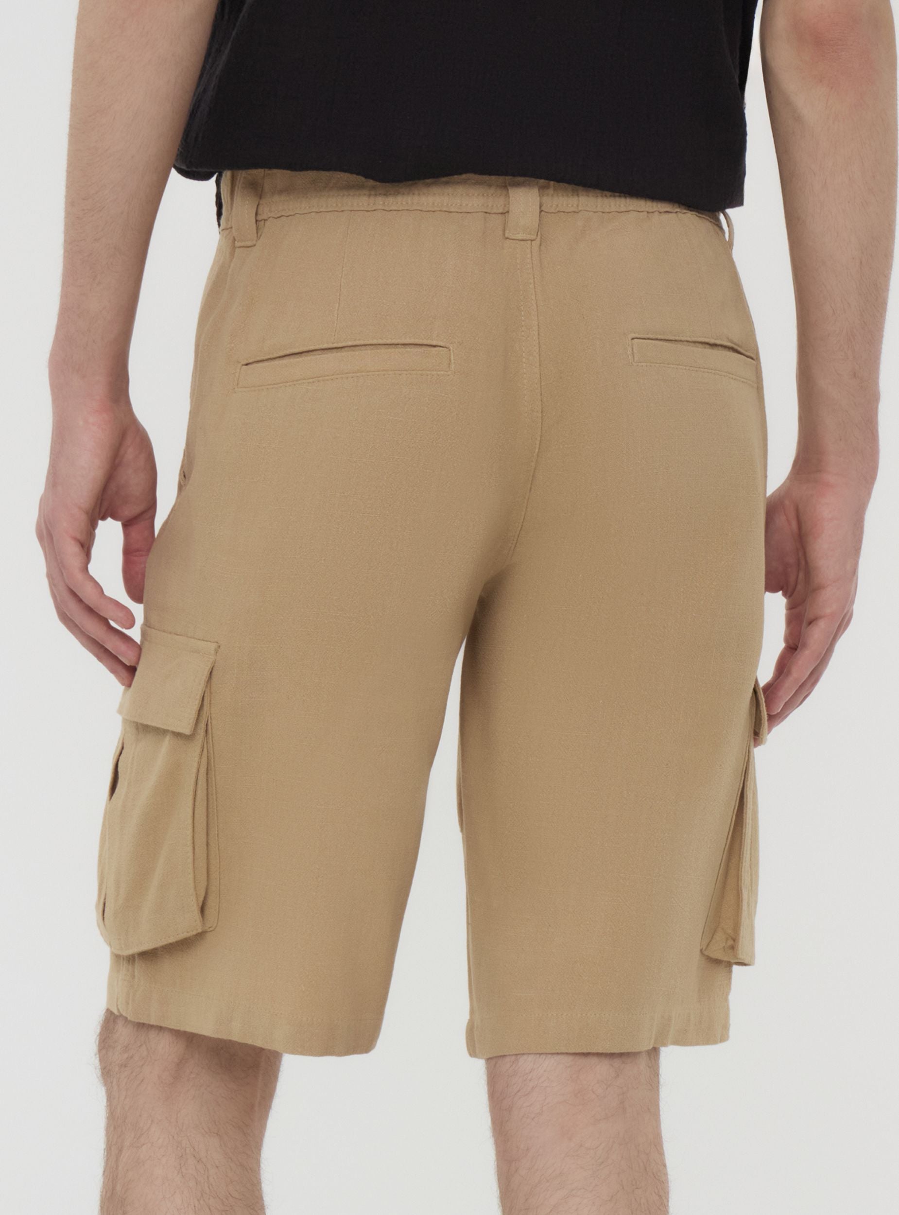 Pantaloncini corti da uomo realizzati in tessuto misto lino a tinta unita, ideali per un look casual e pratico, perfetti per il tempo libero o per un outfit estivo. Caratterizzati da una vestibilità regolare, presentano tasche cargo laterali e chiusura con bottone. Un capo versatile e funzionale per chi cerca comfort e stile in ogni occasione.Dettagli