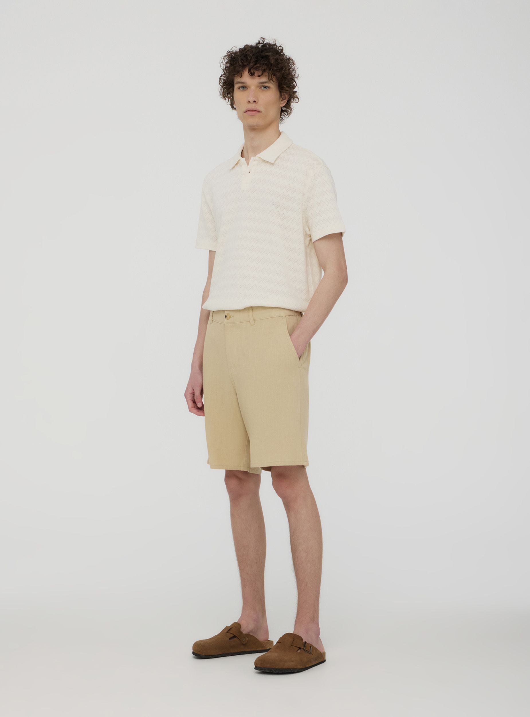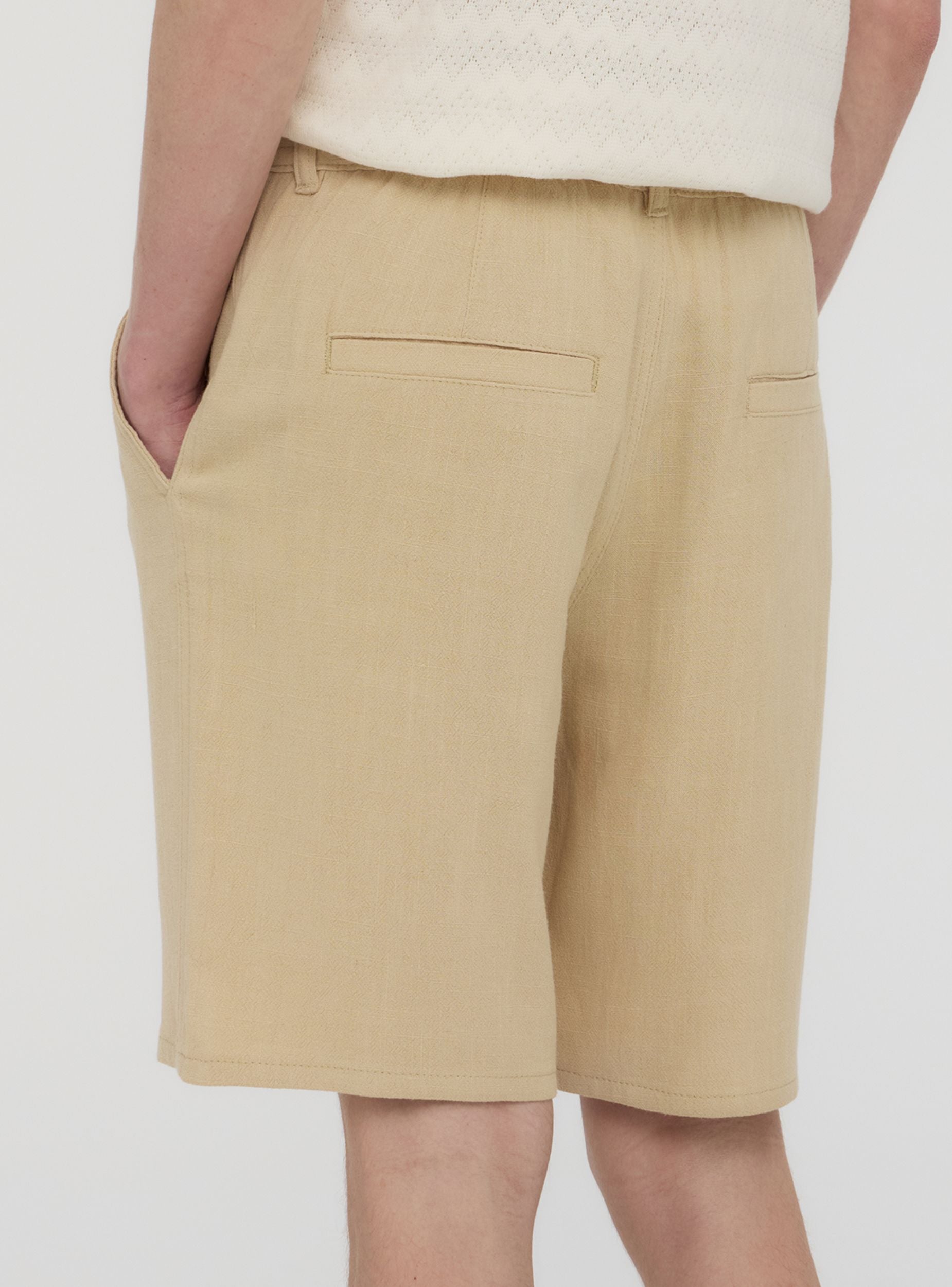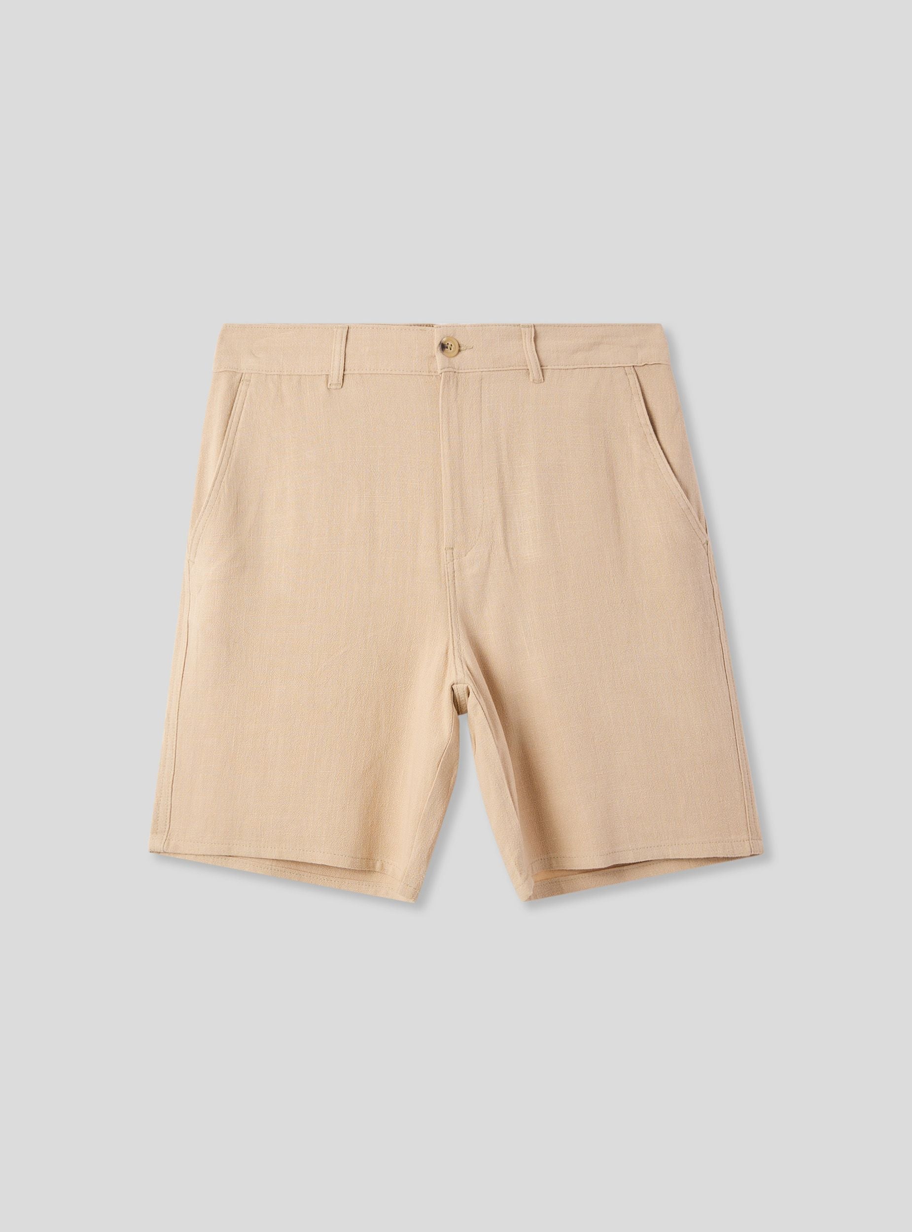 Pantaloncini da uomo in misto lino ideali per un look casual e rilassato, perfetti per il tempo libero o per giornate estive. Caratterizzati da una vestibilità regolare, presentano una chiusura con bottone e tasche laterali inclinate. Un capo versatile e confortevole, adatto a molteplici occasioni informali.Dettagli