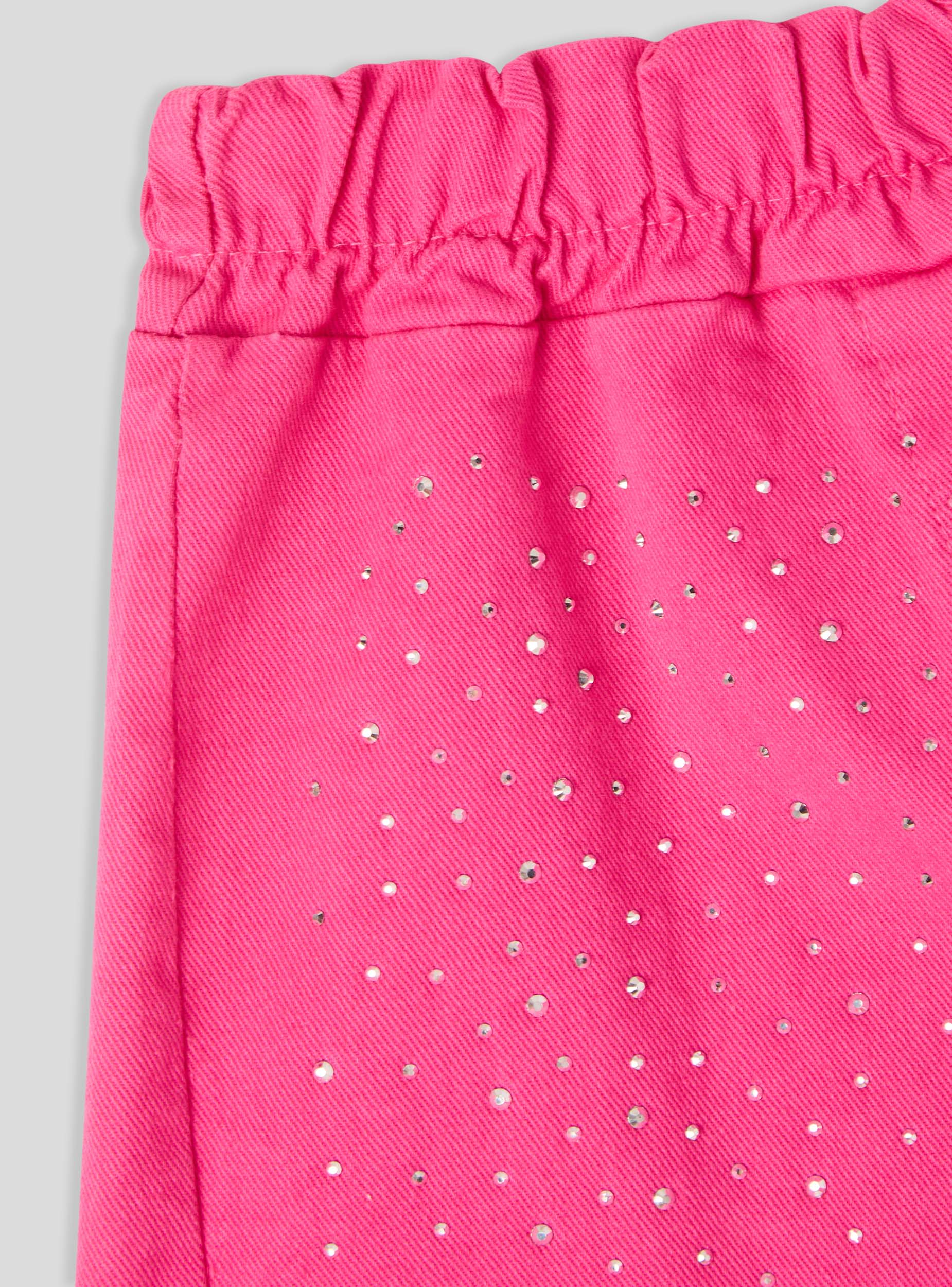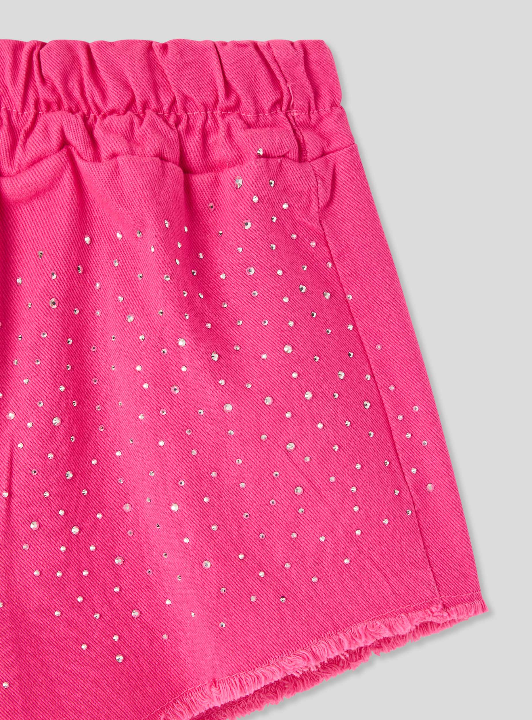 Pantaloncini da bambina con applicazioni decorative di strass. Ideali per un look casual e comodo, questi pantaloncini presentano una vita elasticizzata per una vestibilità pratica e confortevole. Perfetti per essere abbinati a magliette o top per un outfit estivo. Le applicazioni aggiungono un tocco di stile unico, rendendoli adatti per diverse occasioni.Dettagli