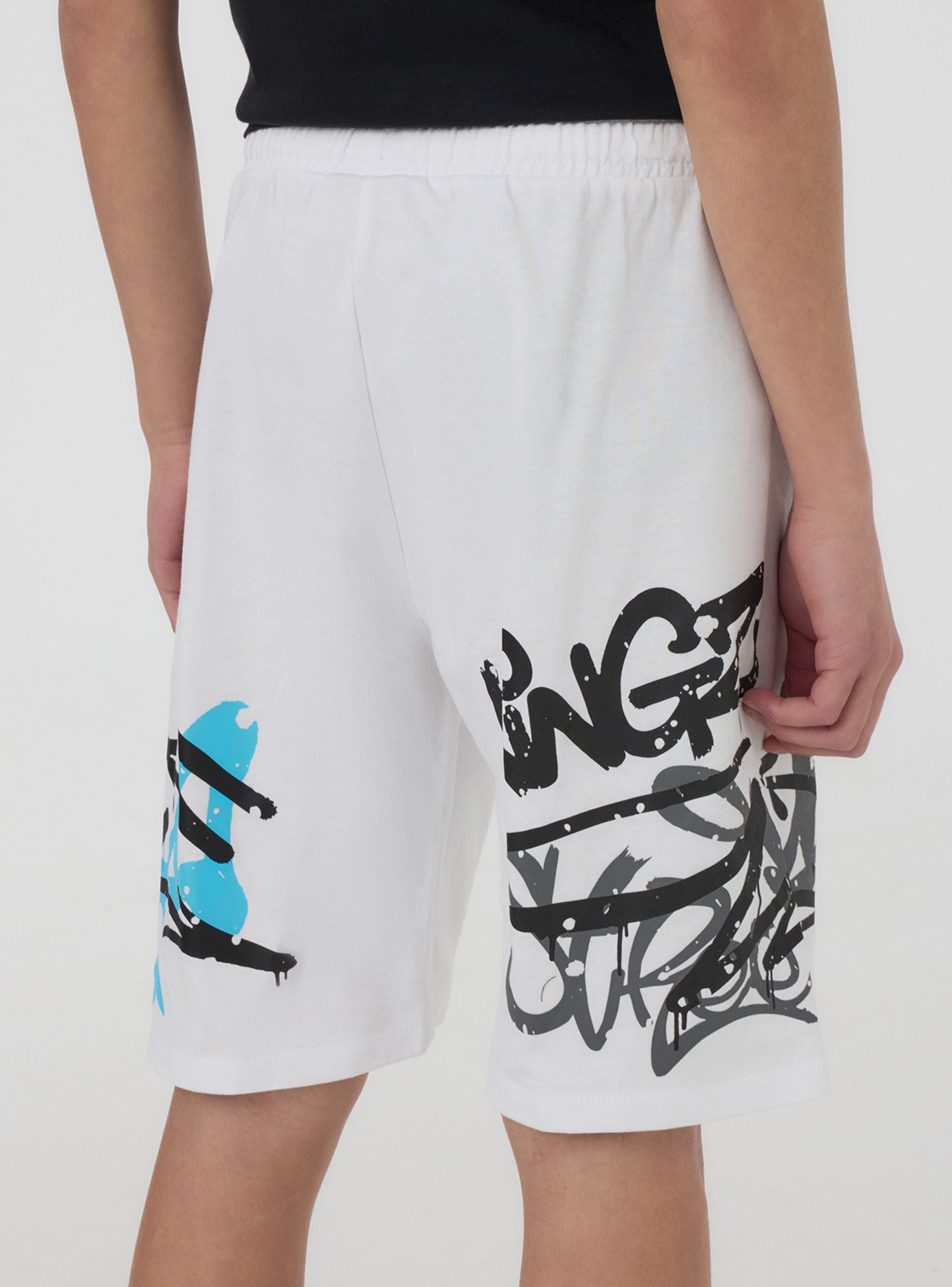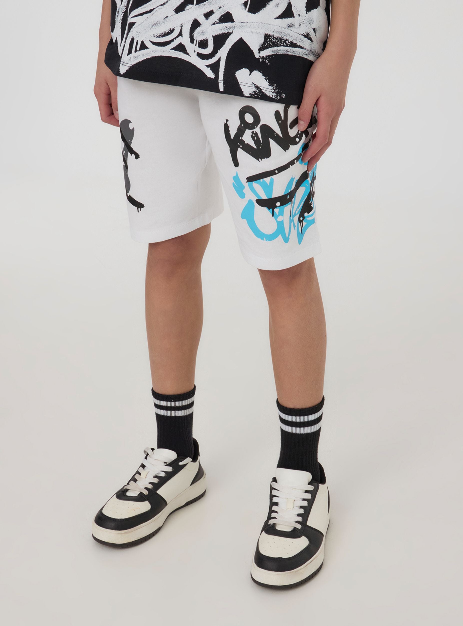 Pantaloncini della tuta leggeri da bambino perfetti per un look sportivo e vivace. Dotati di coulisse regolabile in vita per una vestibilità comoda, sono arricchiti da una stampa graffiti dallo stile urbano che aggiunge carattere e originalità. Ideali per il tempo libero, il gioco o le attività all'aperto, si abbinano facilmente a t-shirt e sneakers per un outfit dinamico e alla moda.Dettagli
