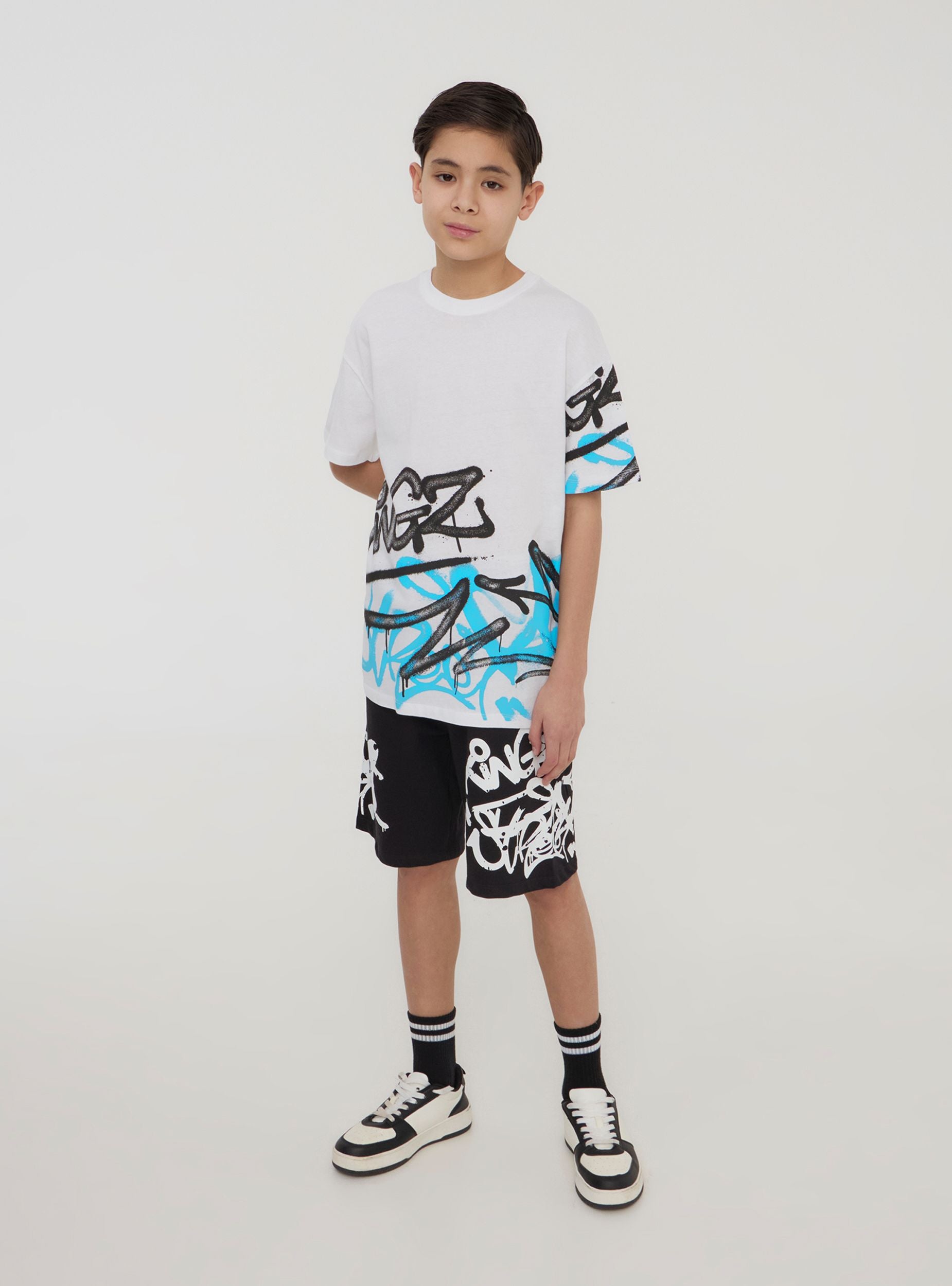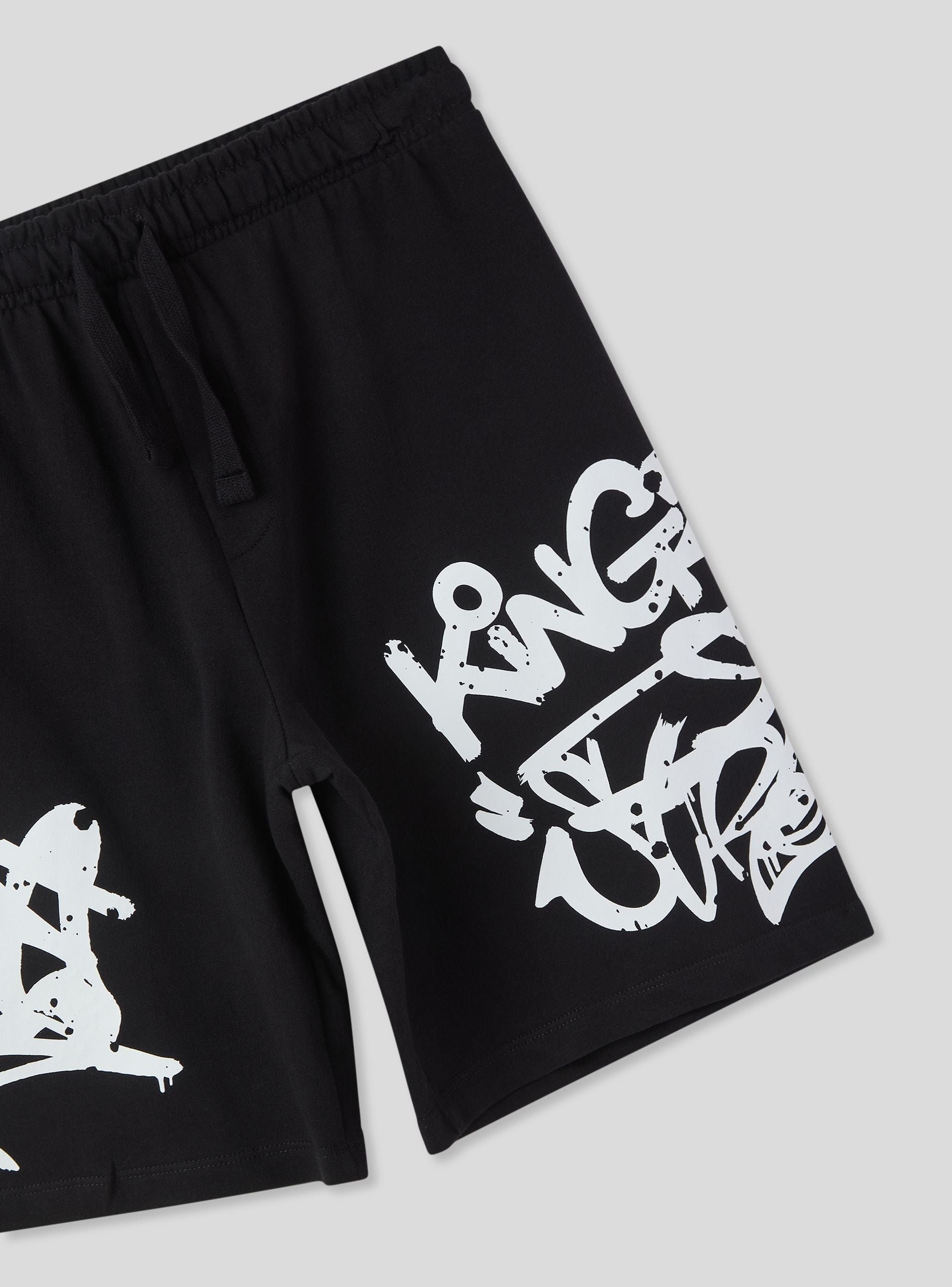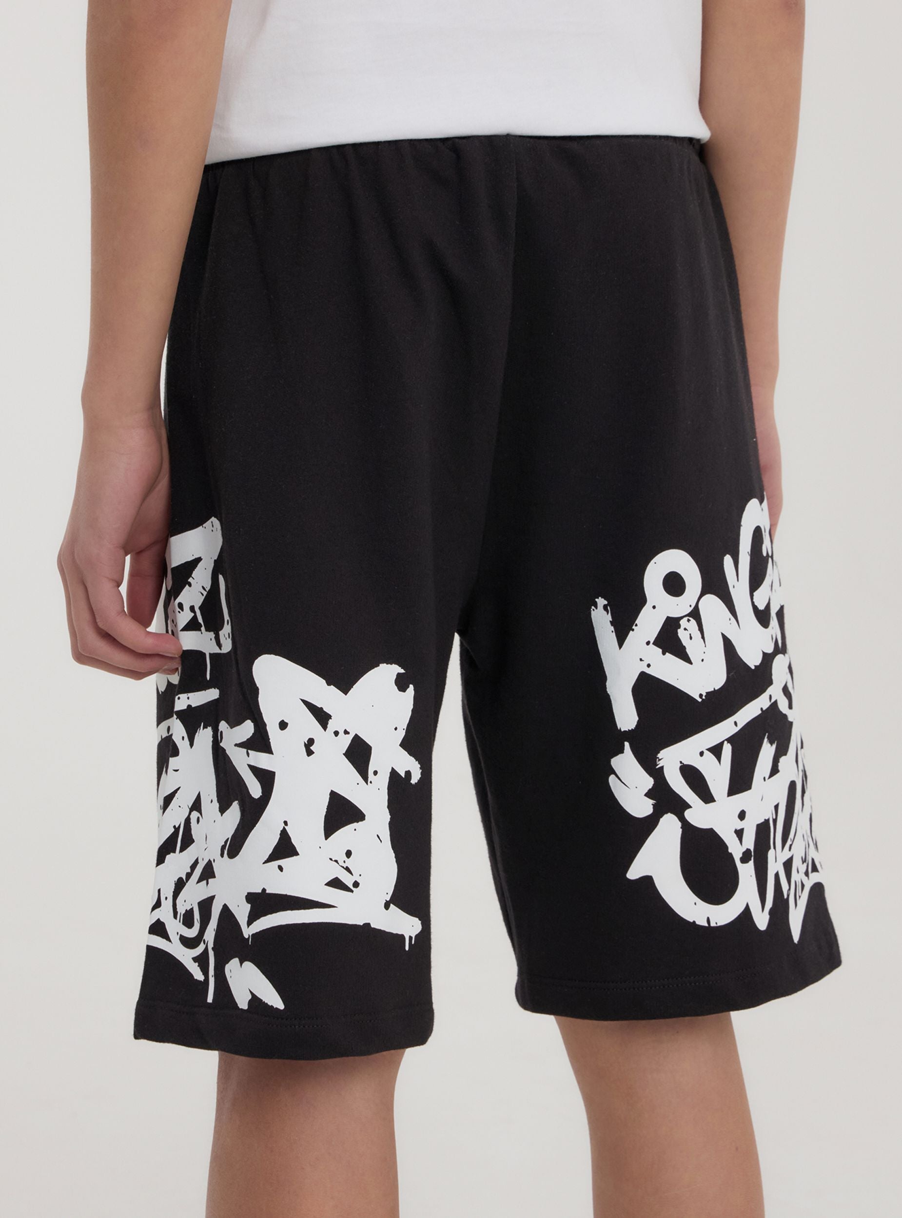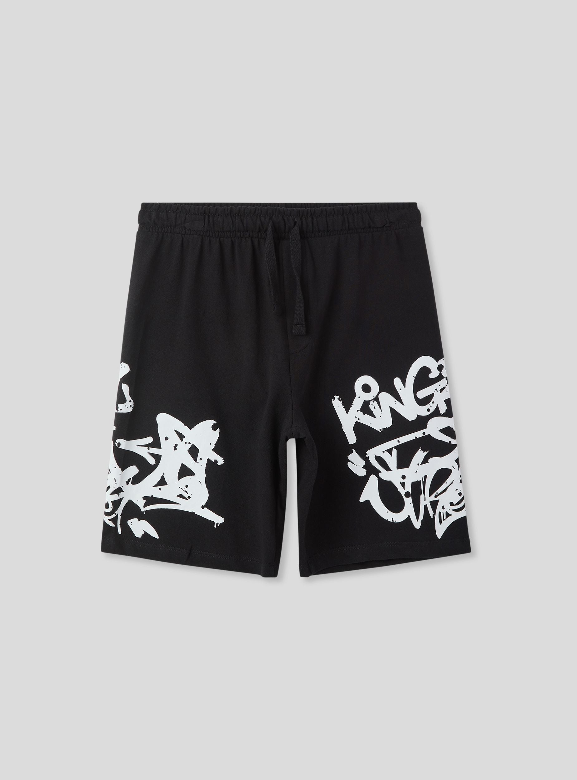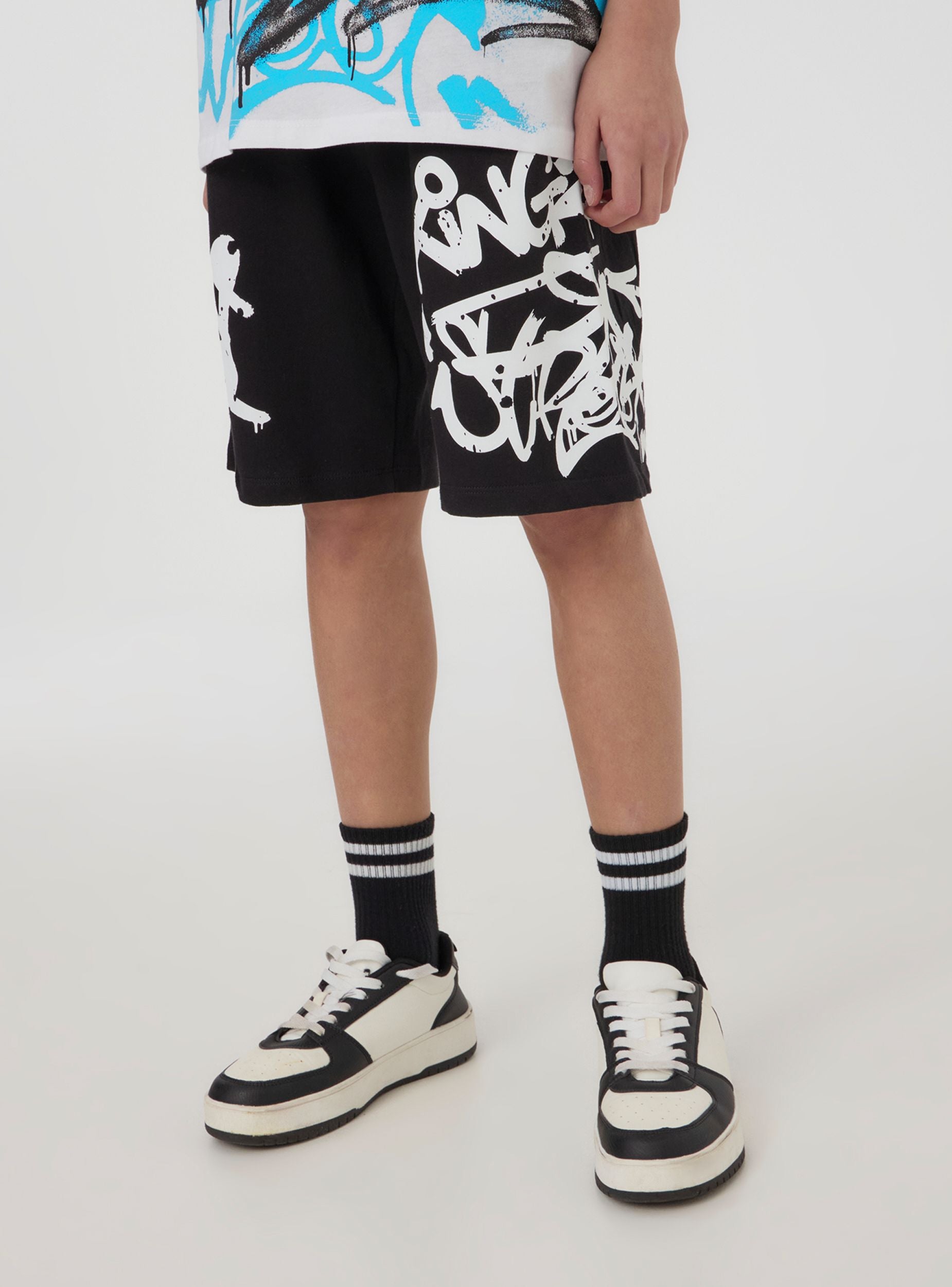 Pantaloncini della tuta leggeri da bambino perfetti per un look sportivo e vivace. Dotati di coulisse regolabile in vita per una vestibilità comoda, sono arricchiti da una stampa graffiti dallo stile urbano che aggiunge carattere e originalità. Ideali per il tempo libero, il gioco o le attività all'aperto, si abbinano facilmente a t-shirt e sneakers per un outfit dinamico e alla moda.Dettagli