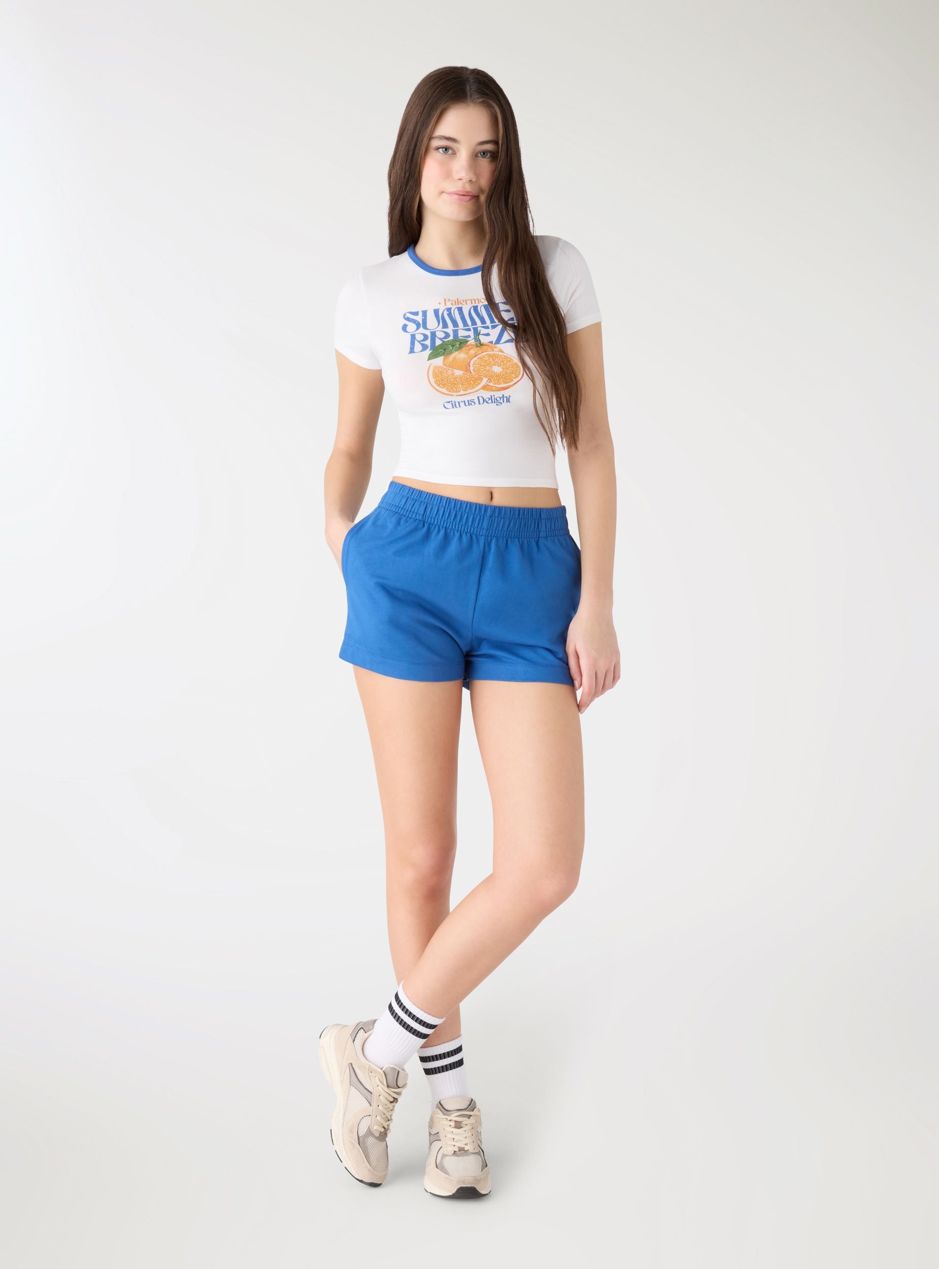 Pantaloncini da donna elasticizzati con fascia in vita e lunghezza corta. Design a tinta unita con bande laterali a contrasto che richiamano lo stile sportivo, perfetti per allenamento, tempo libero e look casual. Vestibilità regular. Facili da abbinare a maglietta e sneakers. Tessuto leggero.Dettagli
