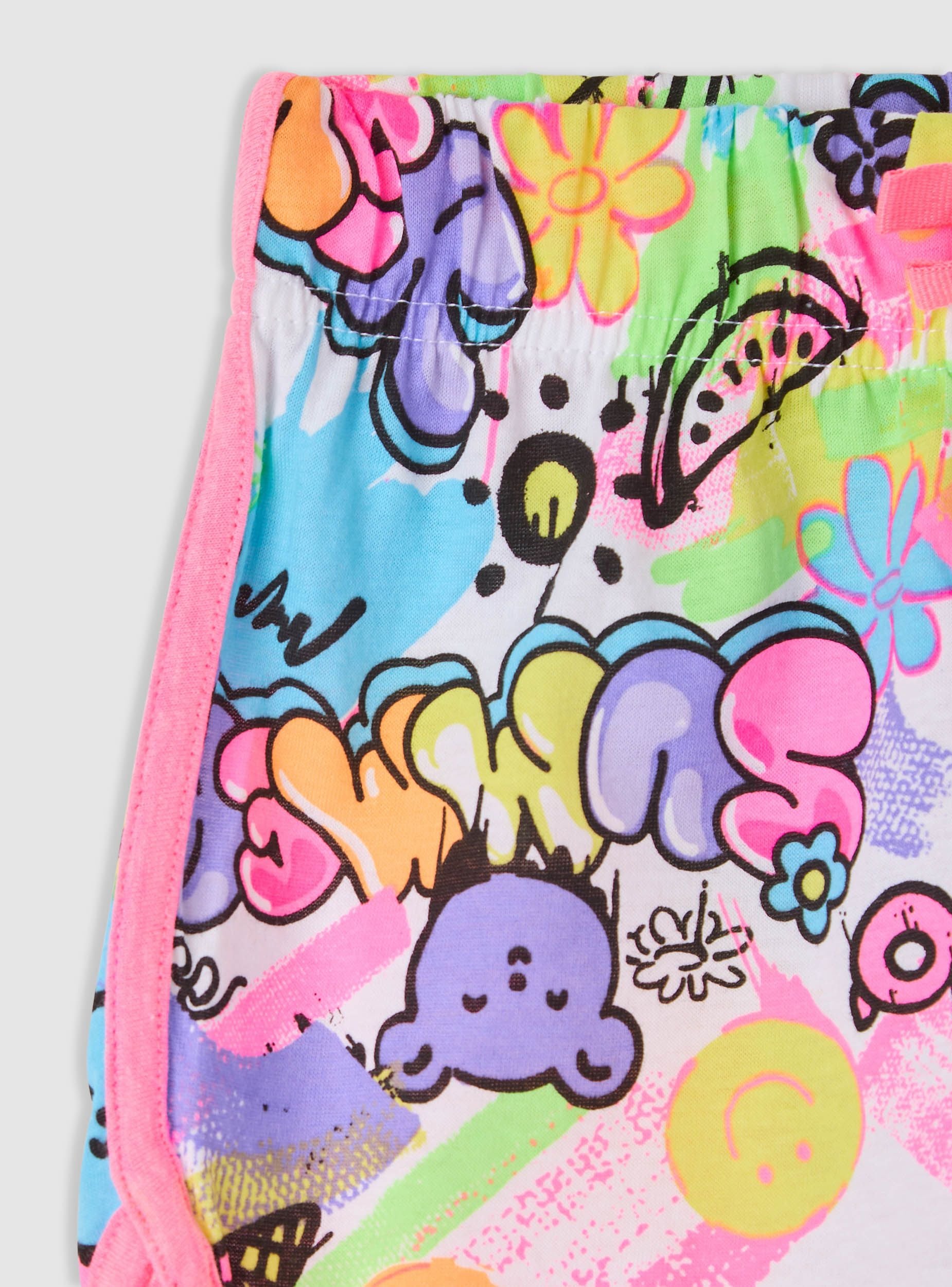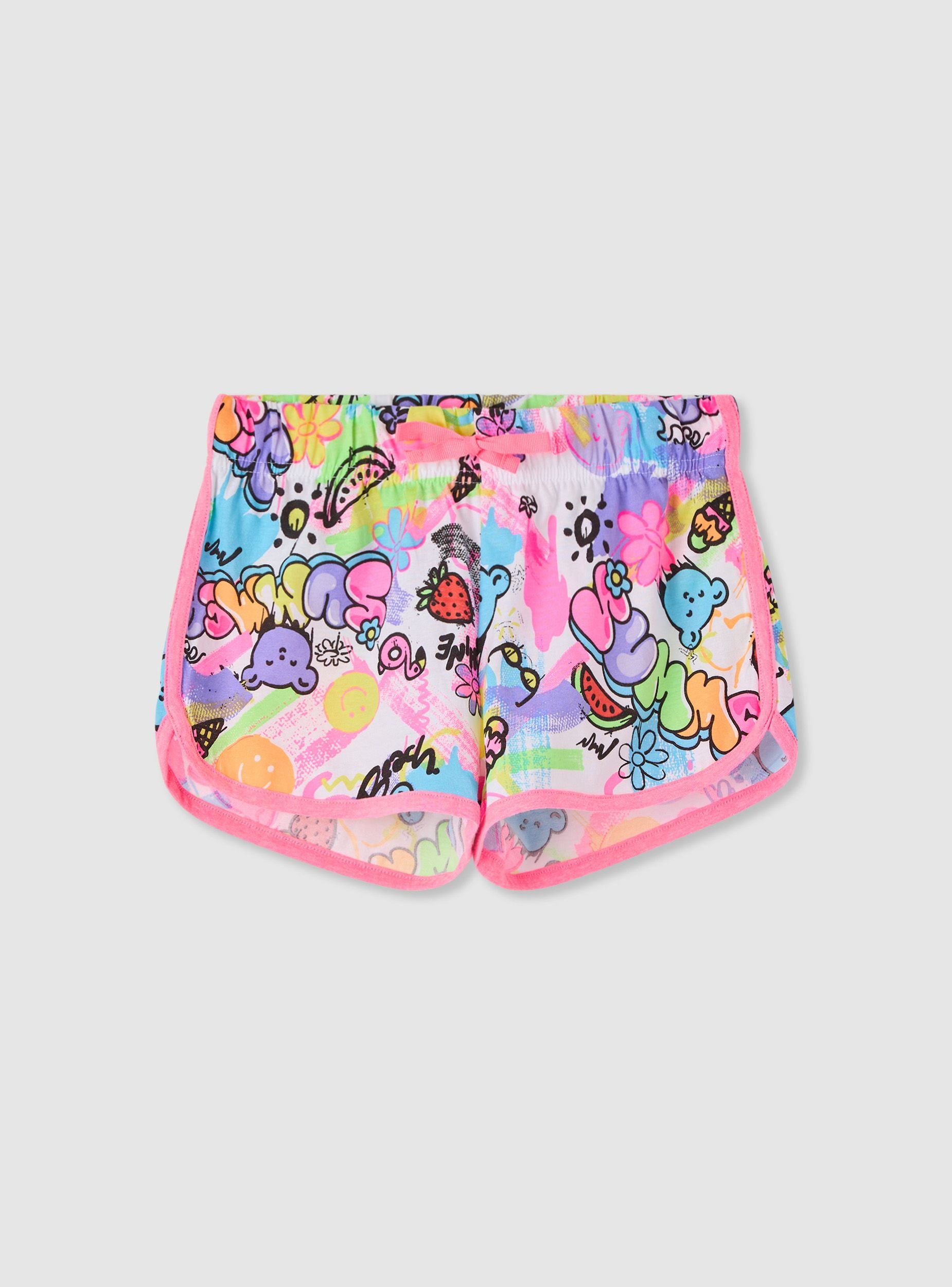 Pantaloncini da bambina elasticizzati con stampa vivace a graffiti, perfetti per il tempo libero e le giornate attive. Vita con elastico e coulisse per una regolazione comoda, profilo arrotondato ai lati che favorisce il movimento. Vestibilità regular e lunghezza corta, ideali con maglietta e sneakers per un look sportivo e divertente.Dettagli