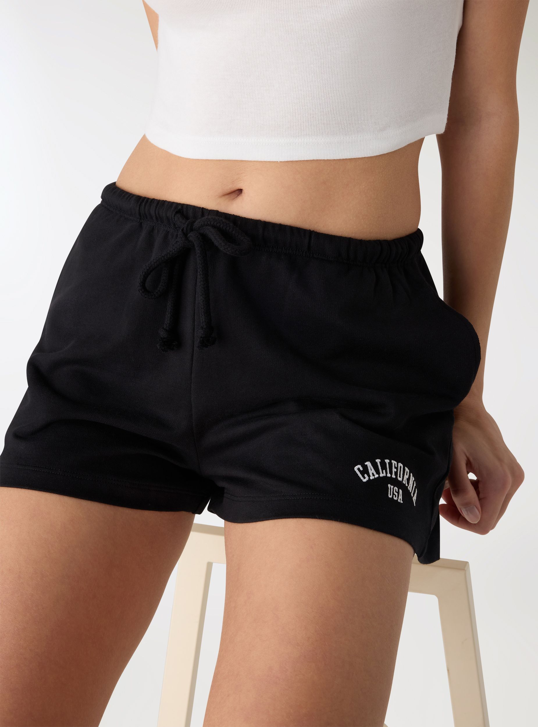 Pantaloncini ginnici da donna in tinta unita con vestibilità regular. Vita elasticizzata con coulisse regolabile e piccolo ricamo sul fondo. Lunghezza corta con fondo stondato, ideali per sport e tempo libero. Facili da abbinare a maglietta e sneakers per un look casual o a una felpa leggera per l’allenamento. Tessuto leggero.Dettagli