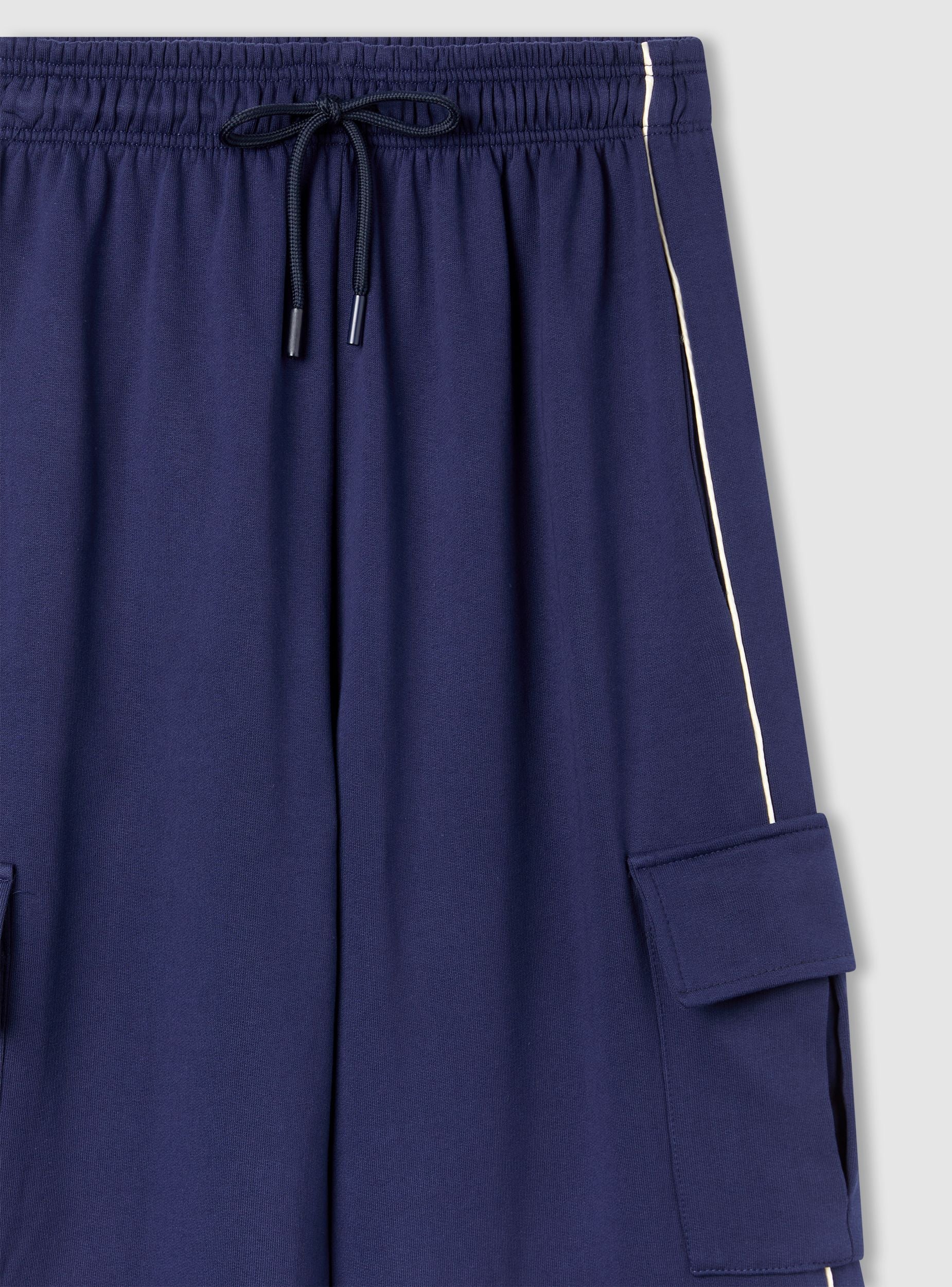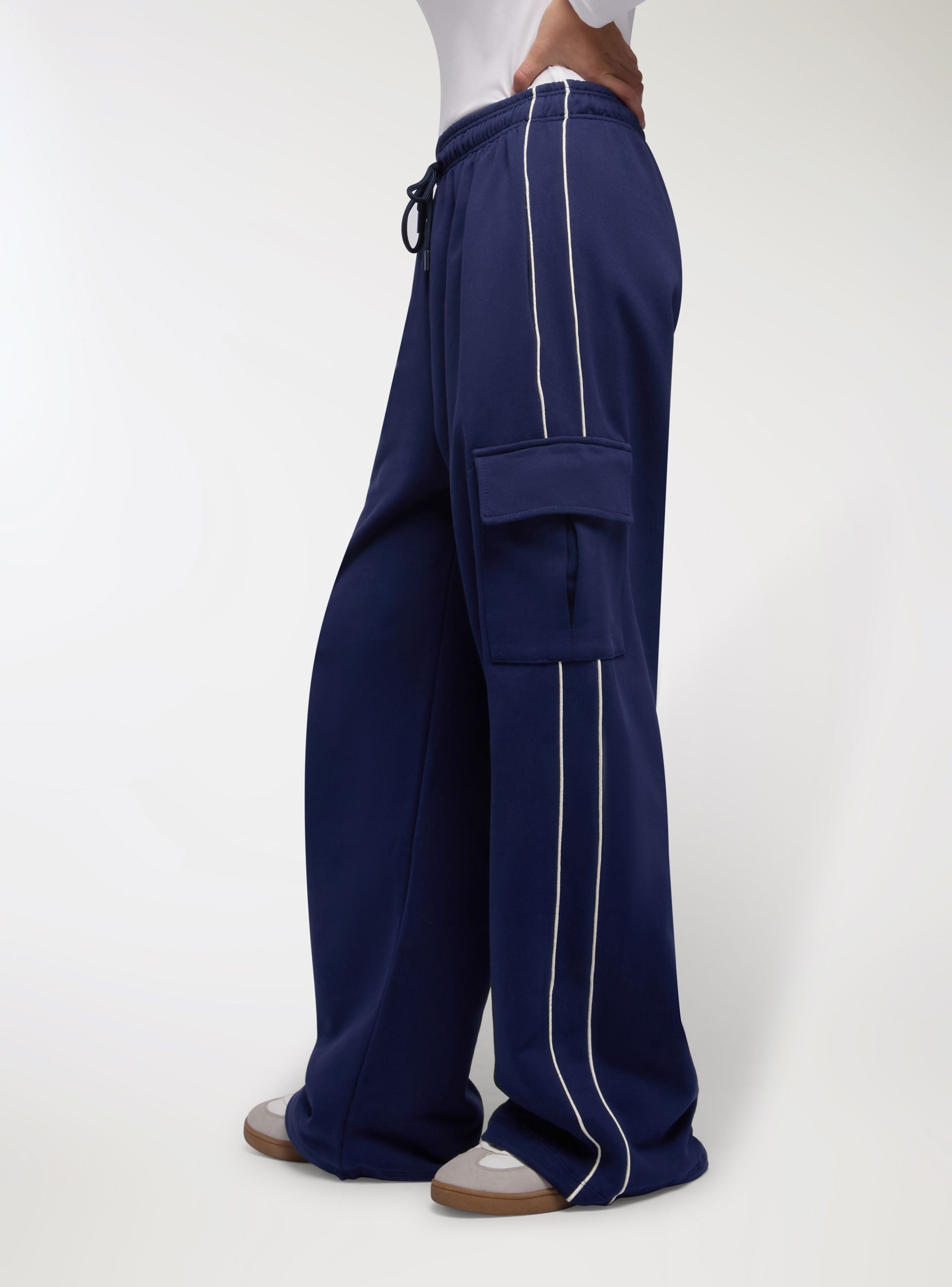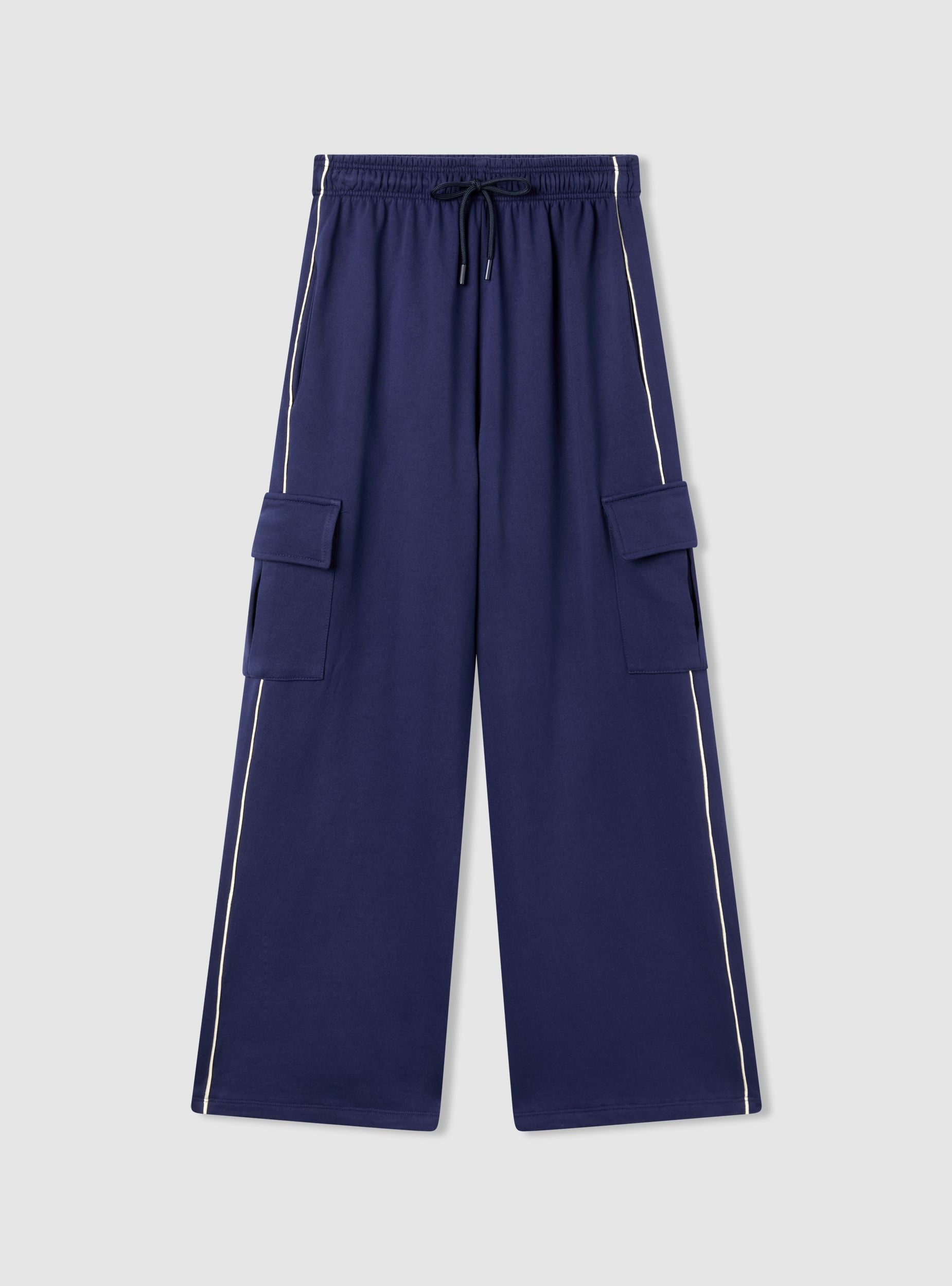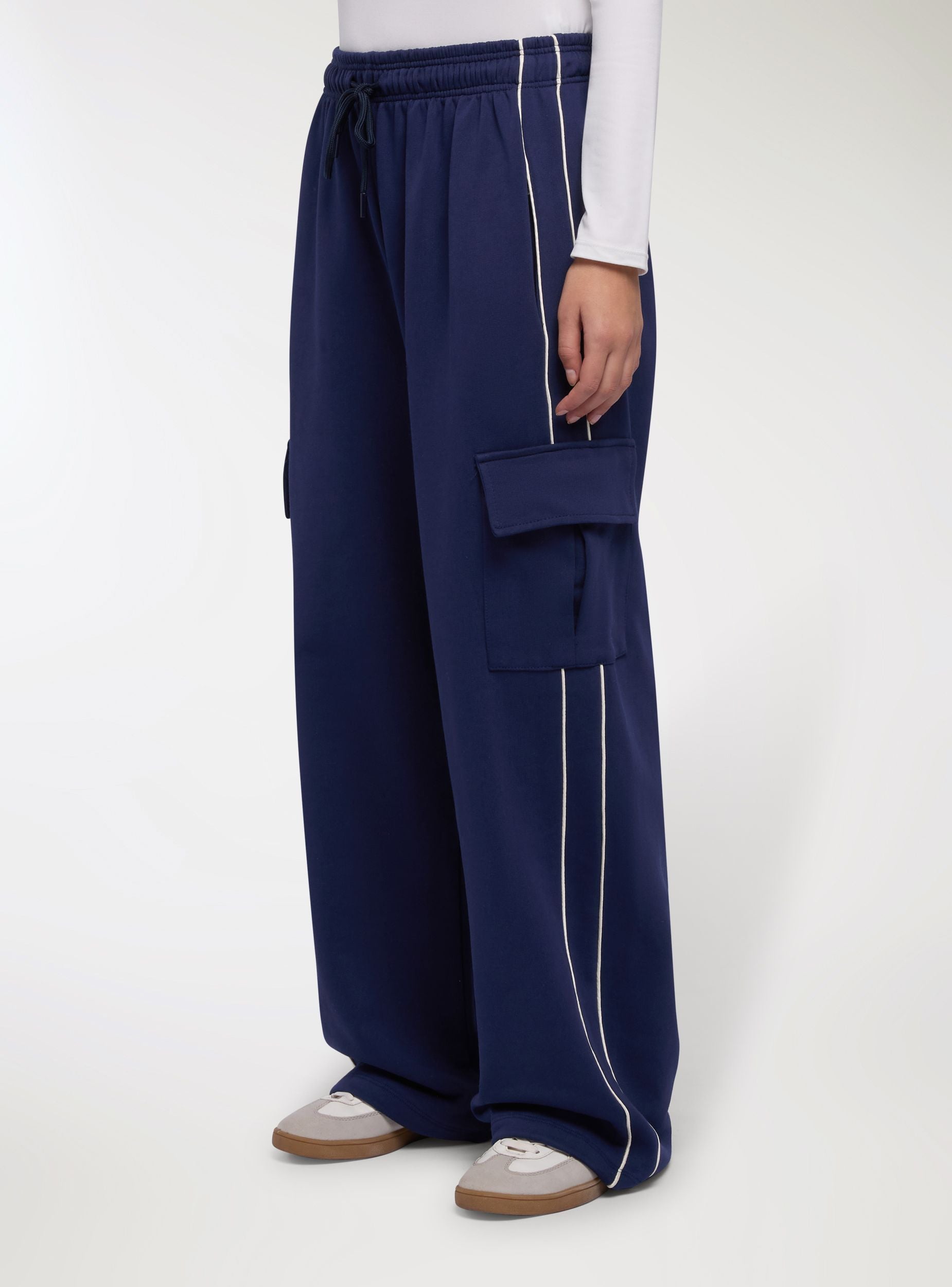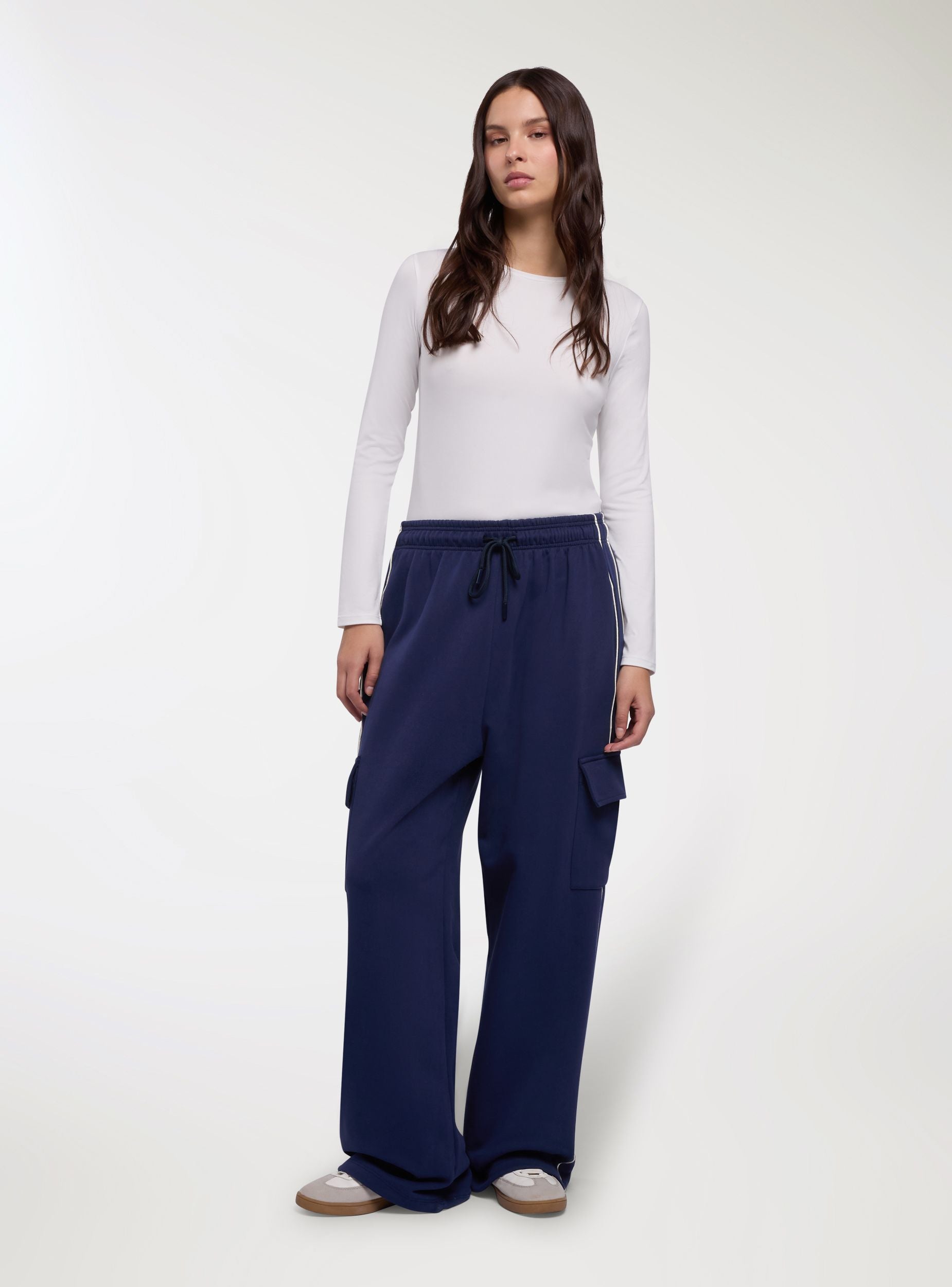 Pantaloni tuta da donna in tinta unita, dal taglio wide leg e vita con elastico regolabile da coulisse. Fascia in vita confortevole, impunture a contrasto lungo i fianchi e ampie tasche cargo con patta sui lati. Lunghezza alla caviglia e linea fluida, ideali per il tempo libero o look casual con felpe e sneakers, ma anche con top aderenti e cardigan per outfit rilassati e contemporanei. Tessuto pesante.Dettagli