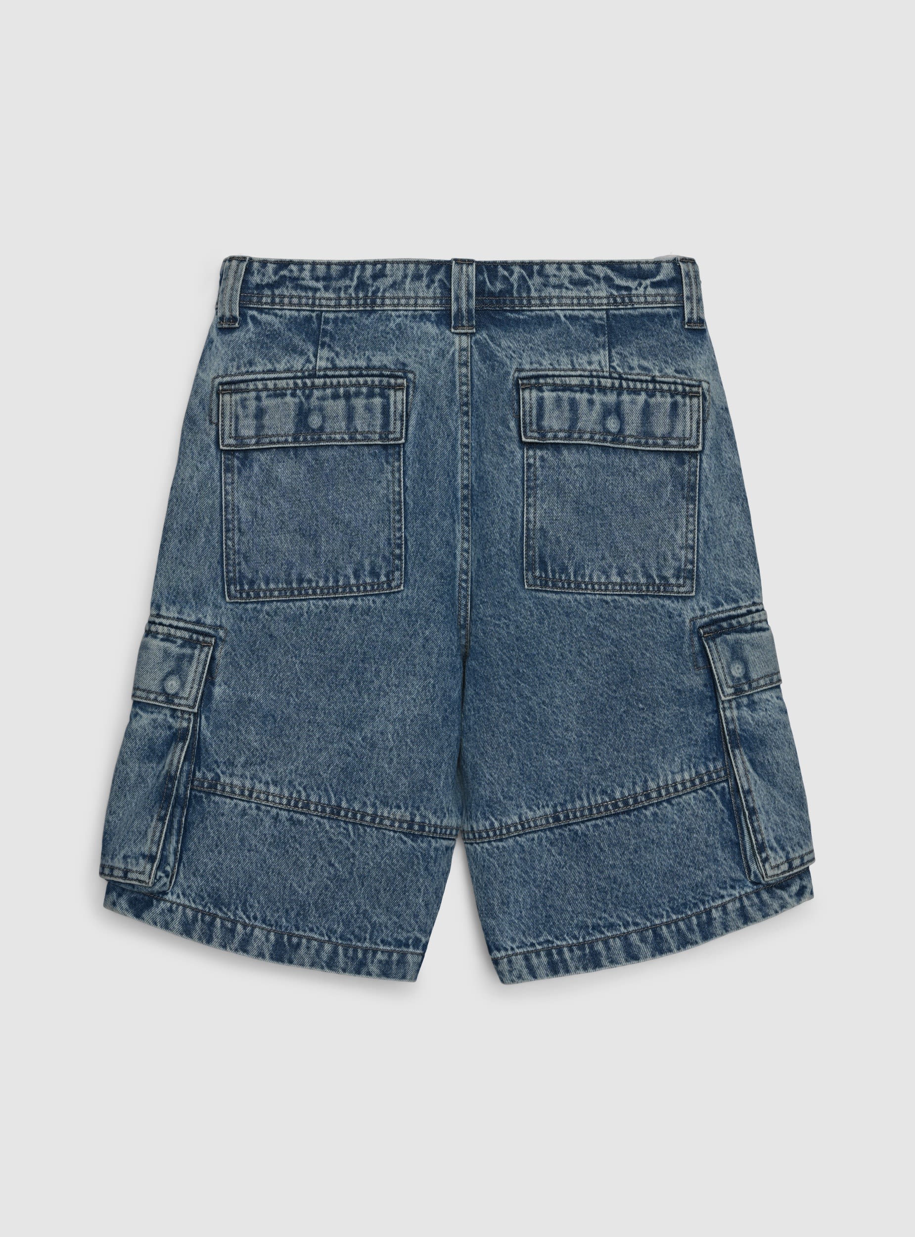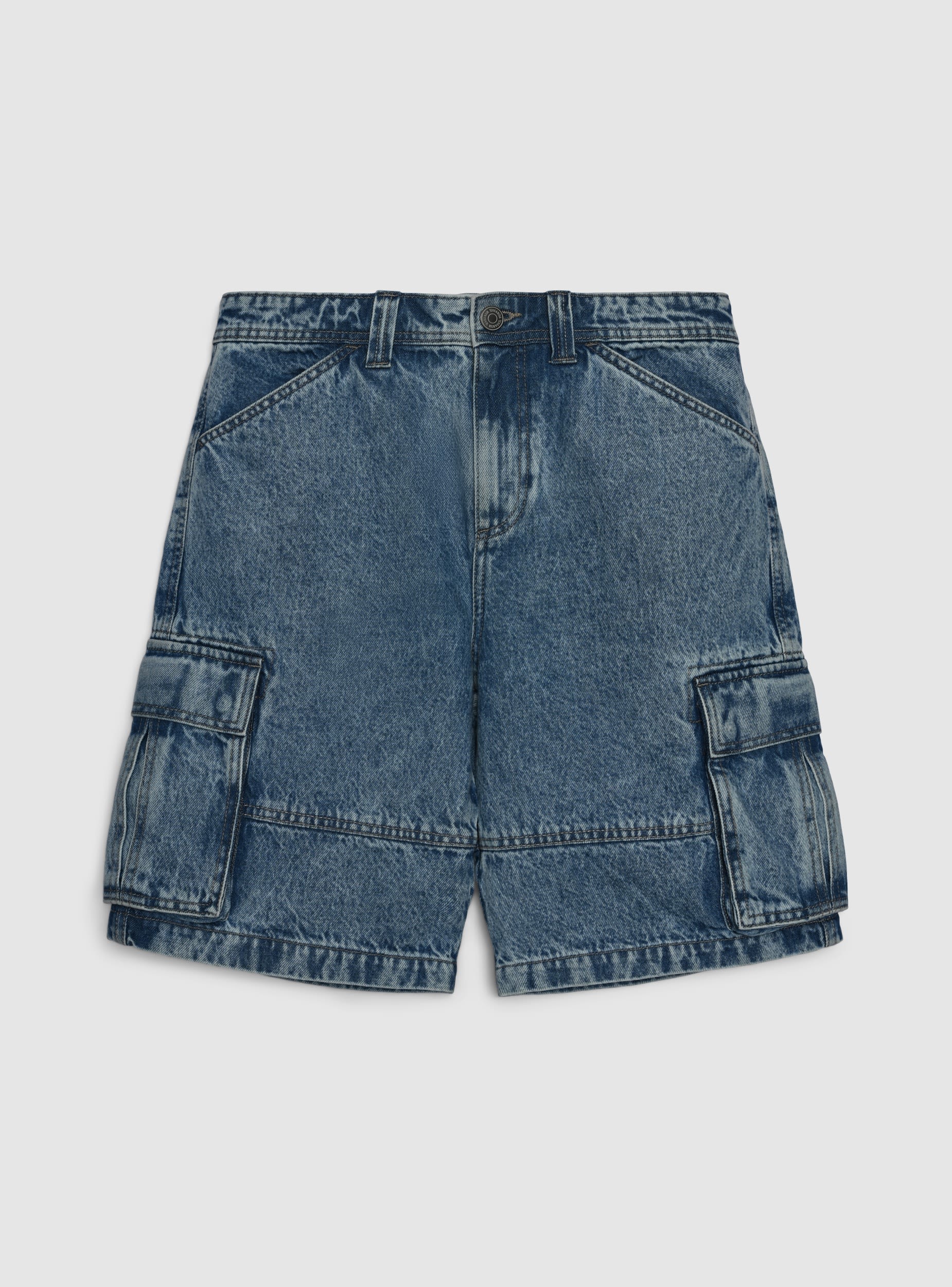 Pantaloncini da uomo in denim a tinta unita, ideali per look urban e tempo libero. Modello con passanti in vita e chiusura con bottone e zip, pensato per una vestibilità comoda. Tasche laterali cargo con patta per un tocco utility, più tasche posteriori applicate. Perfetti con t-shirt e sneakers o camicia leggera nelle giornate calde.Dettagli