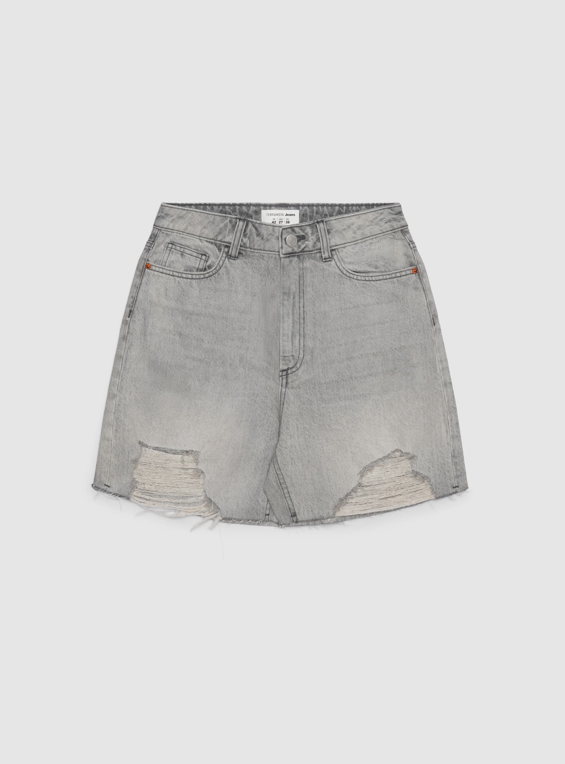 Pantaloncini in jeans da donna dal taglio bermuda, ideali per look urban e da tempo libero. Modello a tinta unita con passanti in vita, chiusura con bottone e zip e costruzione a cinque tasche. Gli strappi sul davanti e il fondo sfrangiato aggiungono un tocco grintoso, perfetto con t-shirt, top o camicie leggere.Dettagli