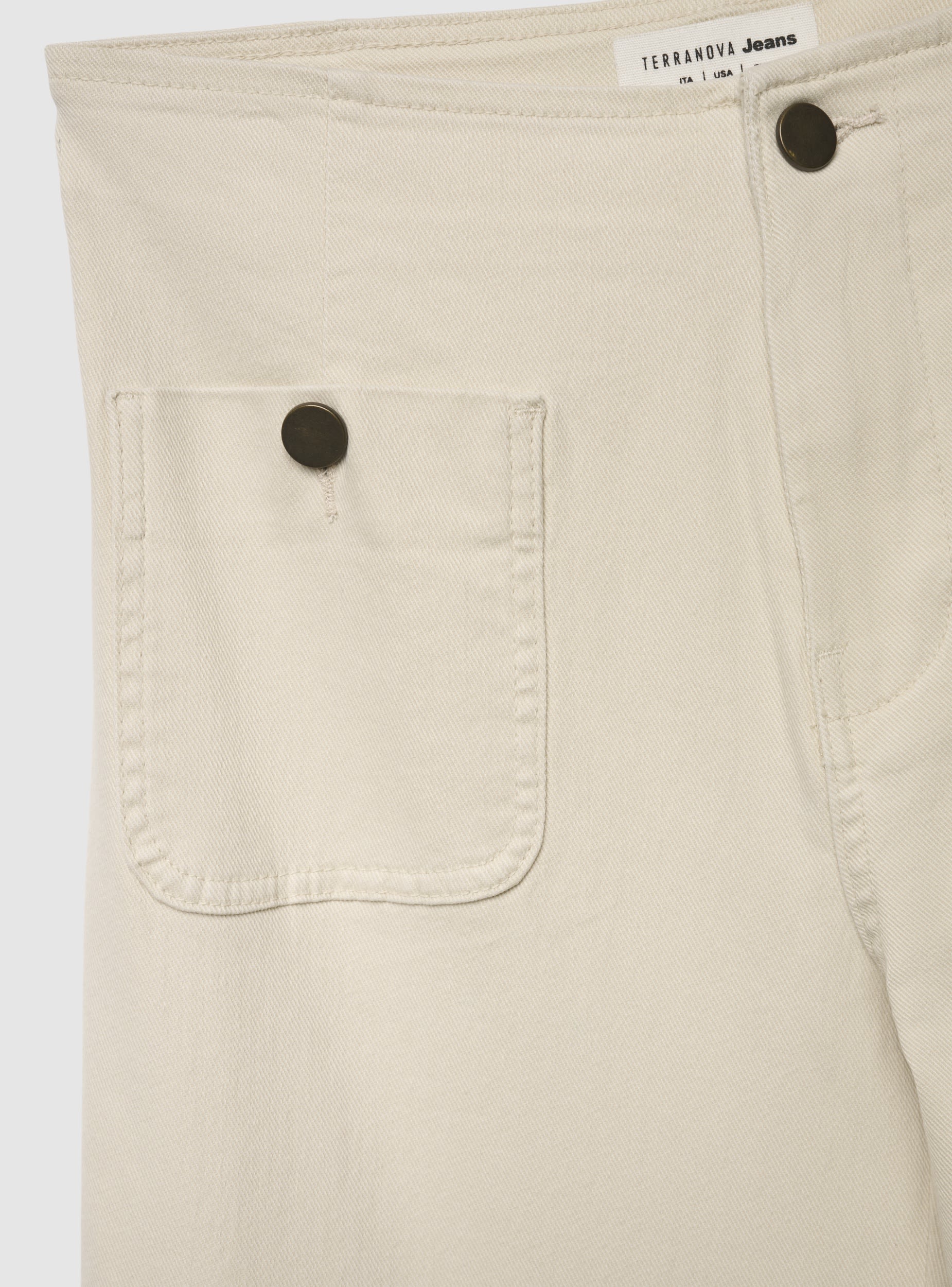 Jeans da donna a tinta unita con linea wide leg e lunghezza alla caviglia. Vita media con chiusura a bottone e zip, frontali tasche a toppa fermate da borchie e posteriori tasche a toppa per un look utility. Versatili per il tempo libero, si abbinano a una maglietta e sneakers oppure a camicia e sandali. Vestibilità ampia che valorizza la silhouette mantenendo comfort in movimento.Dettagli