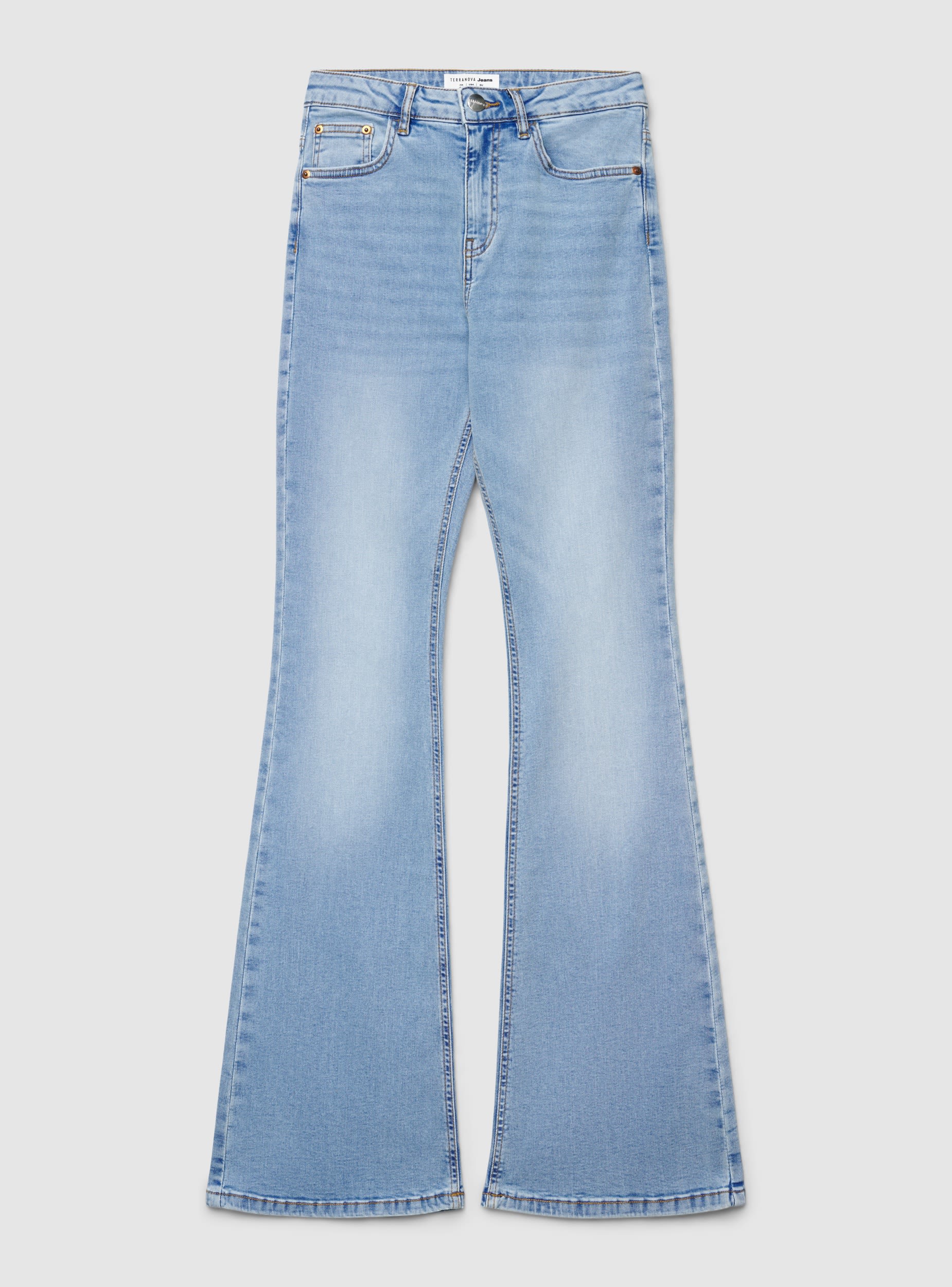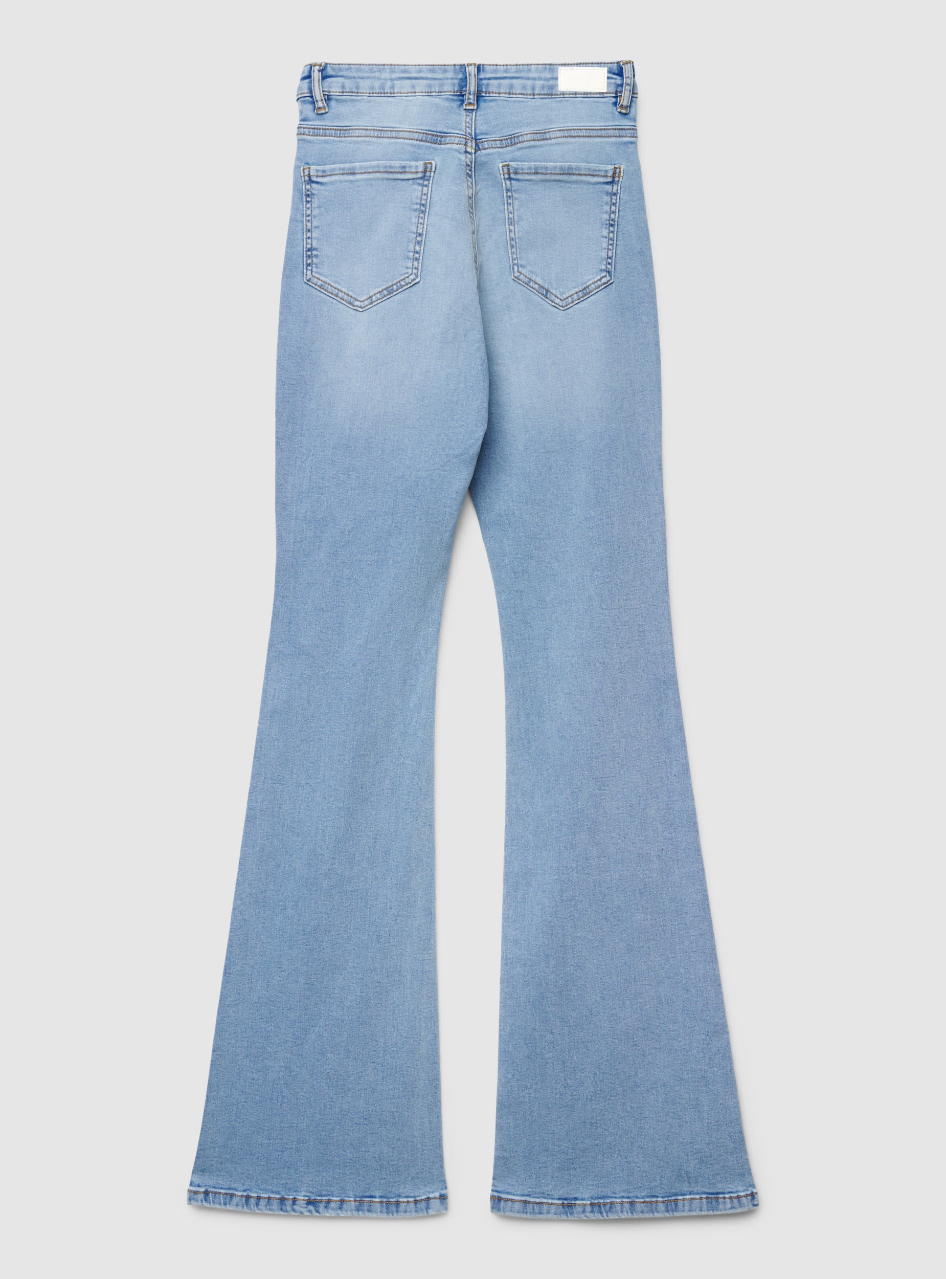 Jeans da donna a tinta unita con vestibilità regolare e gamba a zampa. Vita alta con passanti e chiusura con bottone e zip. Cinque tasche con taschino frontale e tasche applicate sul retro. Ideali per outfit casual o urban con camicie, magliette e stivaletti, slanciano la figura grazie alla svasatura. Lavaggio medio con leggere sfumature, perfetti per il giorno e il tempo libero.Dettagli