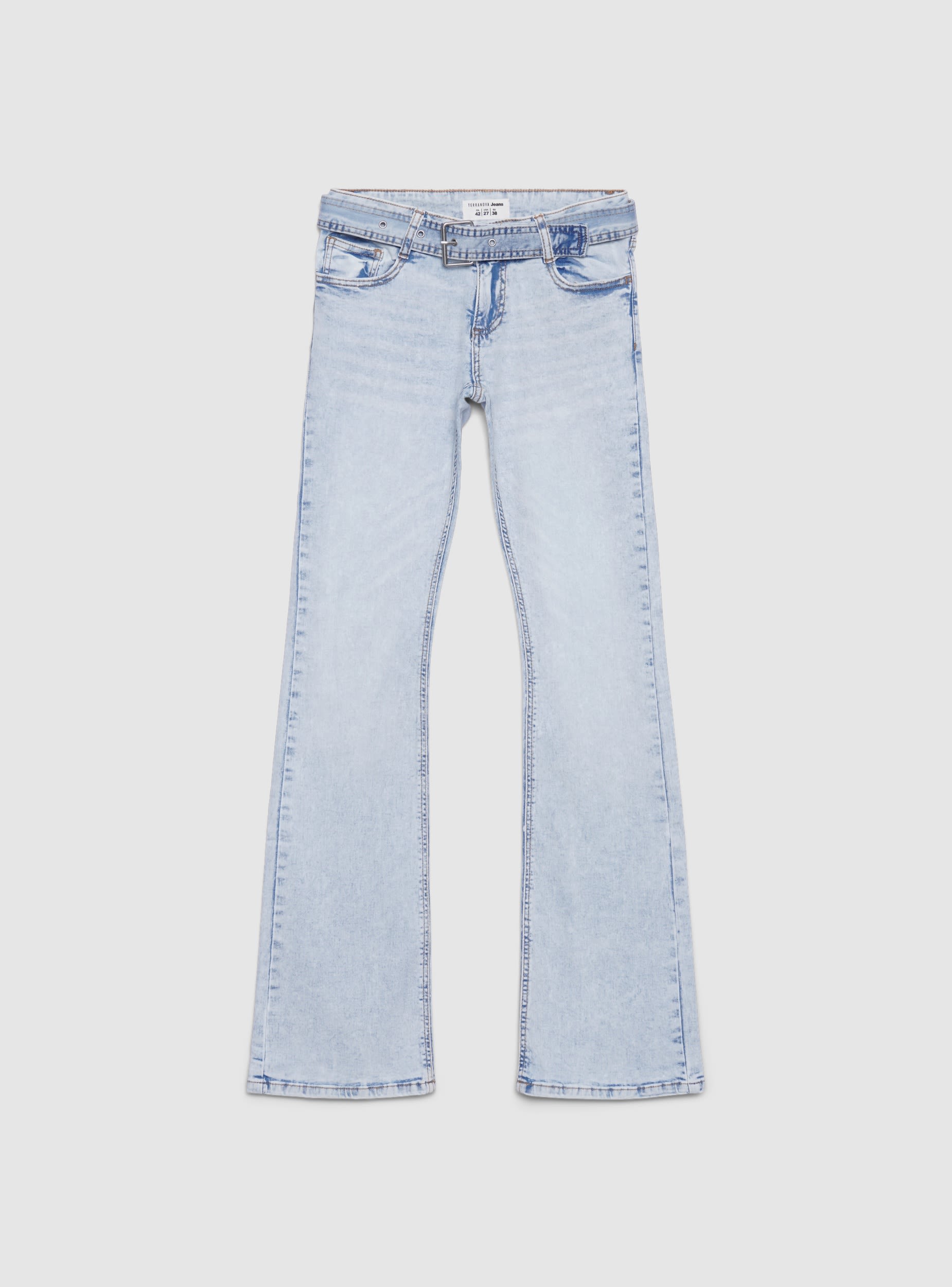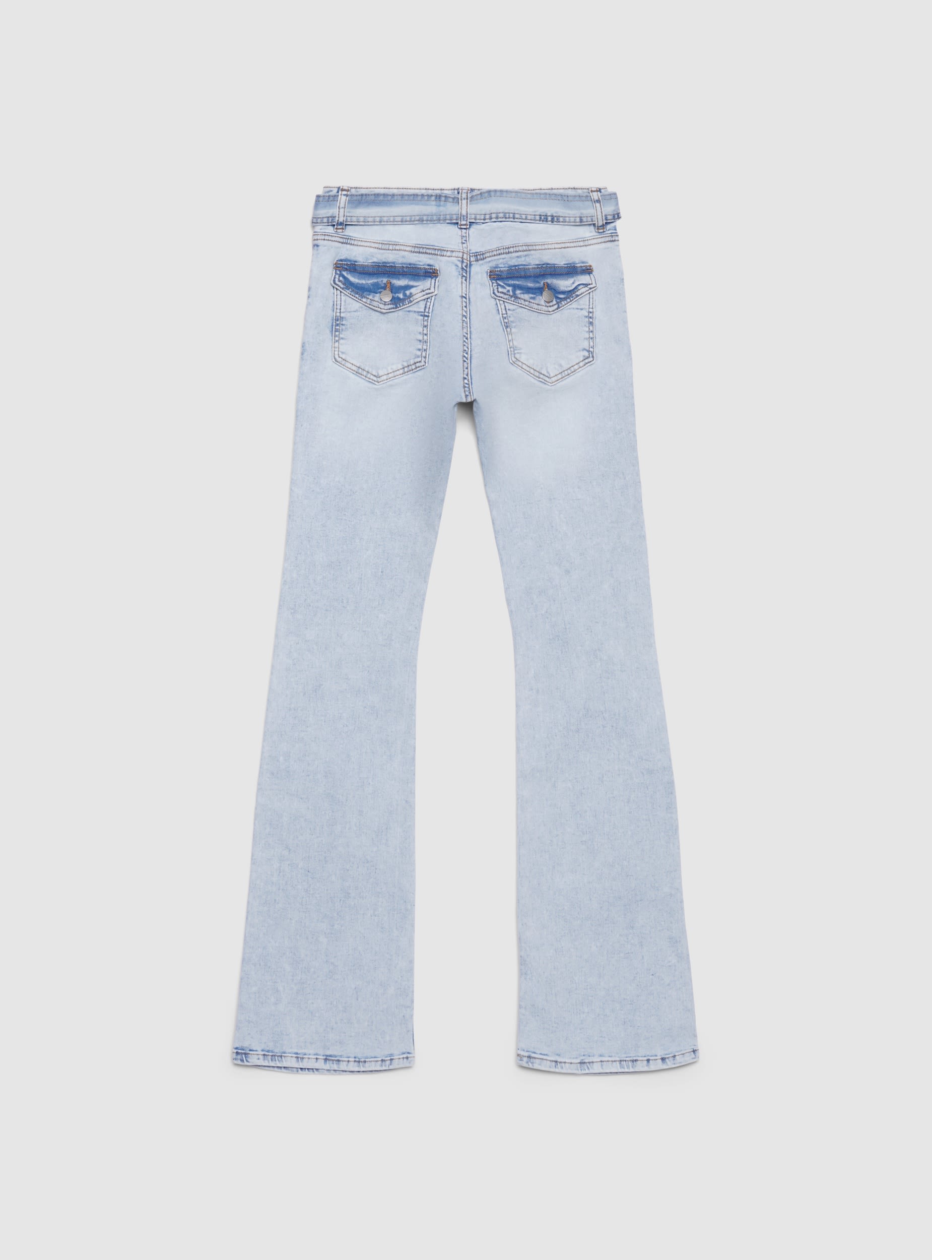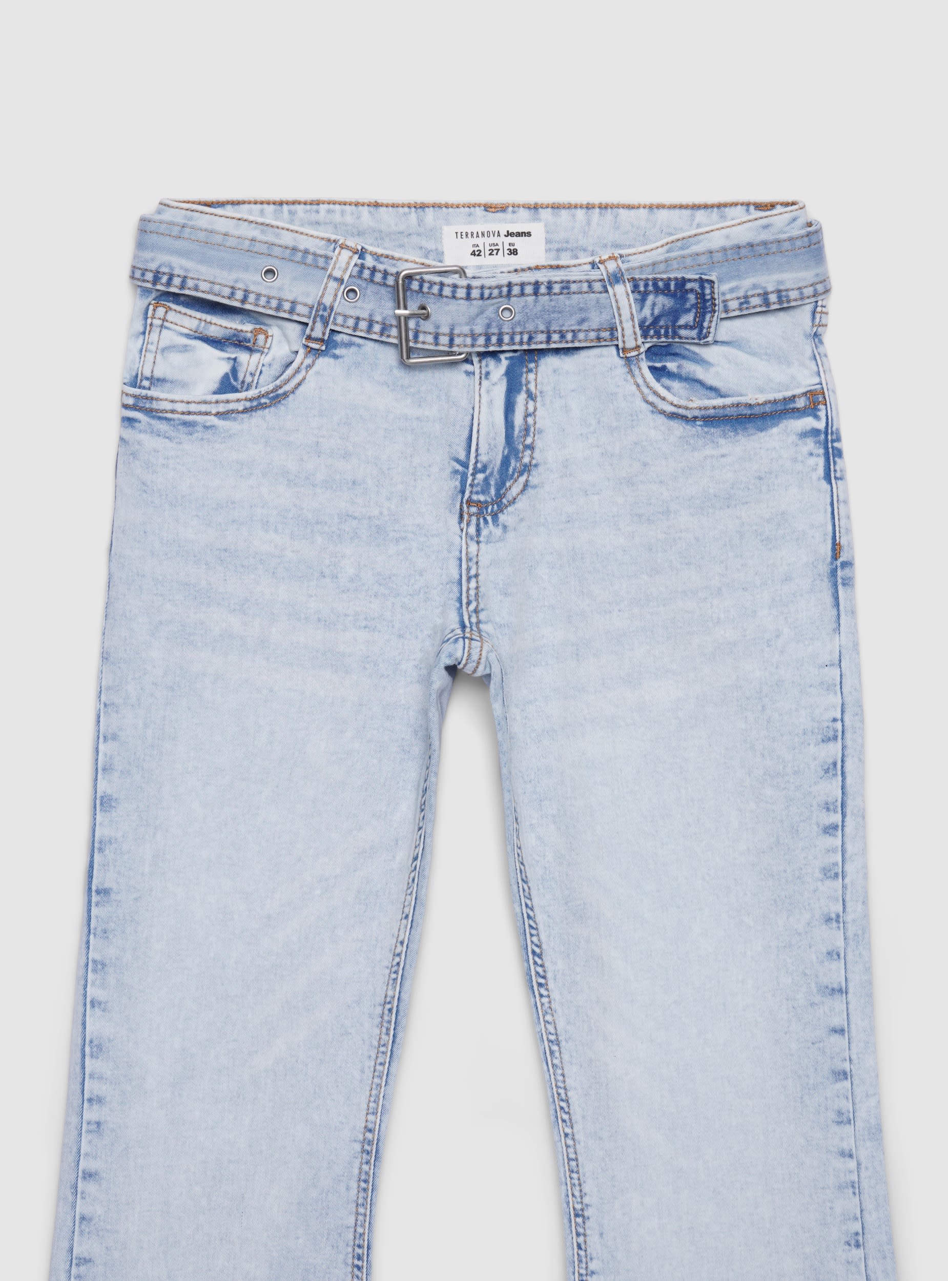 Jeans da donna a tinta unita con linea a zampa e cinta. Modello lungo con chiusura a bottone e zip, cinque tasche per praticità. Perfetti per look casual con maglietta e sneakers o per outfit più curati con camicia e stivaletti. Vestibilità regular che segue la figura senza stringere e cuciture visibili che valorizzano il design.Dettagli