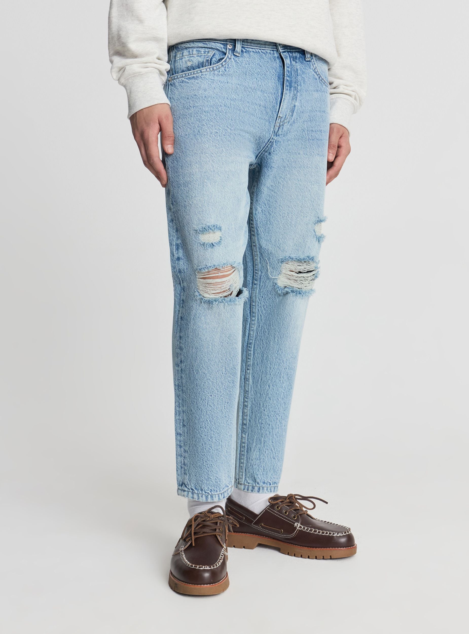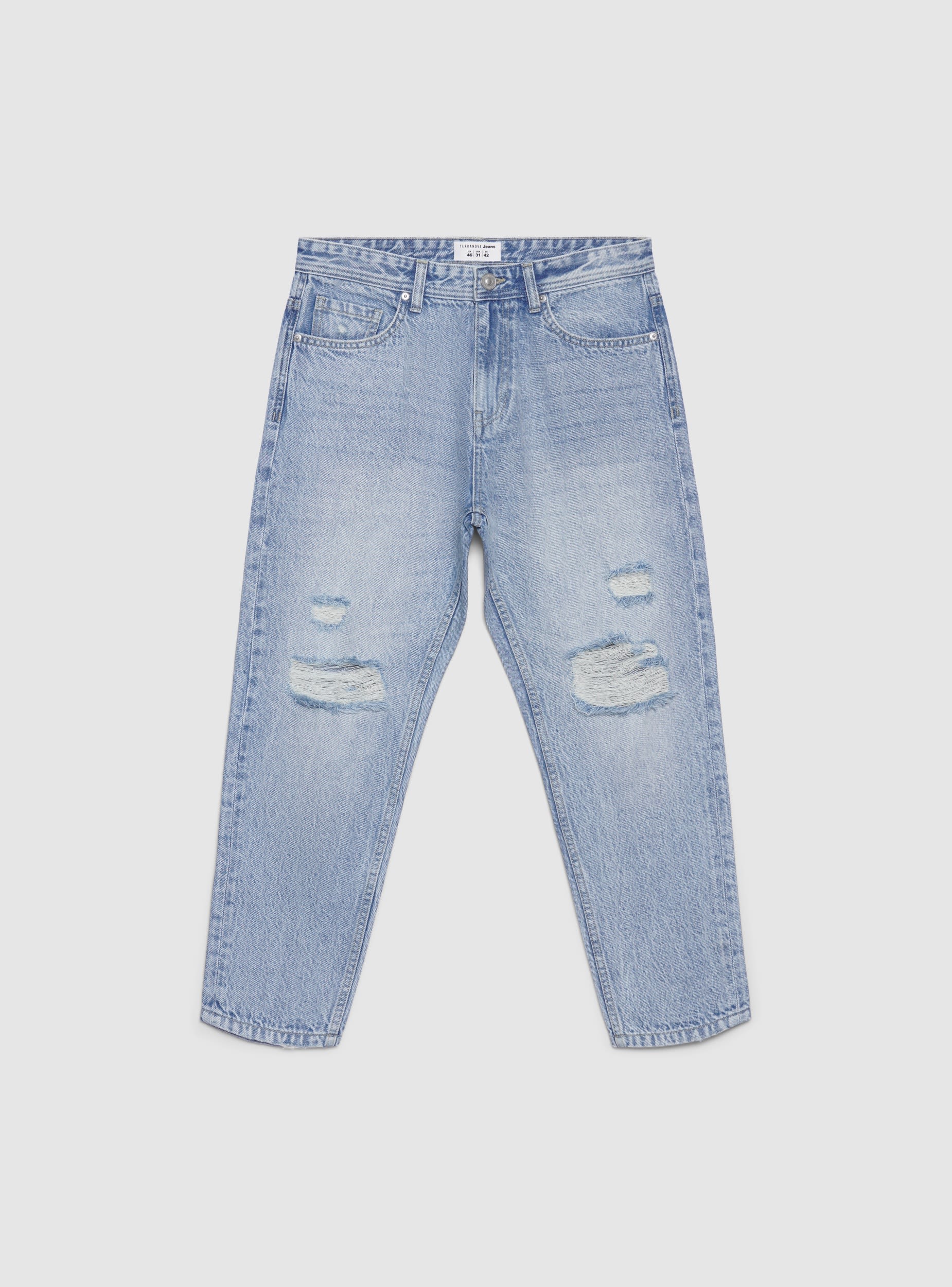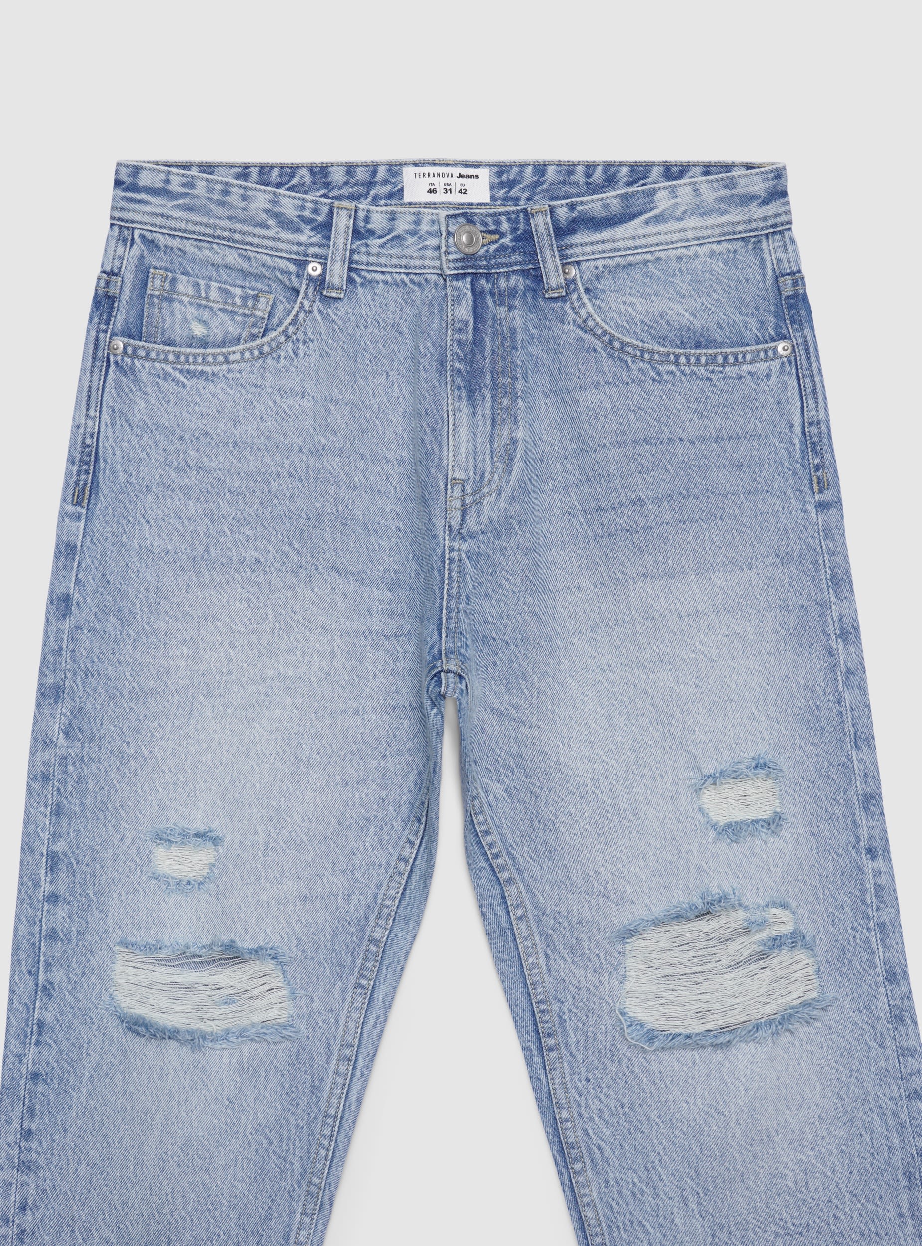 Jeans da uomo a tinta unita con vestibilità loose, perfetti per outfit casual e urban. Modello a cinque tasche con tasche anteriori e posteriori, passanti in vita e chiusura con bottone e zip. Dettagli con strappi sul fronte che aggiungono carattere. Facile da abbinare a maglietta e sneakers per il tempo libero o felpa con cappuccio per un look rilassato.Dettagli