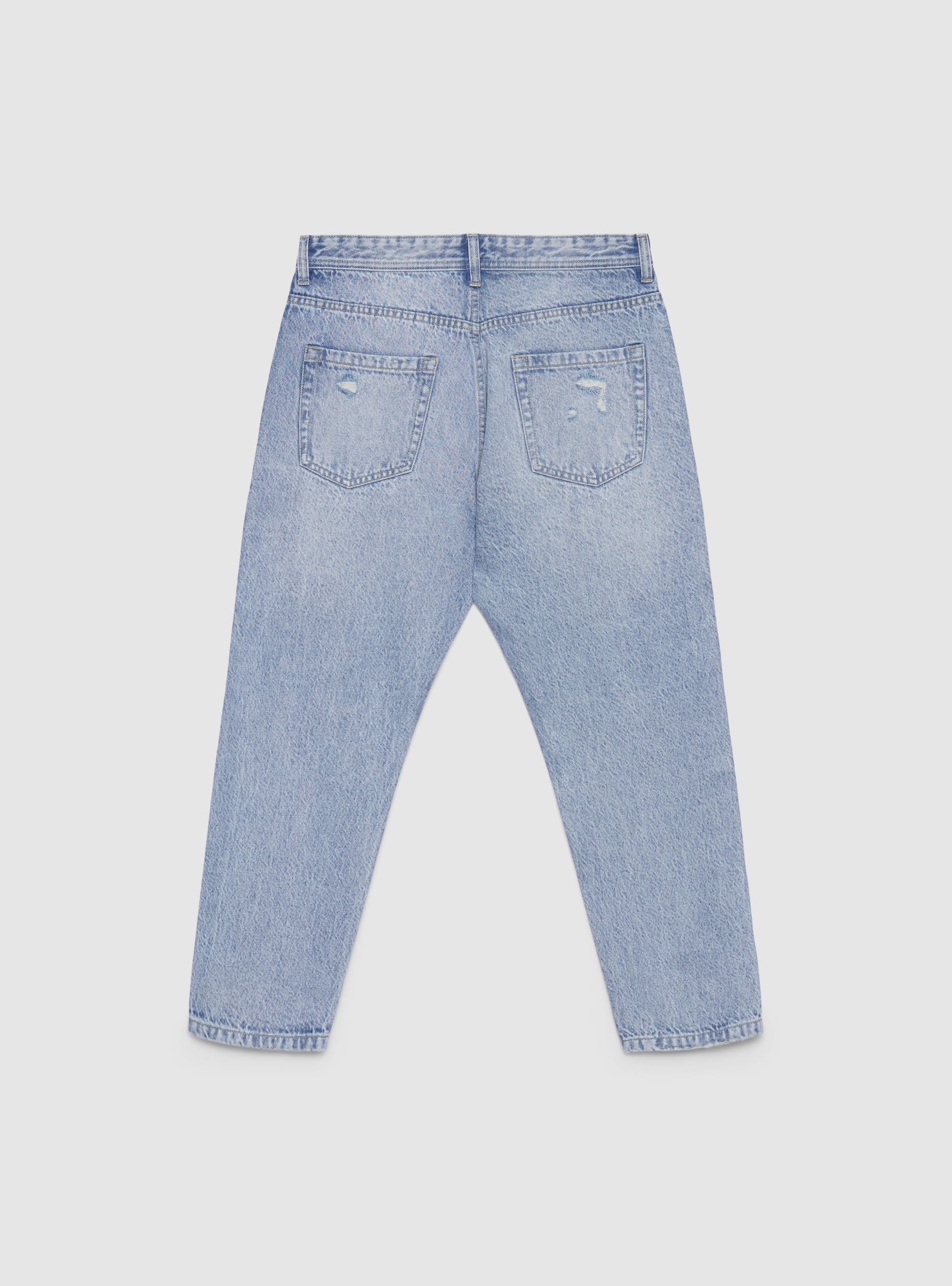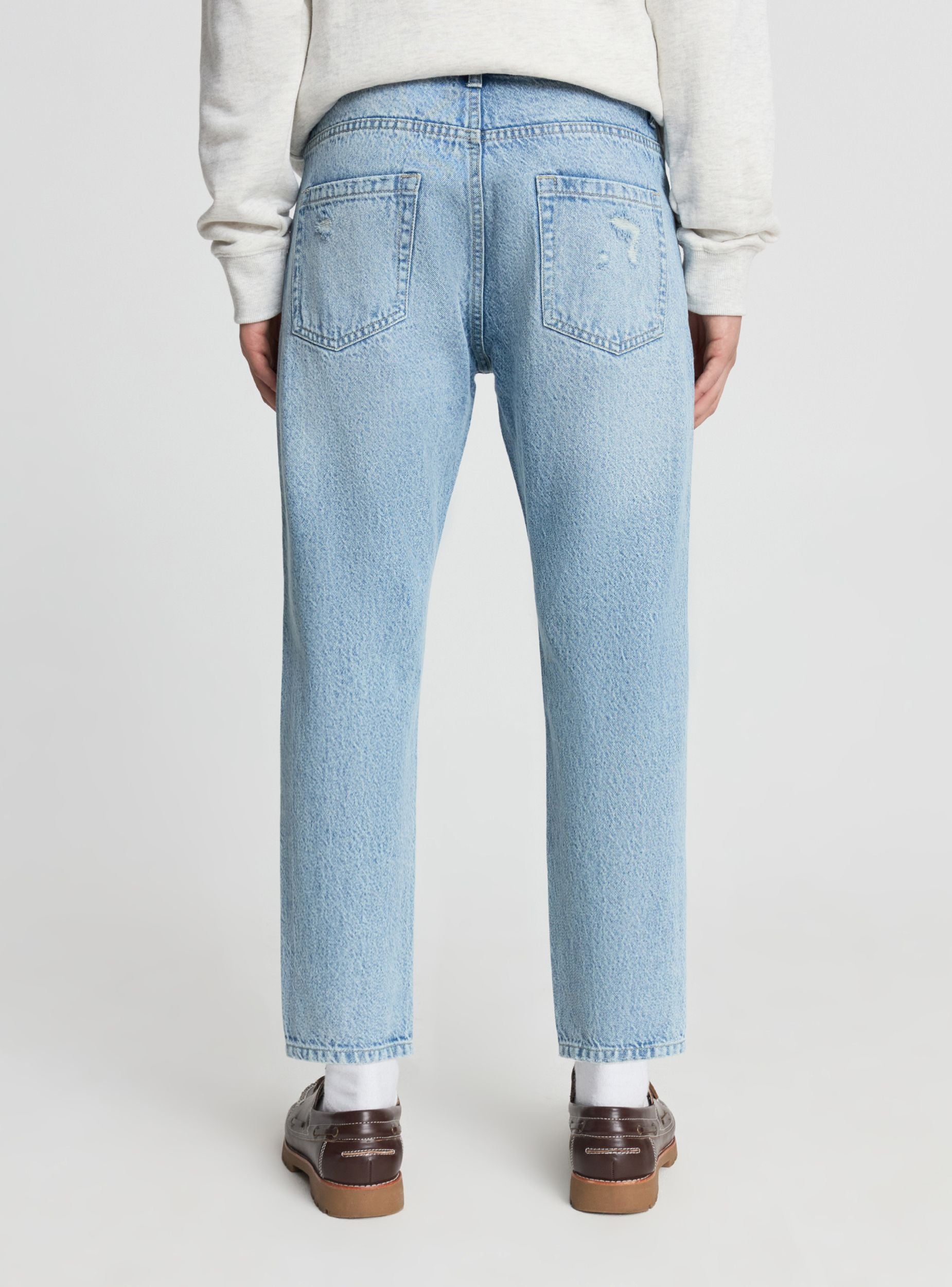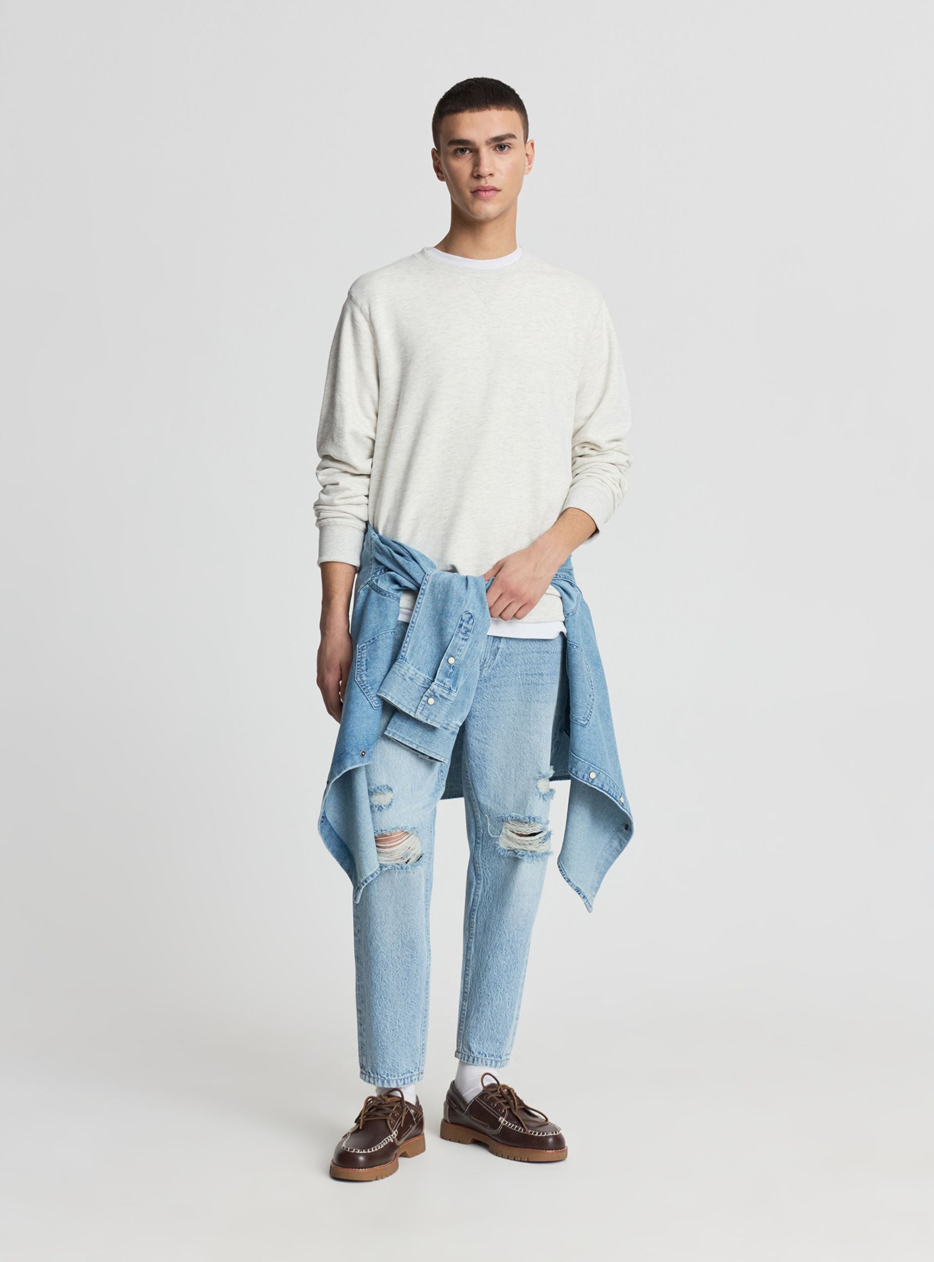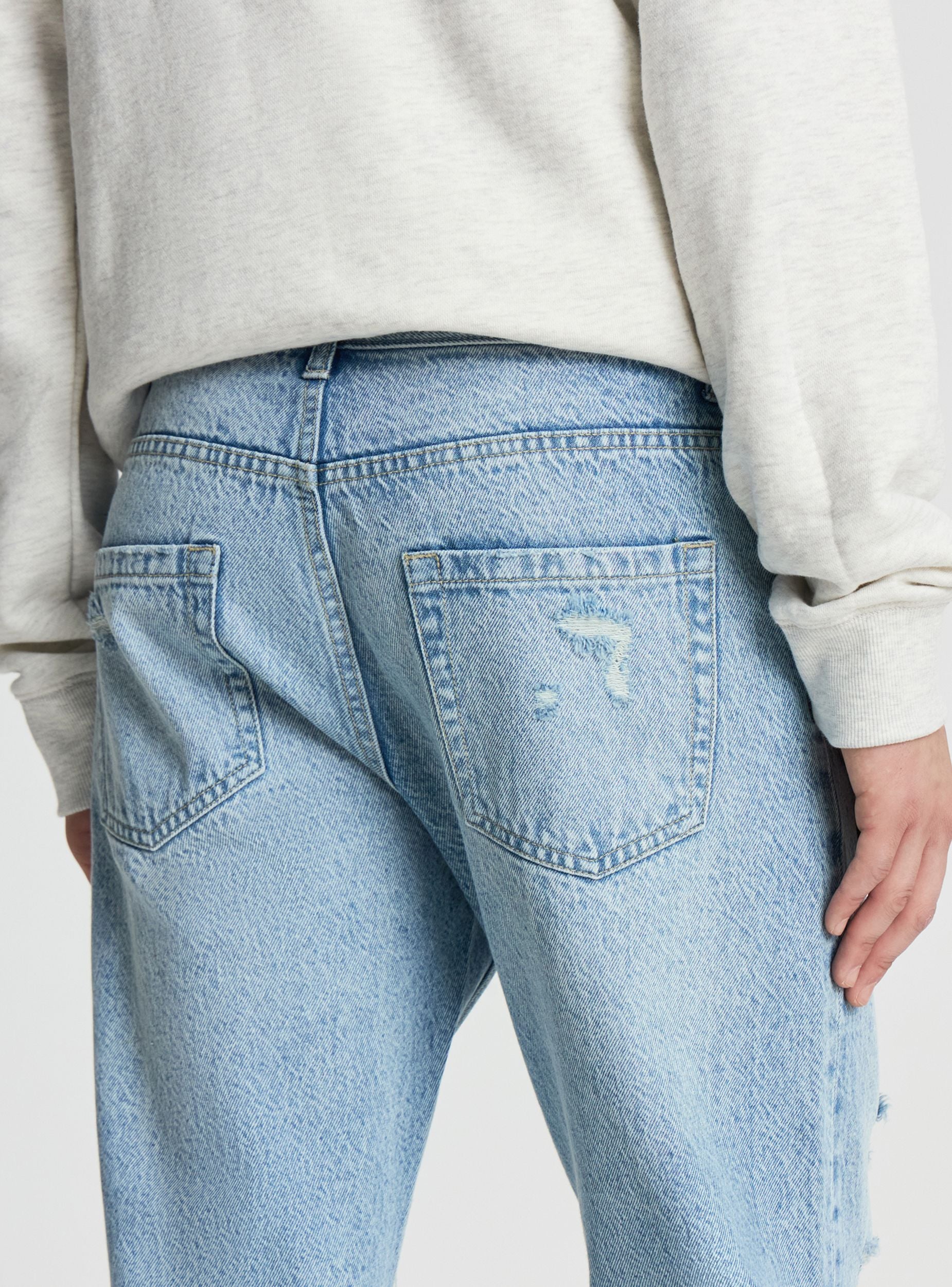 Jeans da uomo a tinta unita con vestibilità loose, perfetti per outfit casual e urban. Modello a cinque tasche con tasche anteriori e posteriori, passanti in vita e chiusura con bottone e zip. Dettagli con strappi sul fronte che aggiungono carattere. Facile da abbinare a maglietta e sneakers per il tempo libero o felpa con cappuccio per un look rilassato.Dettagli