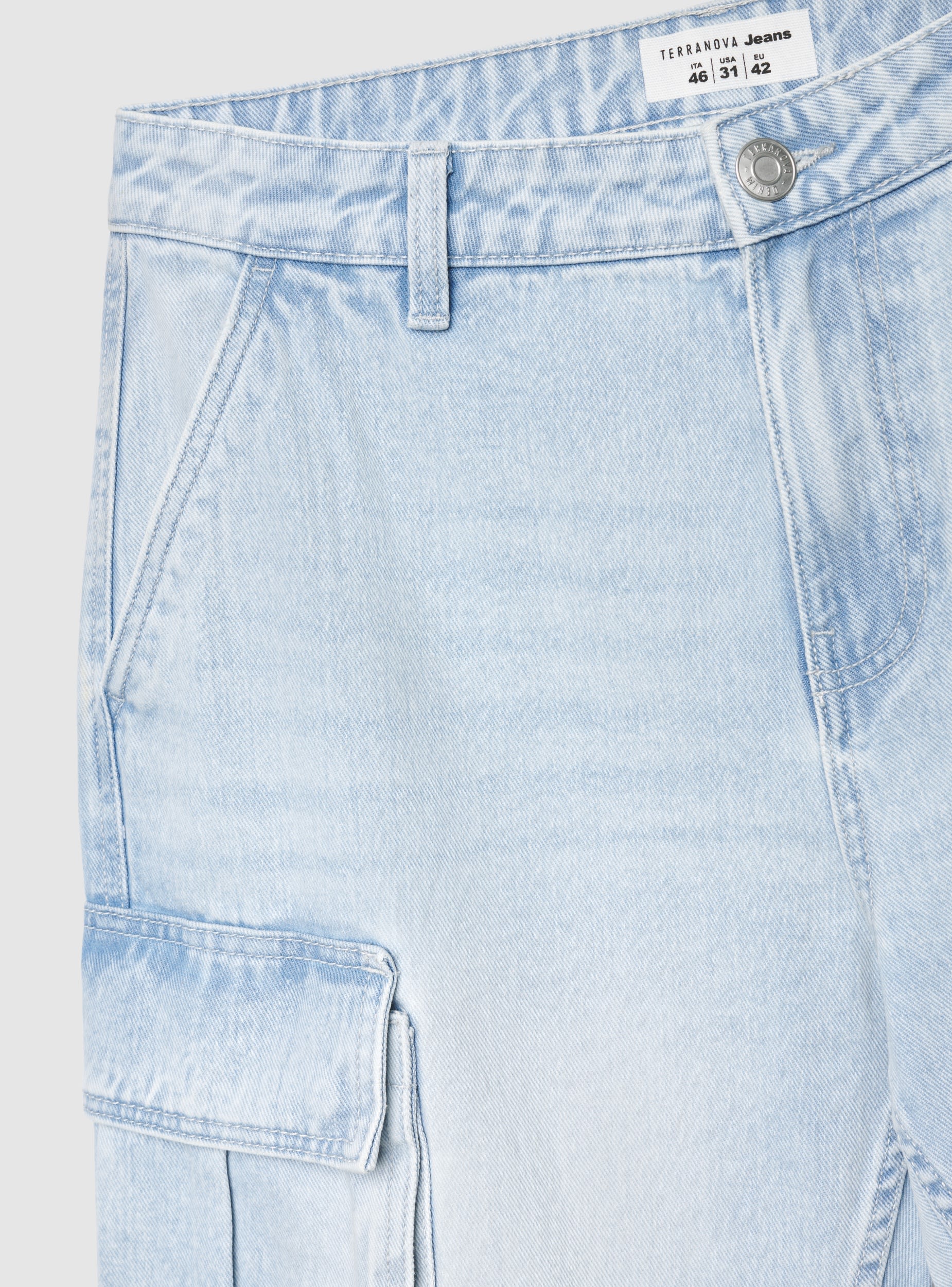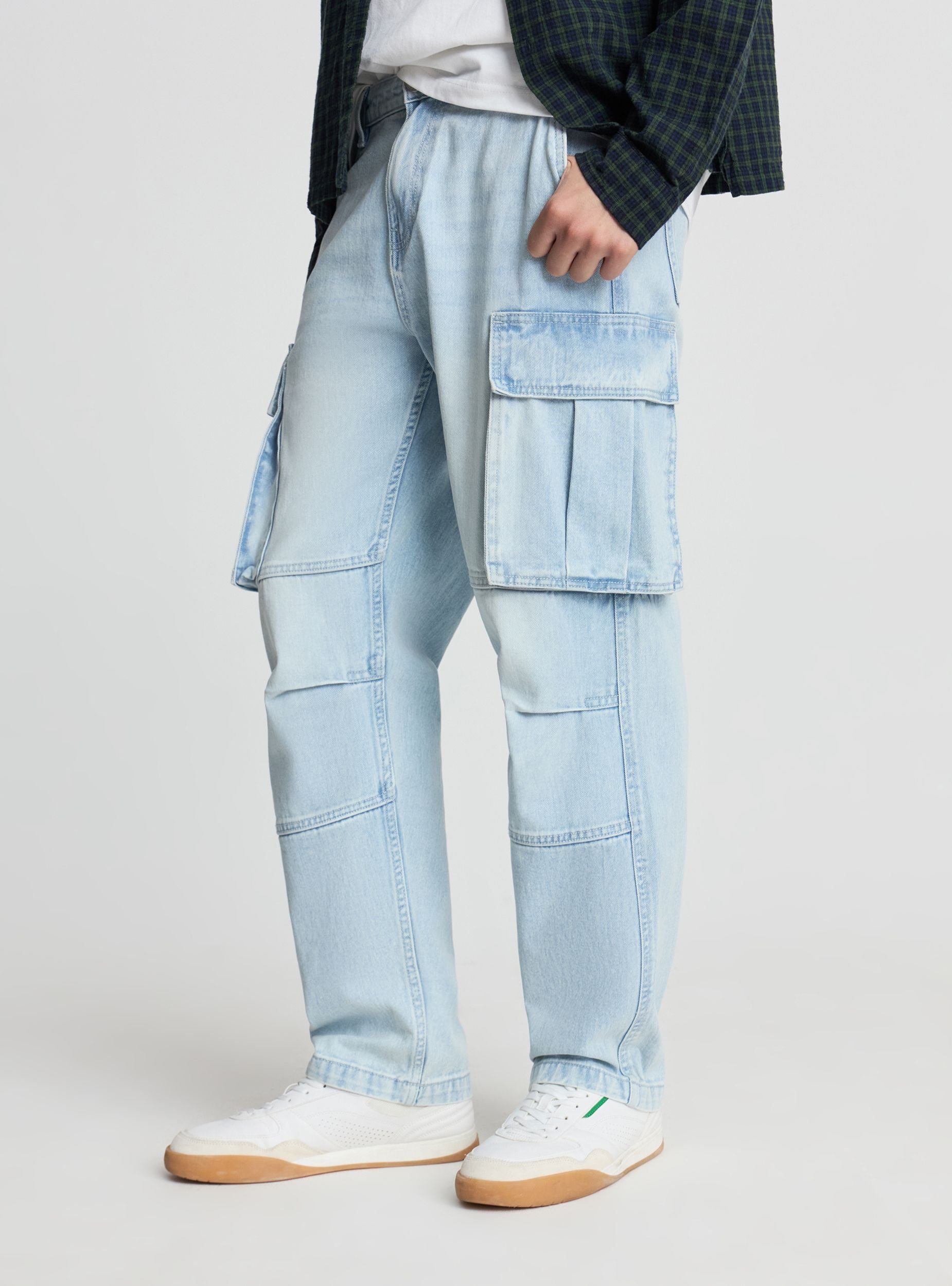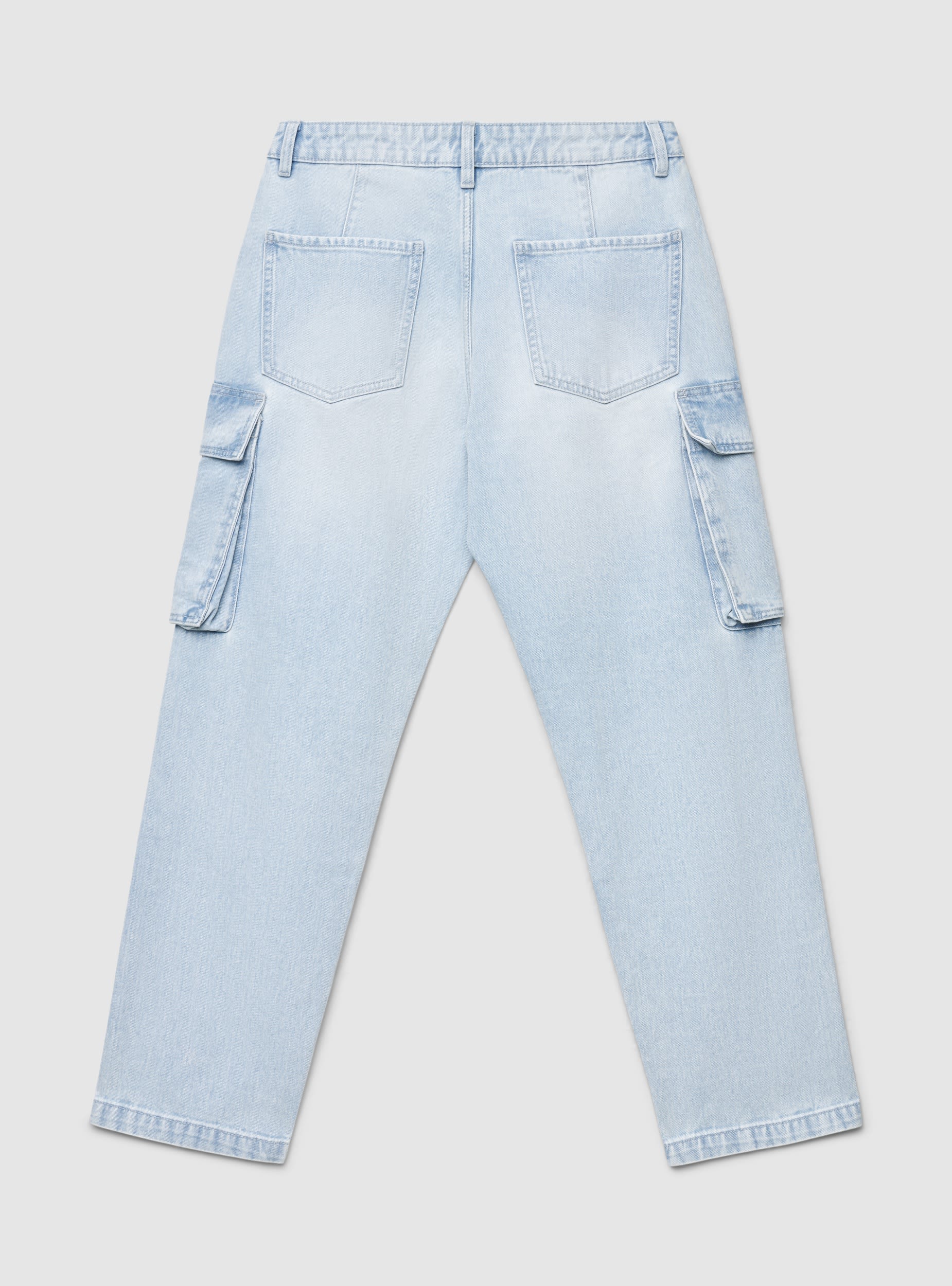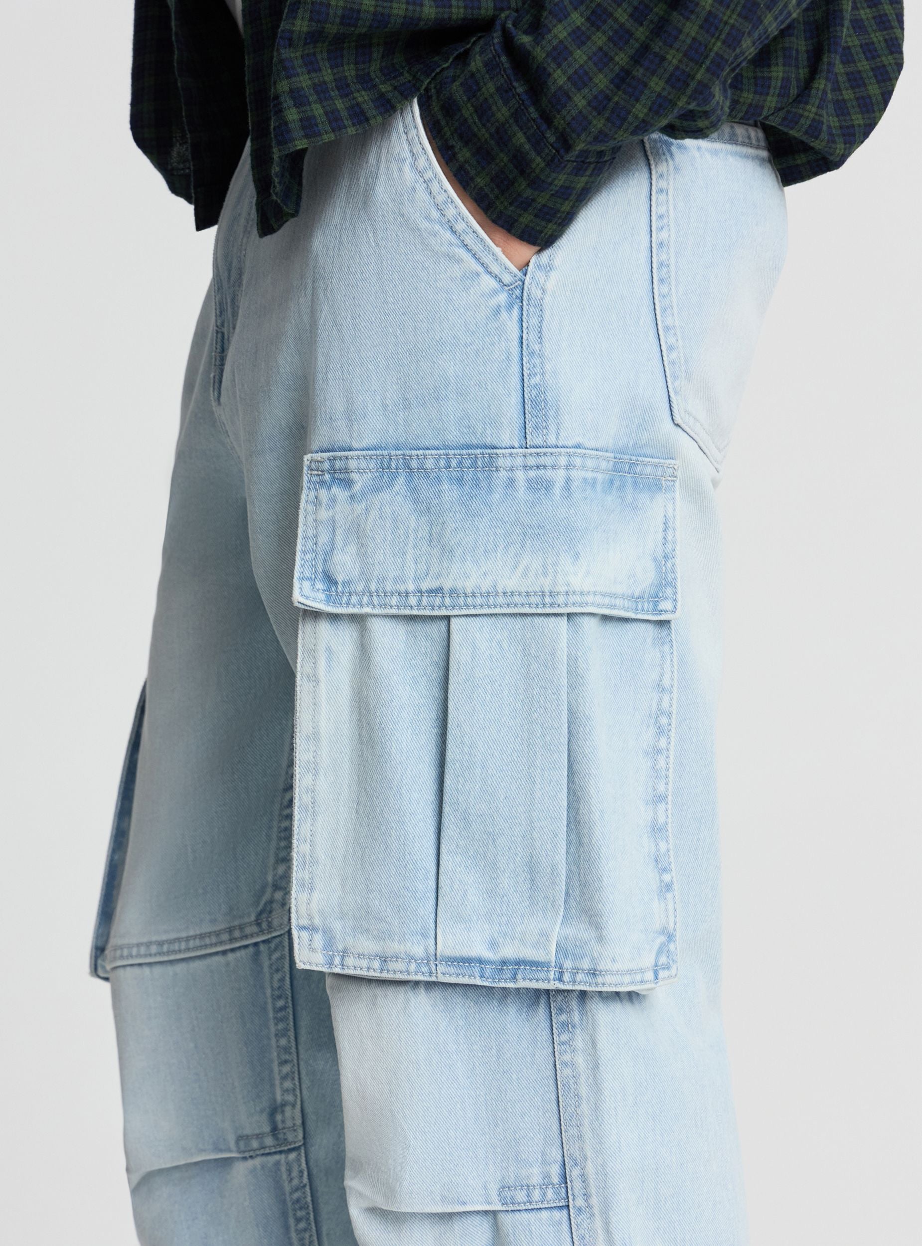 Jeans da uomo dal taglio oversize, perfetti per uno stile urbano. Modello cargo con chiusura con bottone e zip, passanti in vita. Lavaggio chiaro con effetto vissuto. Ideali con t-shirt e sneakers per il tempo libero o con felpa e anfibi per un look street.Dettagli
