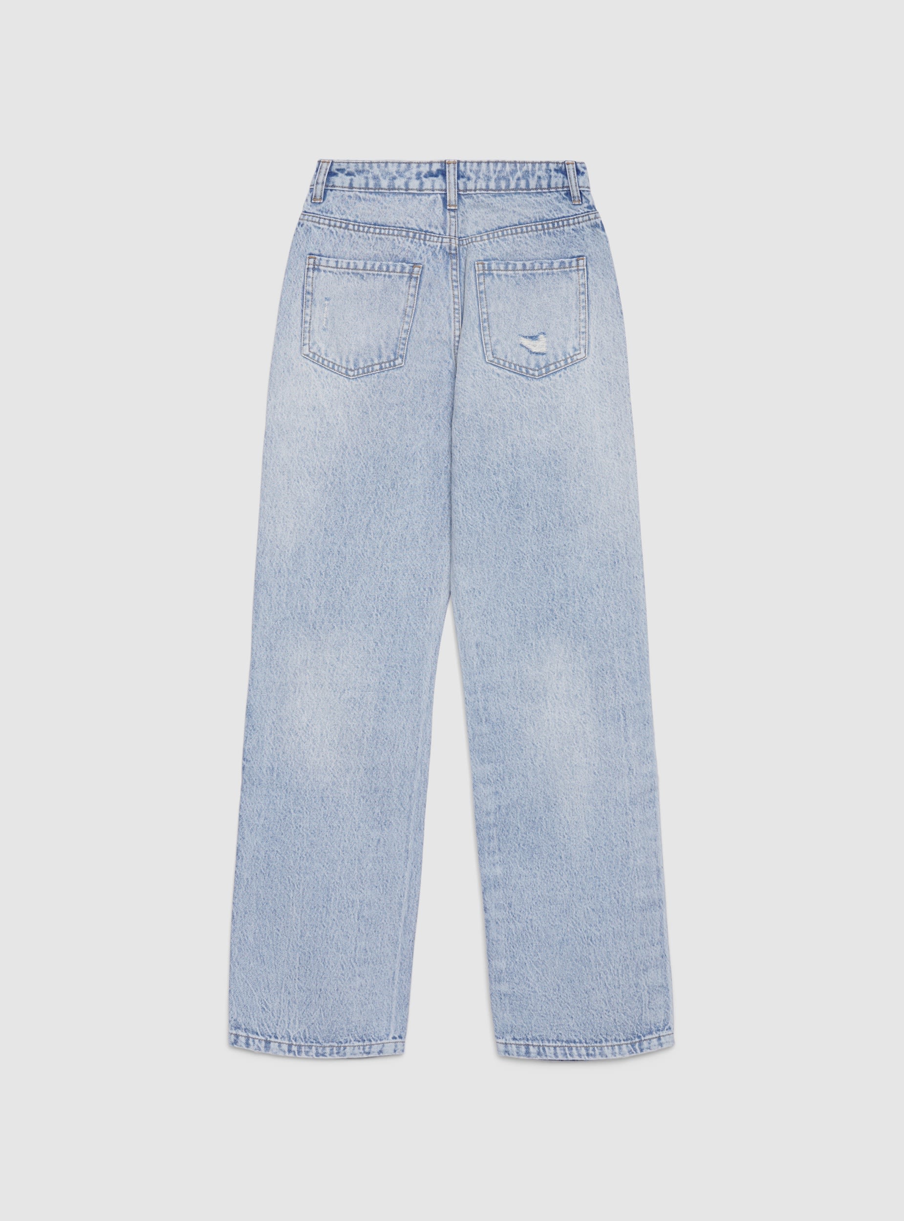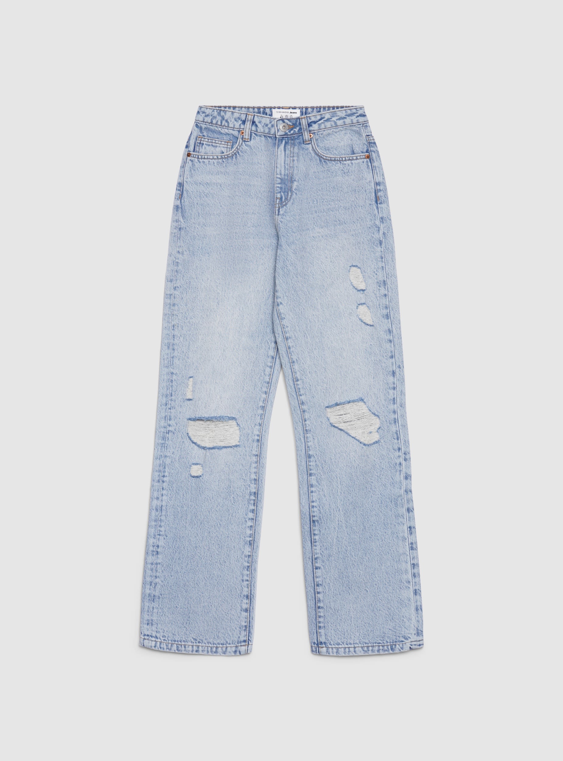 Jeans da donna a tinta unita con vestibilità regular e gamba dritta. Modello lungo con strappi frontali che donano un tocco grintoso. Chiusura con bottone e zip, passanti in vita e cinque tasche pratiche. Perfetti con maglietta e sneakers per il tempo libero, si abbinano anche a camicia e blazer per un look urbano curato.Dettagli