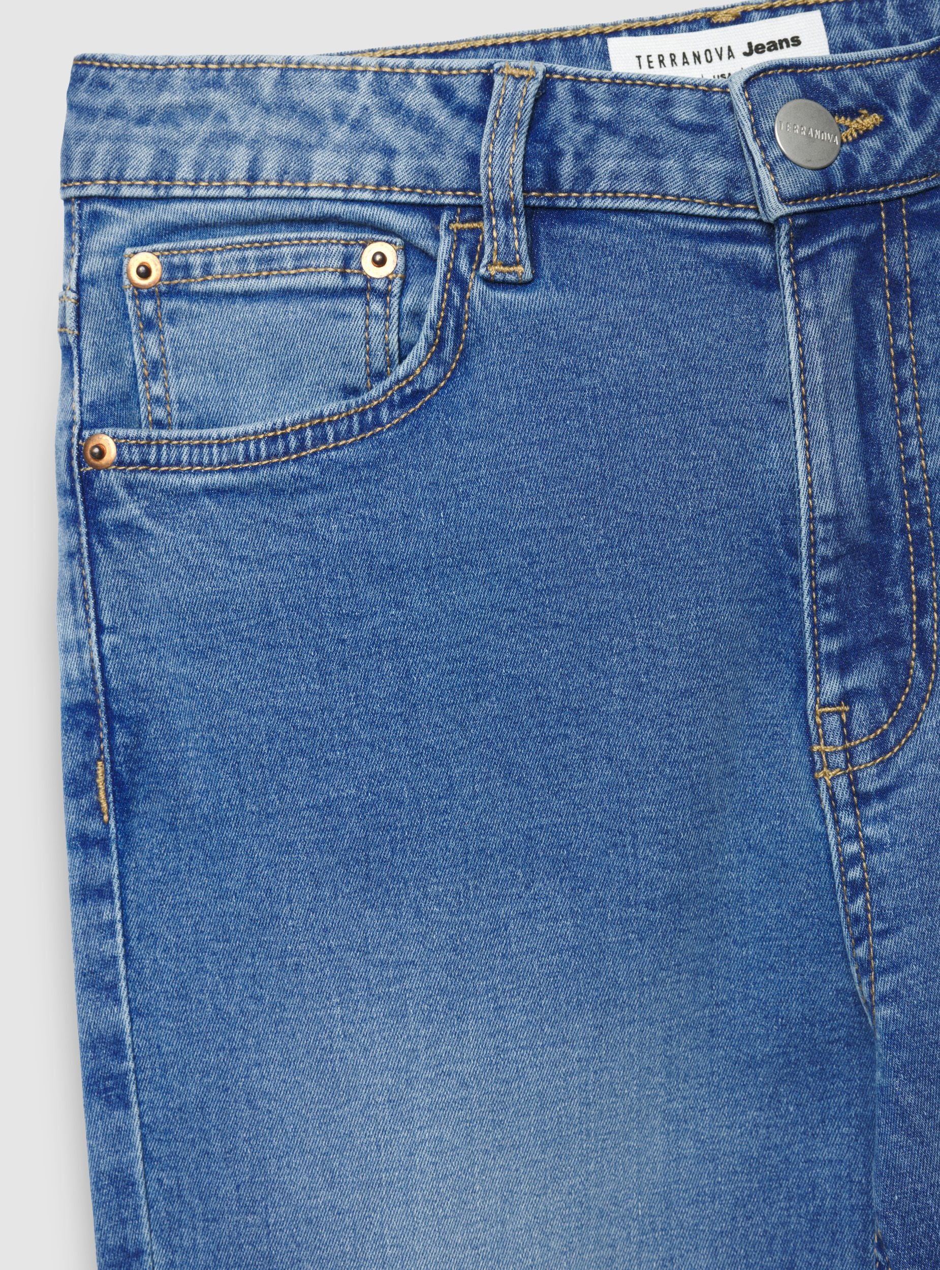 Jeans da donna con linea svasata e vita alta. Chiusura con bottone e zip, cinque tasche. Perfetti per outfit casual con maglietta e sneakers o per un tocco trendy con camicia e stivaletti. Vestibilità regolare che slancia la figura, lavaggio medio con leggere sfumature che valorizzano il design.Dettagli
