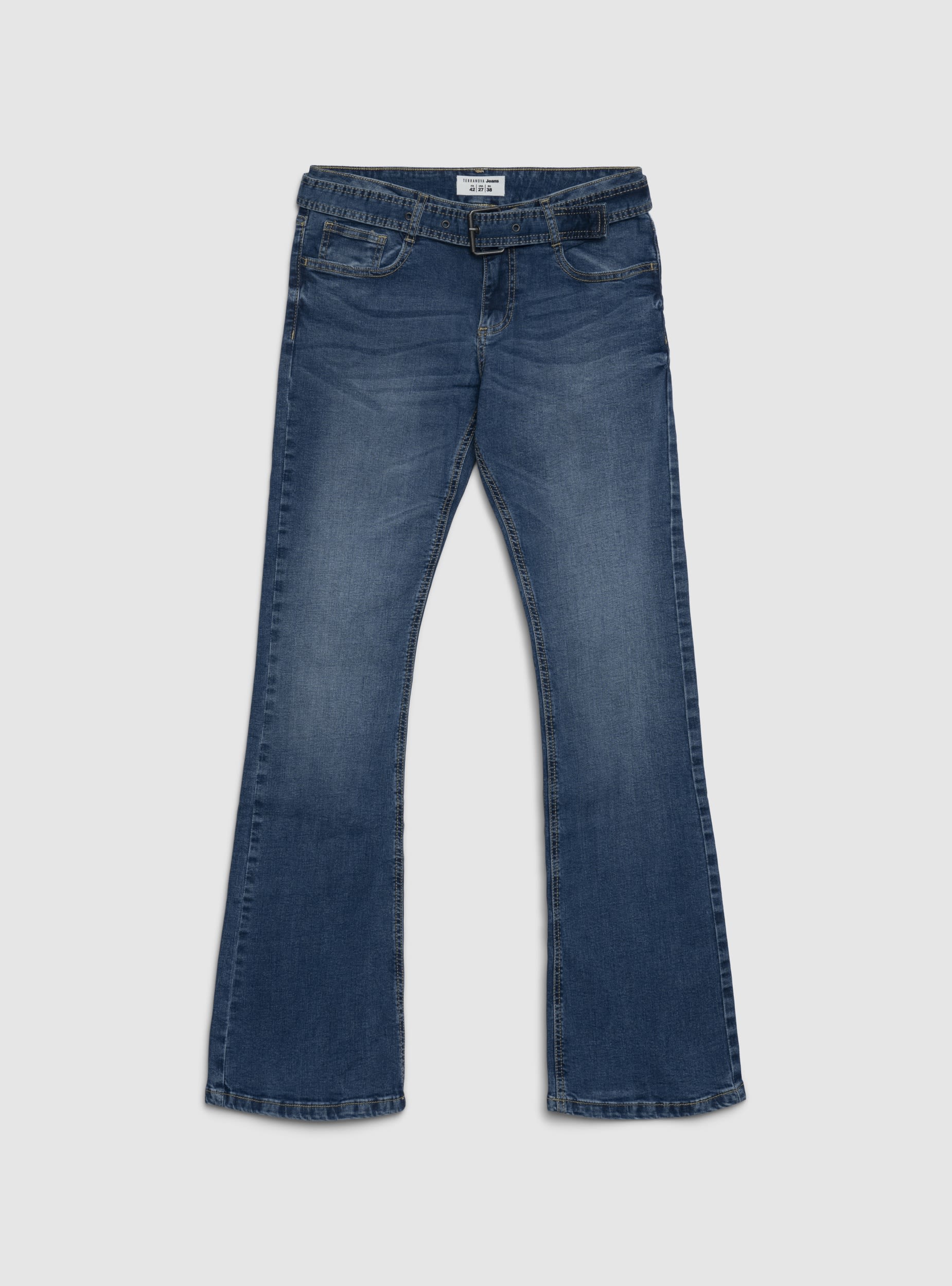 Jeans da donna a tinta unita con linea a zampa e cinta. Modello lungo con chiusura a bottone e zip, cinque tasche per praticità. Perfetti per look casual con maglietta e sneakers o per outfit più curati con camicia e stivaletti. Vestibilità regular che segue la figura senza stringere e cuciture visibili che valorizzano il design.Dettagli