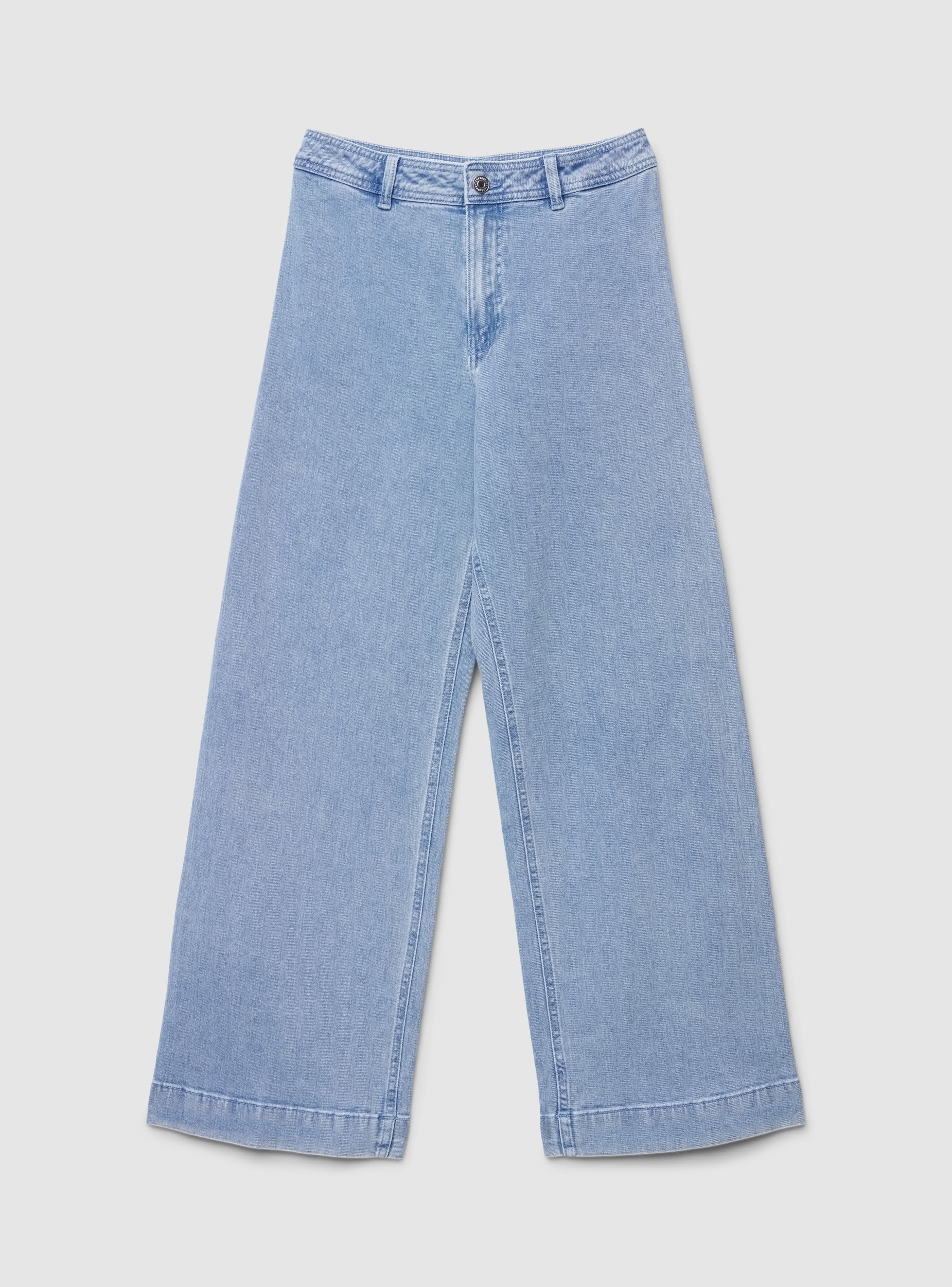 Jeans da donna con linea wide leg e lunghezza crop, perfetti per look casual e urbani. Modello a tinta unita con passanti in vita e chiusura frontale con bottone e zip. Il fit morbido valorizza la silhouette e si abbina bene a magliette aderenti o camicie over. Presenta tasche applicate sul retro e finitura dal lavaggio medio, ideale con sneakers o sandali per ogni giorno.Dettagli