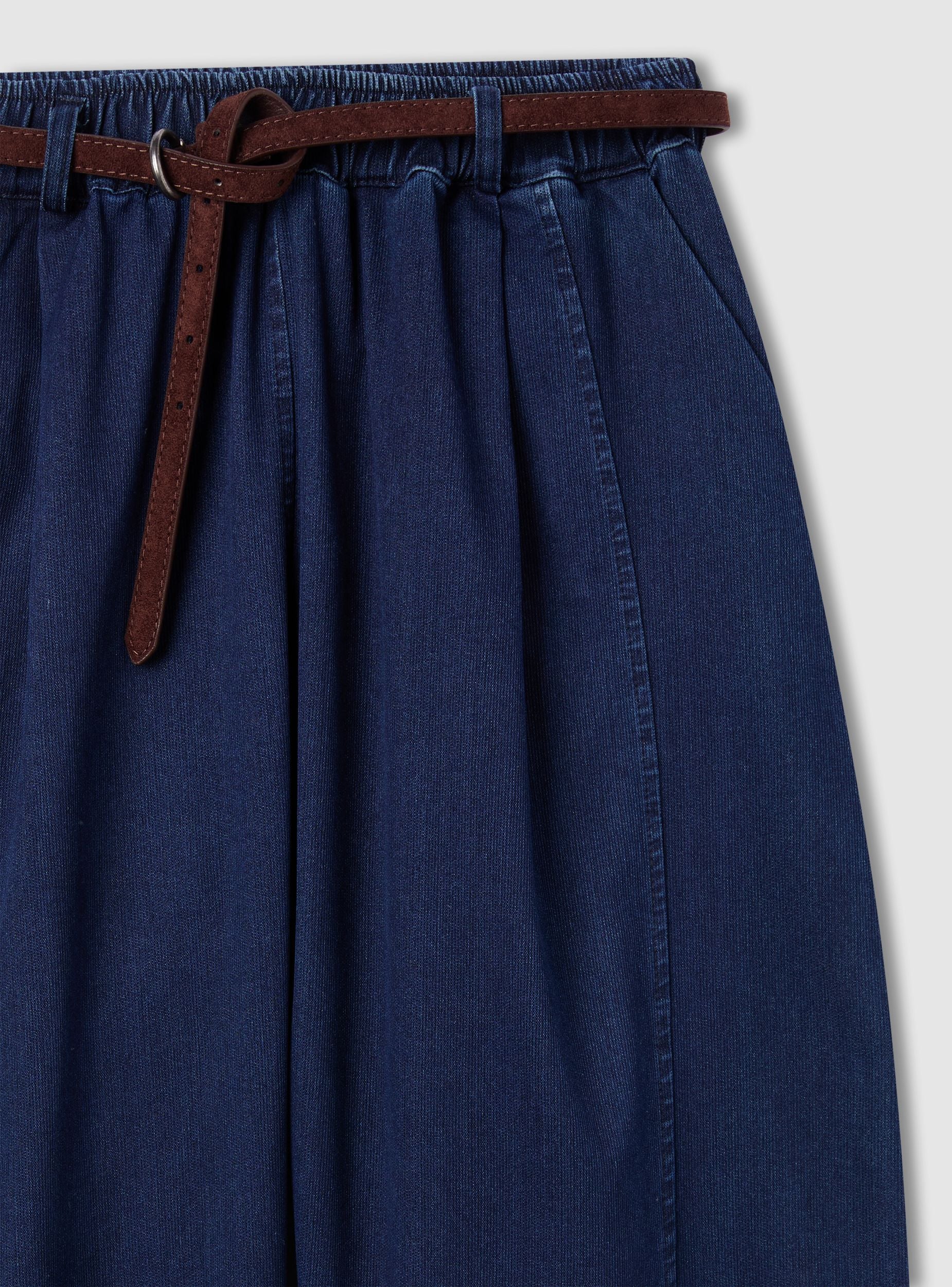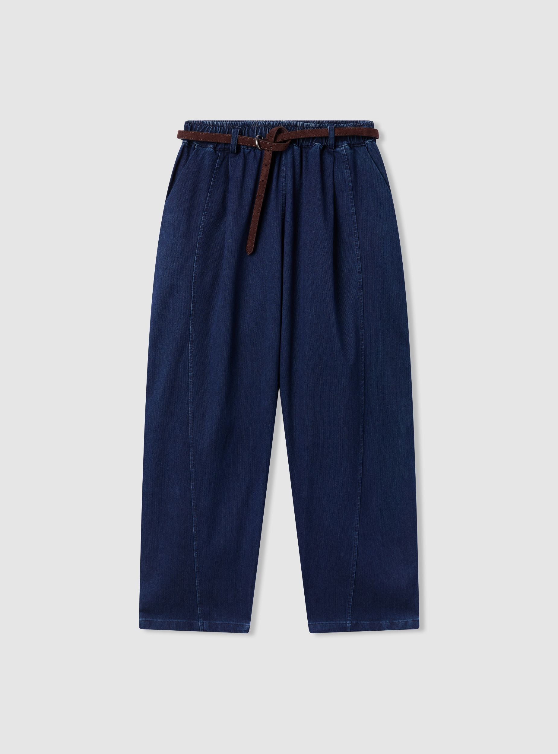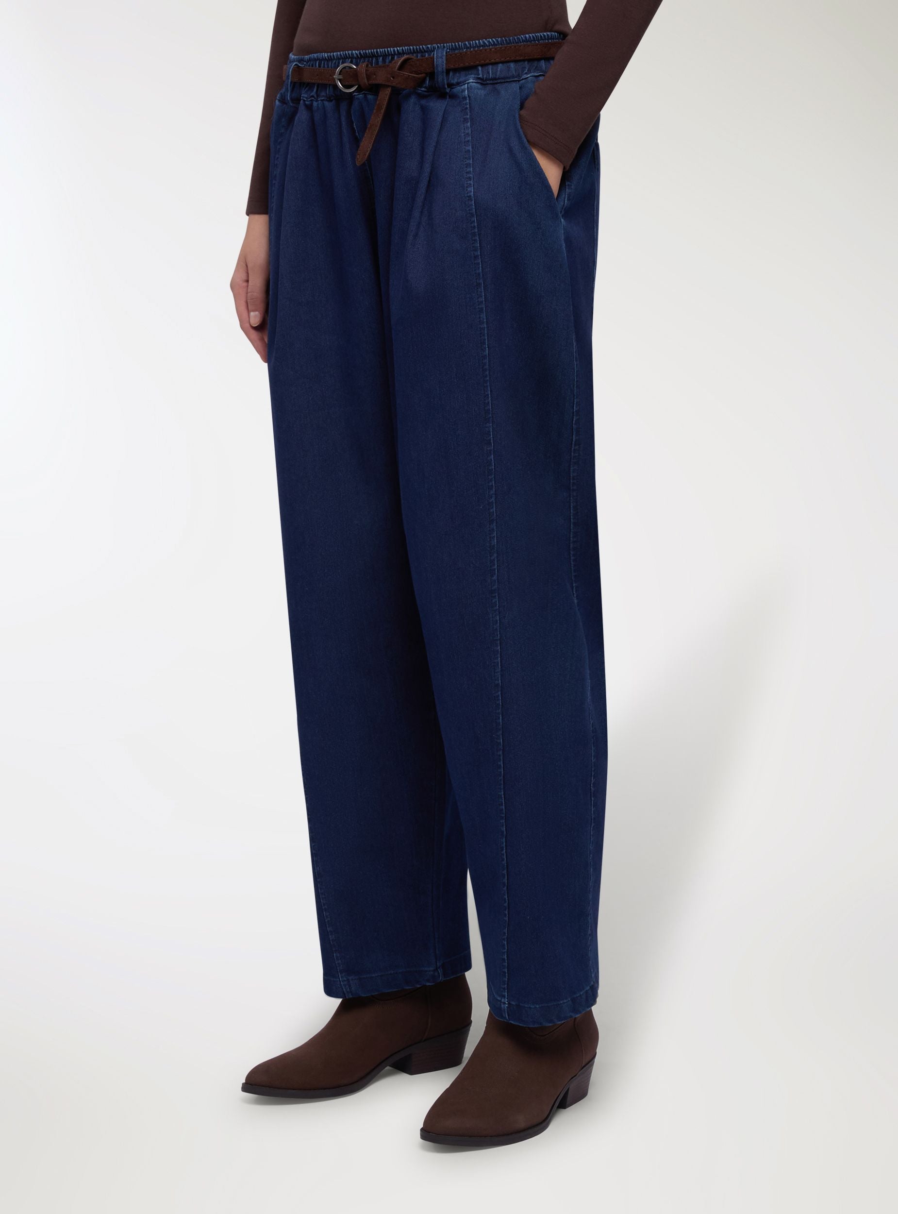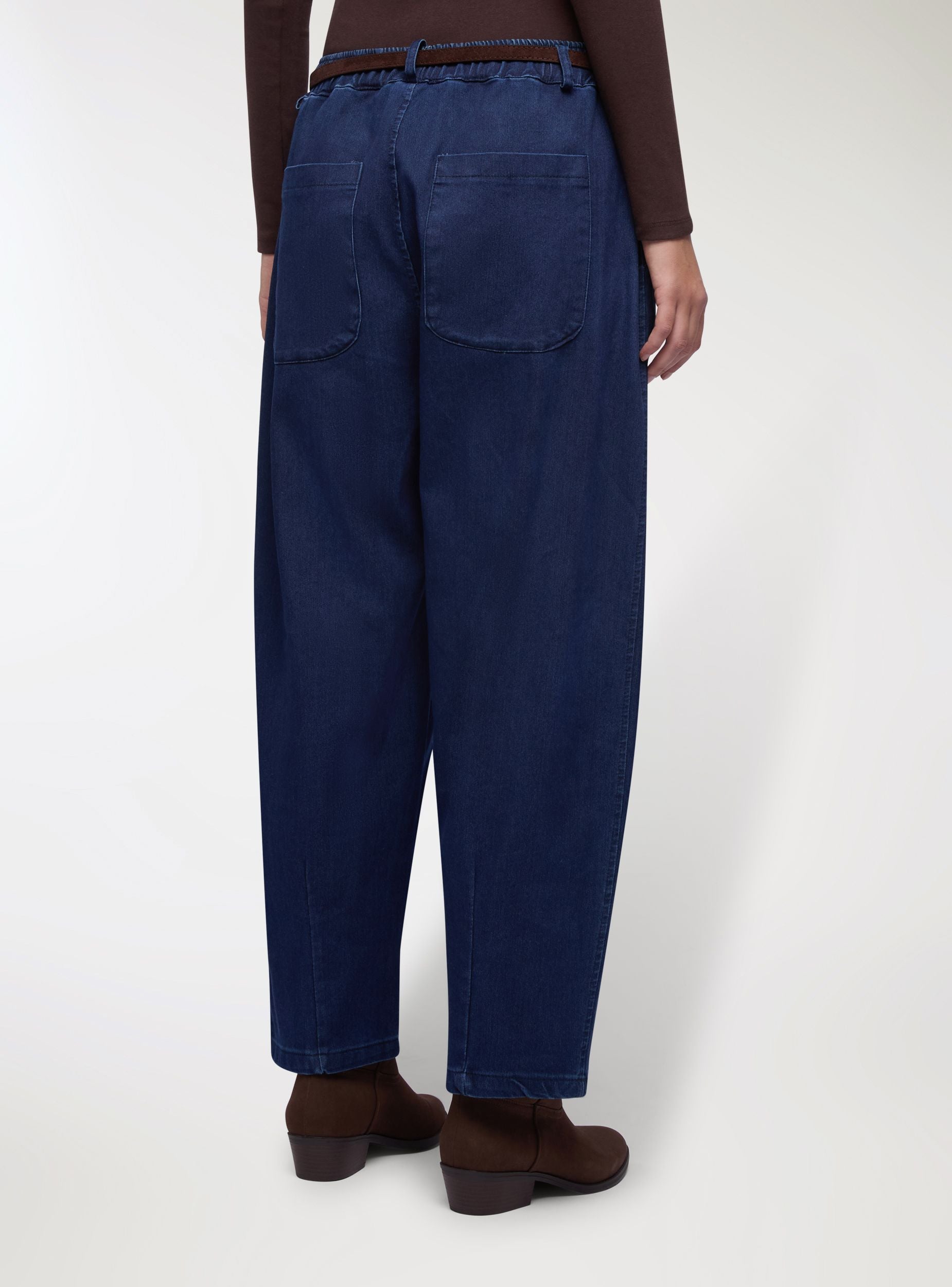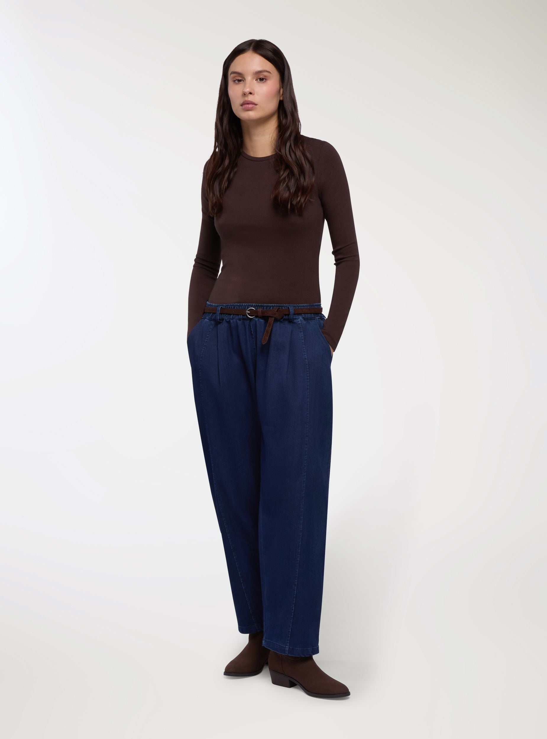 Jeans da donna a tinta unita con vita elasticizzata e cintura sottile regolabile. Linea balloon morbida e gamba dritta alla caviglia, ideale per look casual e urban. Tasche laterali e cuciture frontali sagomate valorizzano la vestibilità. Facili da abbinare a maglietta per il giorno o a una camicia per un tocco più curato.Dettagli