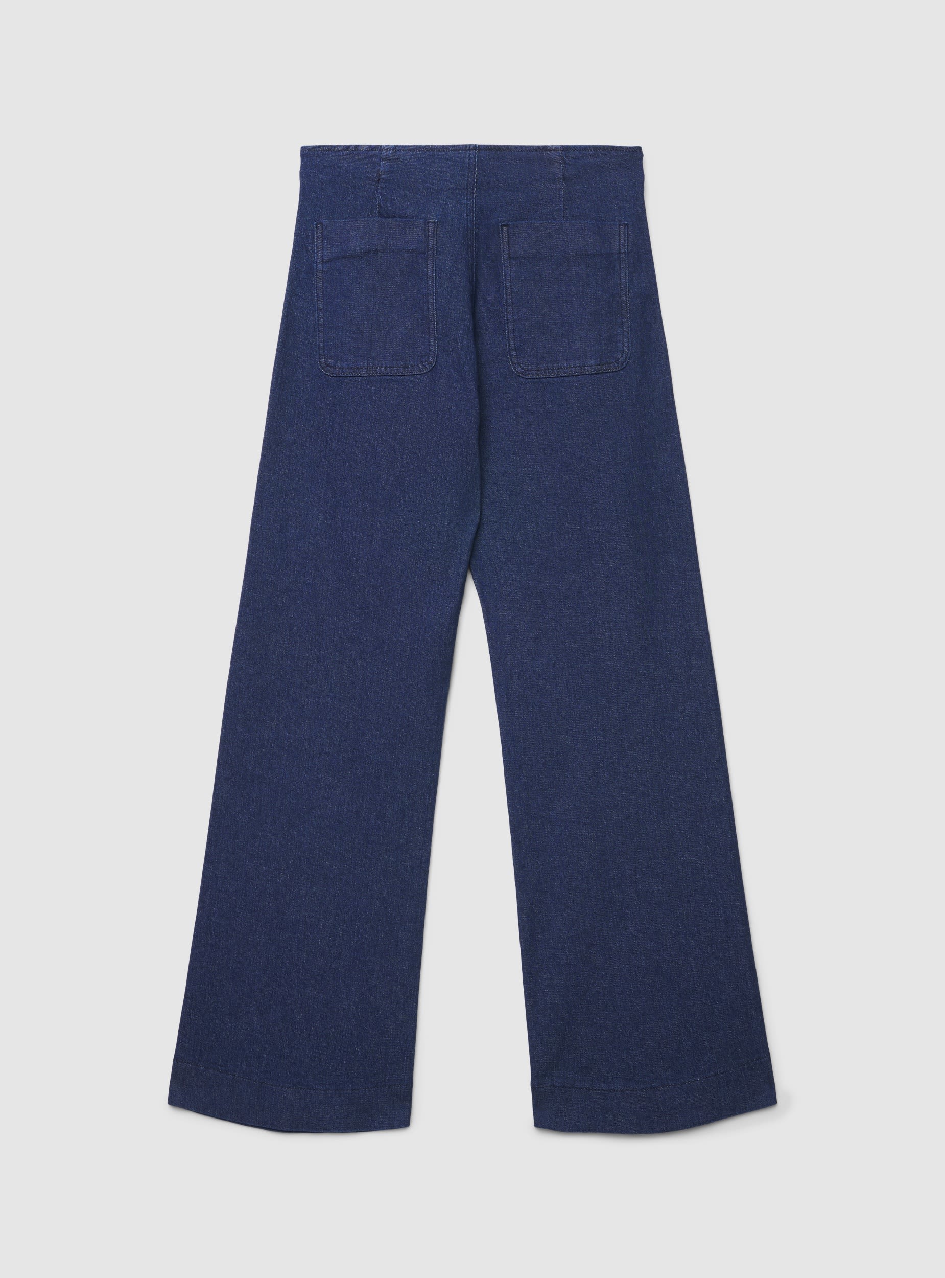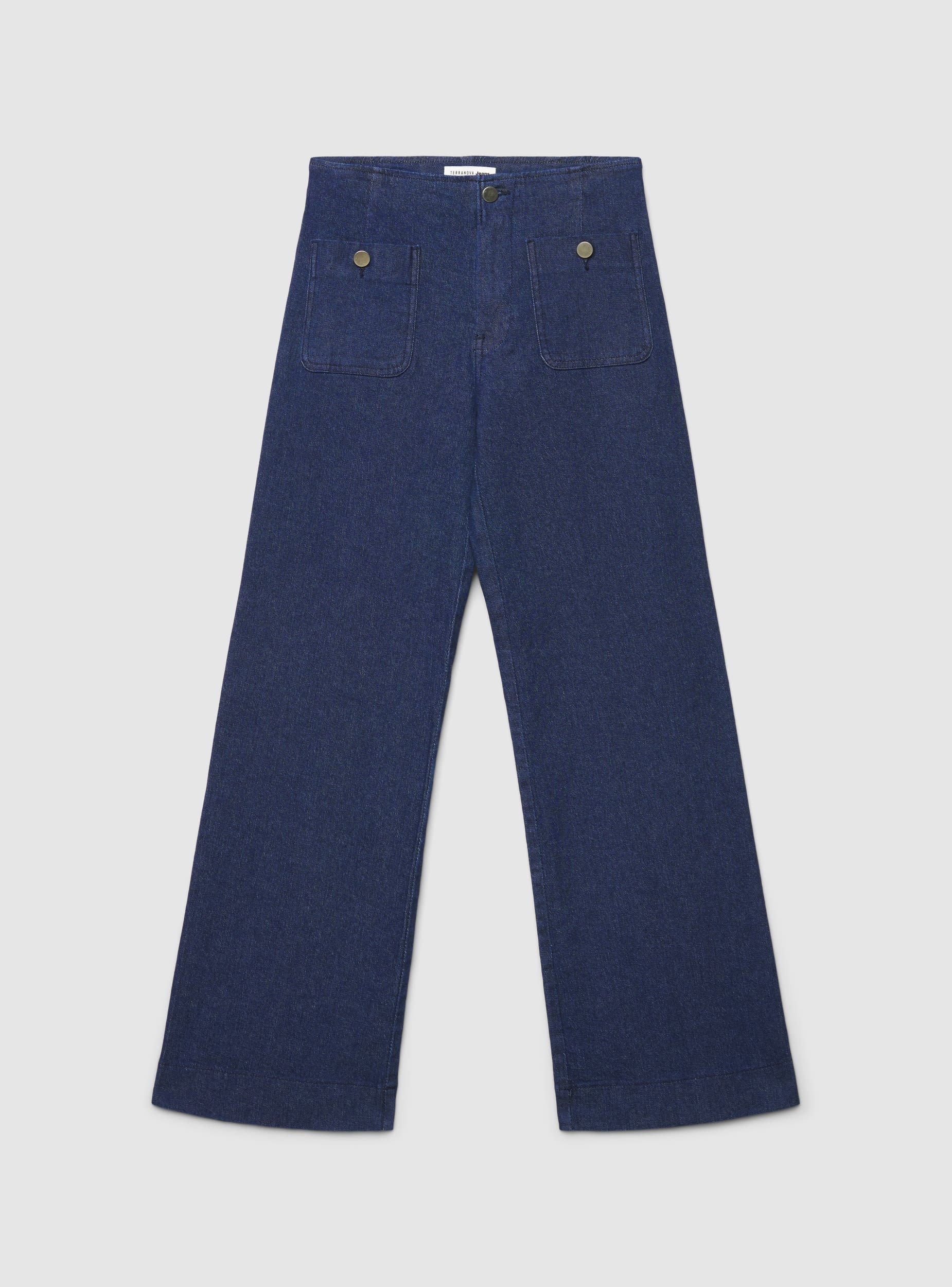 Jeans da donna a tinta unita con gamba ampia e taglio lungo. Vita media e chiusura con bottone e zip sul davanti. Presenta tasche applicate frontali con botton, perfette per un tocco utilitario. Versatili per l’ufficio con camicia o per il tempo libero con maglietta e sneakers. Vestibilità comoda sui fianchi e linea dritta che slancia la figura.Dettagli