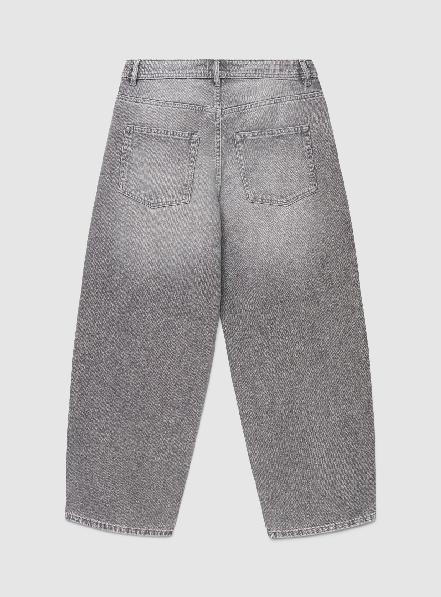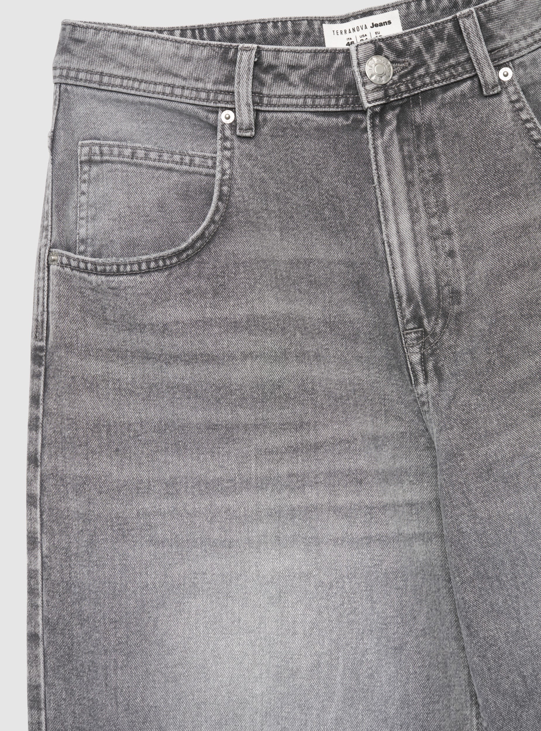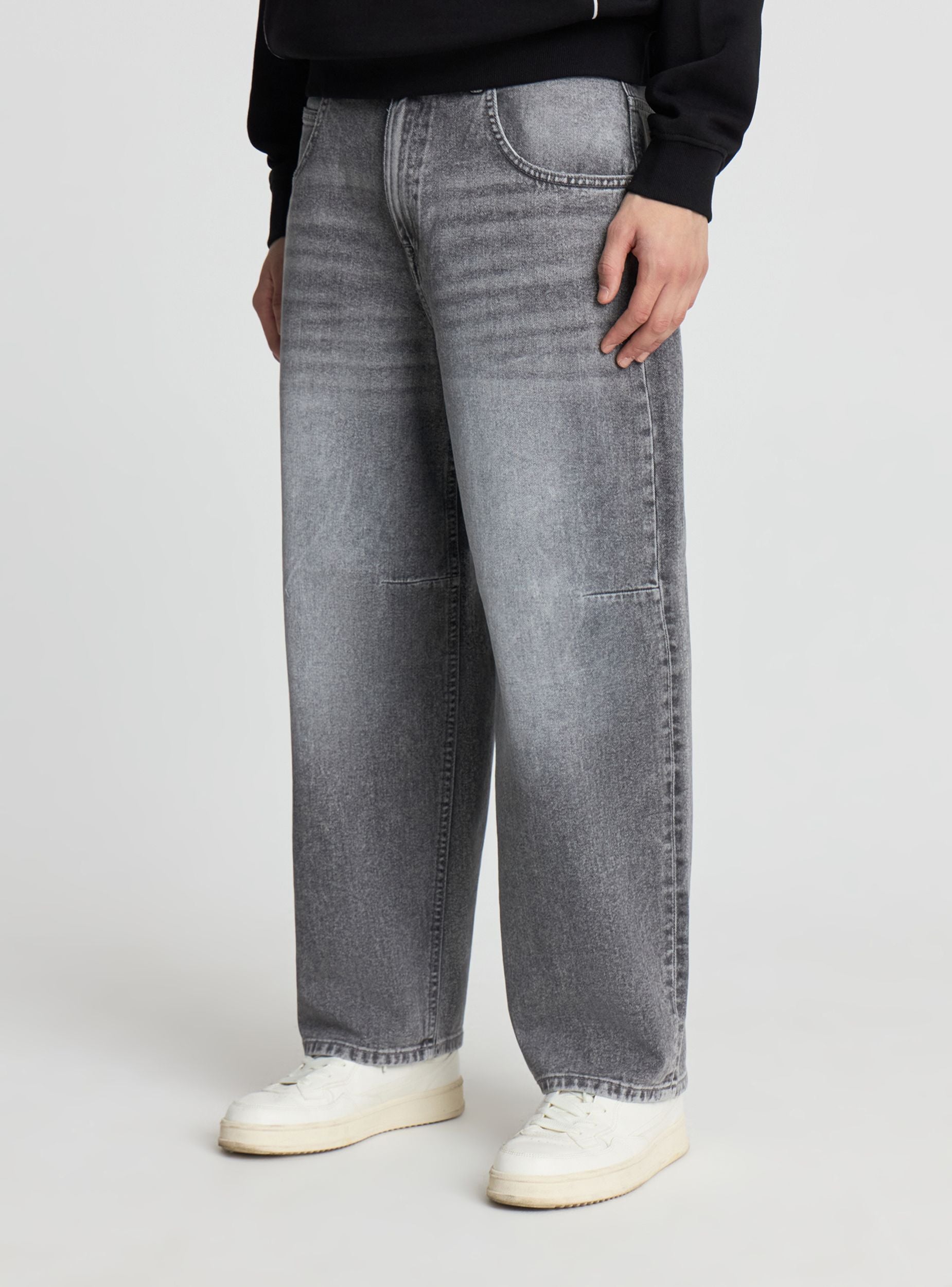 Jeans da uomo in tinta unita con vestibilità ampia e gamba larga, perfetti per look casual e urban. Vita media con chiusura a bottone e zip, passanti per cintura e tasche a cinque classiche. Lavaggio grigio con effetto acidato che dona un tocco vissuto, ideale con felpe e sneakers o con camicie per outfit rilassati. Lunghezza alla caviglia e cuciture marcate per un design essenziale e versatile.Dettagli