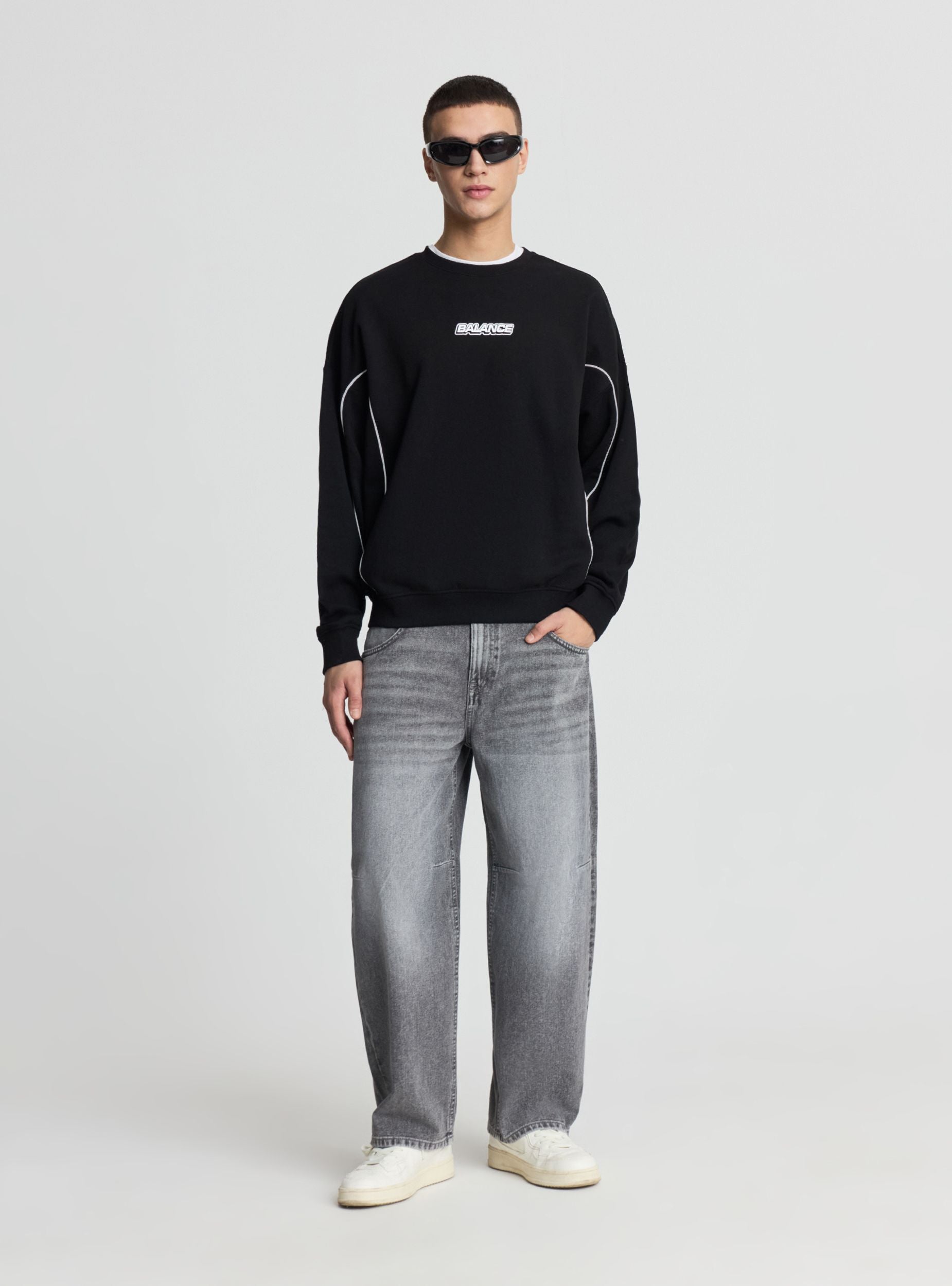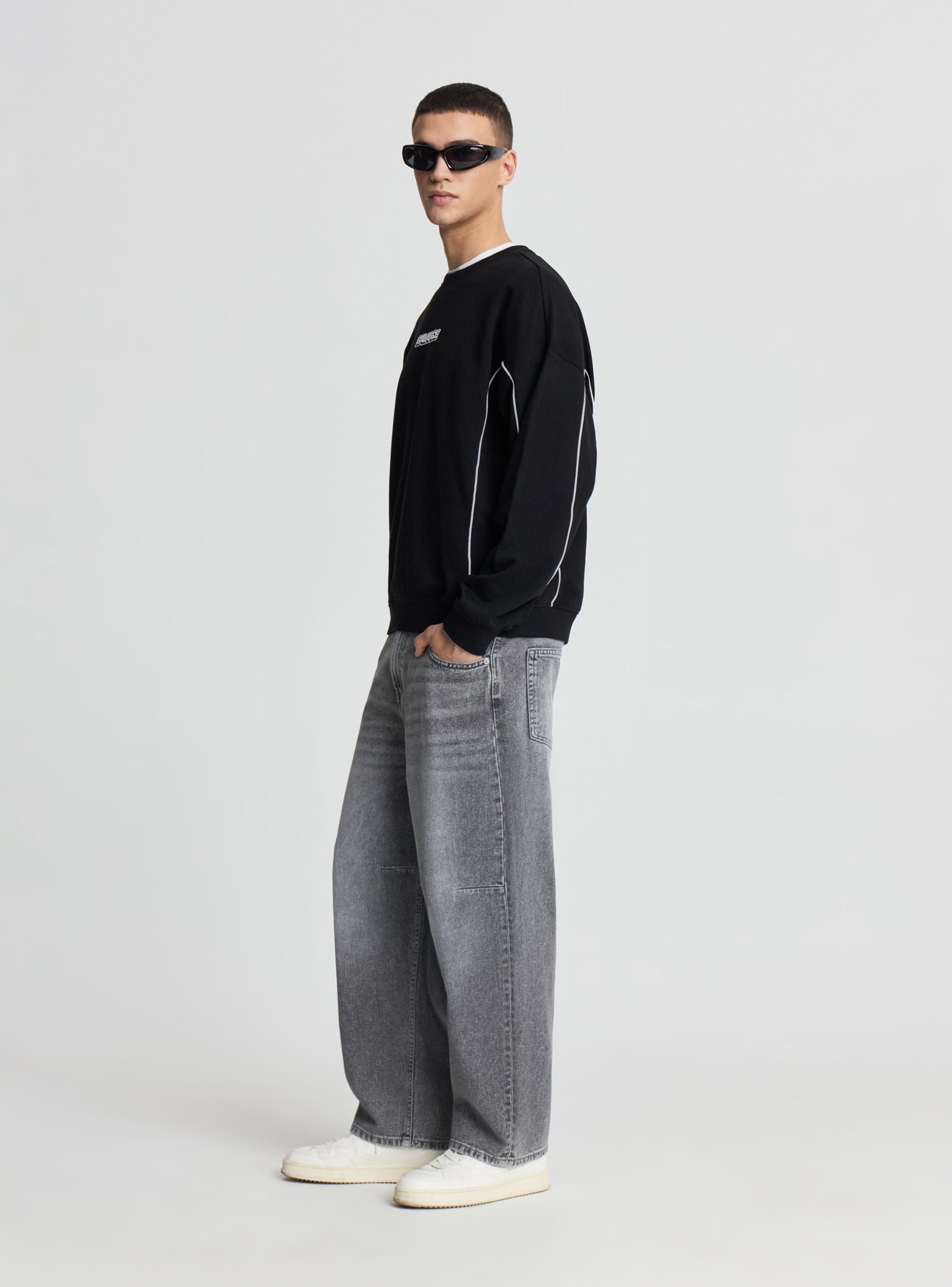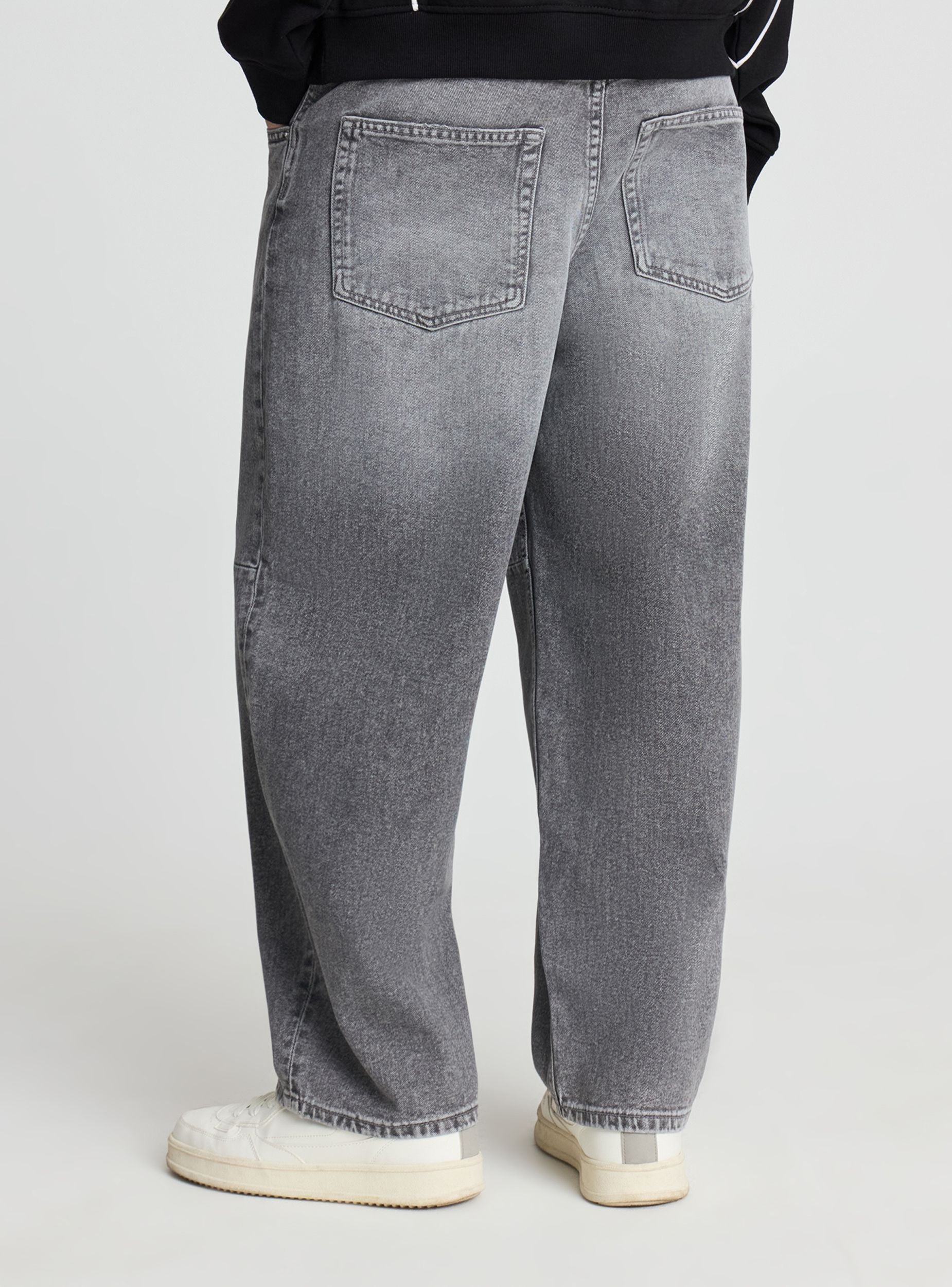 Jeans da uomo in tinta unita con vestibilità ampia e gamba larga, perfetti per look casual e urban. Vita media con chiusura a bottone e zip, passanti per cintura e tasche a cinque classiche. Lavaggio grigio con effetto acidato che dona un tocco vissuto, ideale con felpe e sneakers o con camicie per outfit rilassati. Lunghezza alla caviglia e cuciture marcate per un design essenziale e versatile.Dettagli