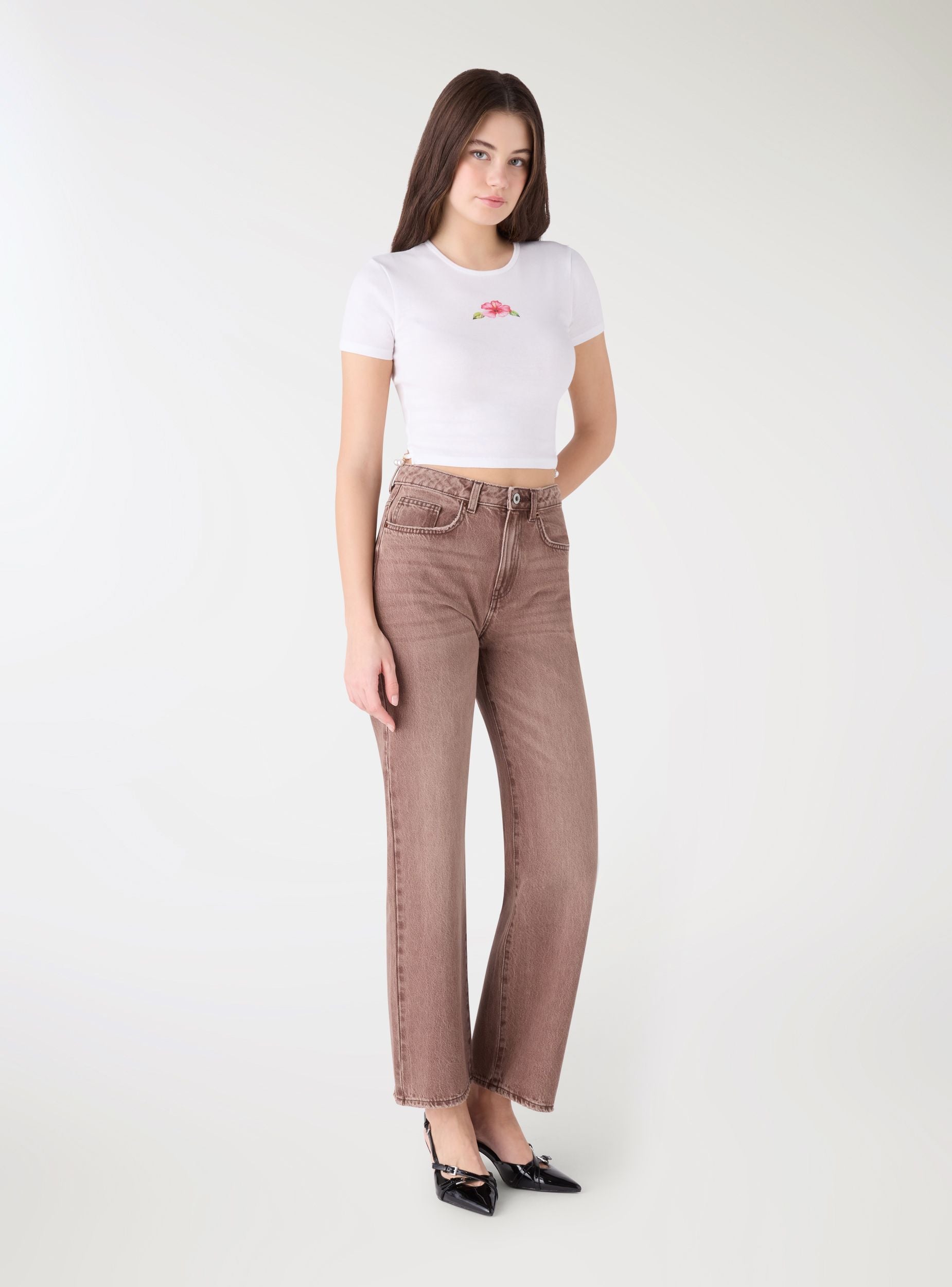Jeans da donna a tinta unita con linea straight e gamba lunga. Vita media con passanti e chiusura con bottone e zip, ideale per look quotidiani urban. Cinque tasche con taschino frontale e tasche posteriori applicate. Lavaggio medio con effetto vissuto che valorizza il design. Versatili con maglietta e sneakers o con camicia e blazer per un tocco casual curato.Dettagli